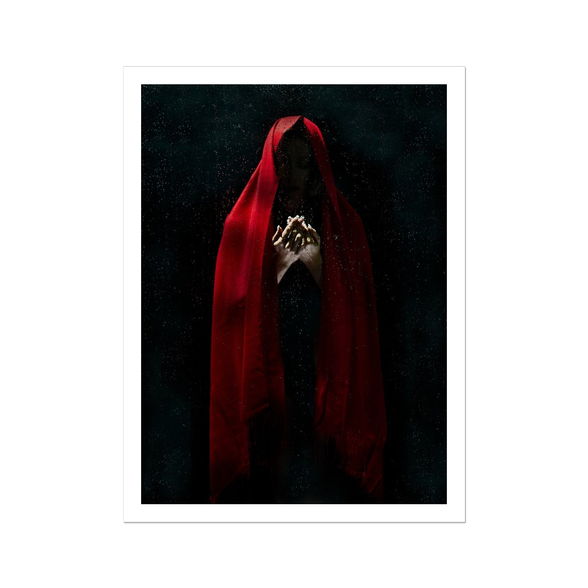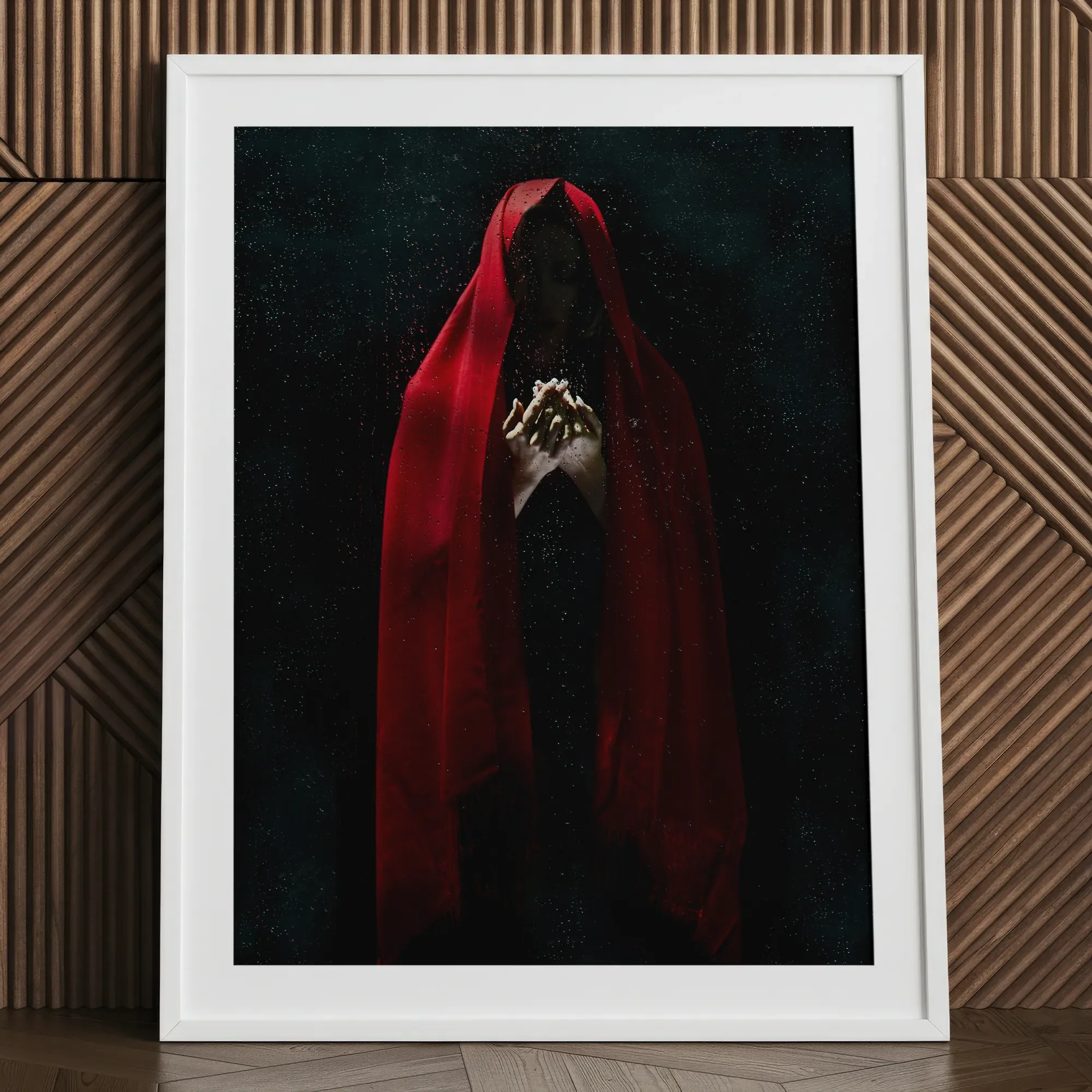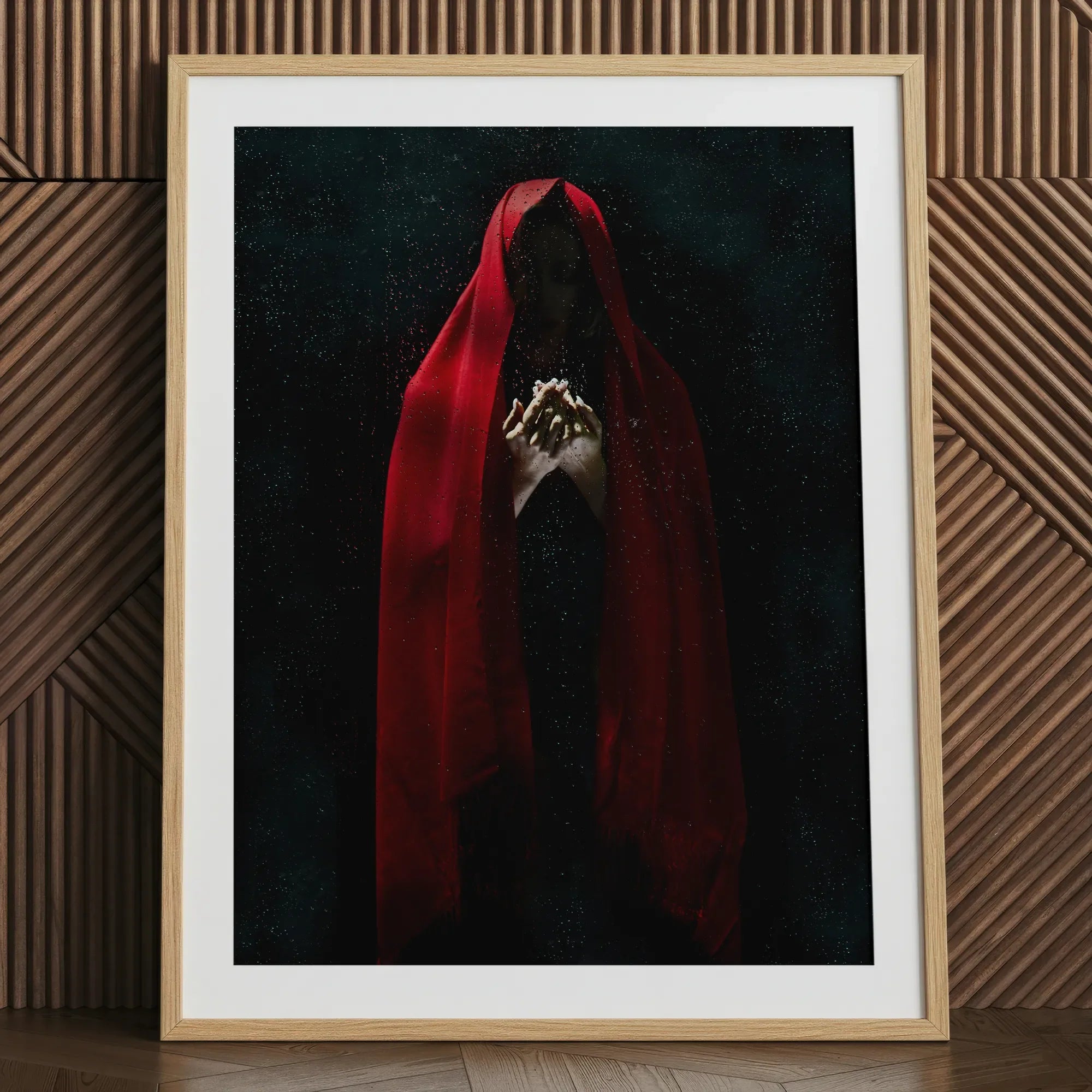 A crimson mantle catches the dim light, its folds gathering the weight of centuries. The witch stands within that hush of shadow and vermilion, the air thick as candle smoke. Behind the sheen of glass, her reflection multiplies—a veil between worlds, neither mirror nor window.