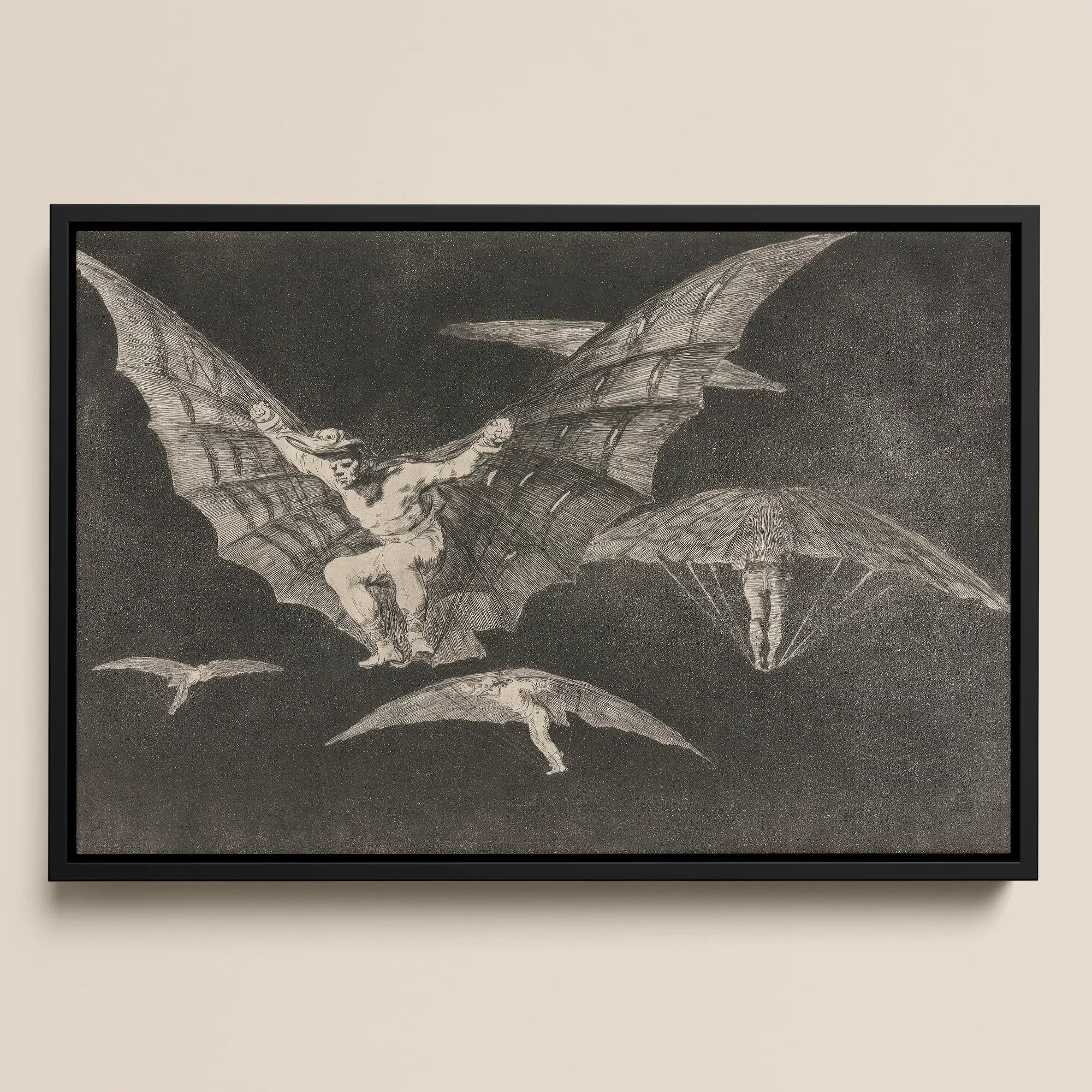 Die Menschheit erhebt sich nicht durch Anmut, sondern durch hartnäckige Erfindung. Goyas Radierung verspottet den Glauben an den Fortschritt, während sie dessen Wagemut bewundert. Männer schnallen sich Flügel an ihre Körper und stürzen sich in die Dunkelheit unter der Illusion der Beherrschung.