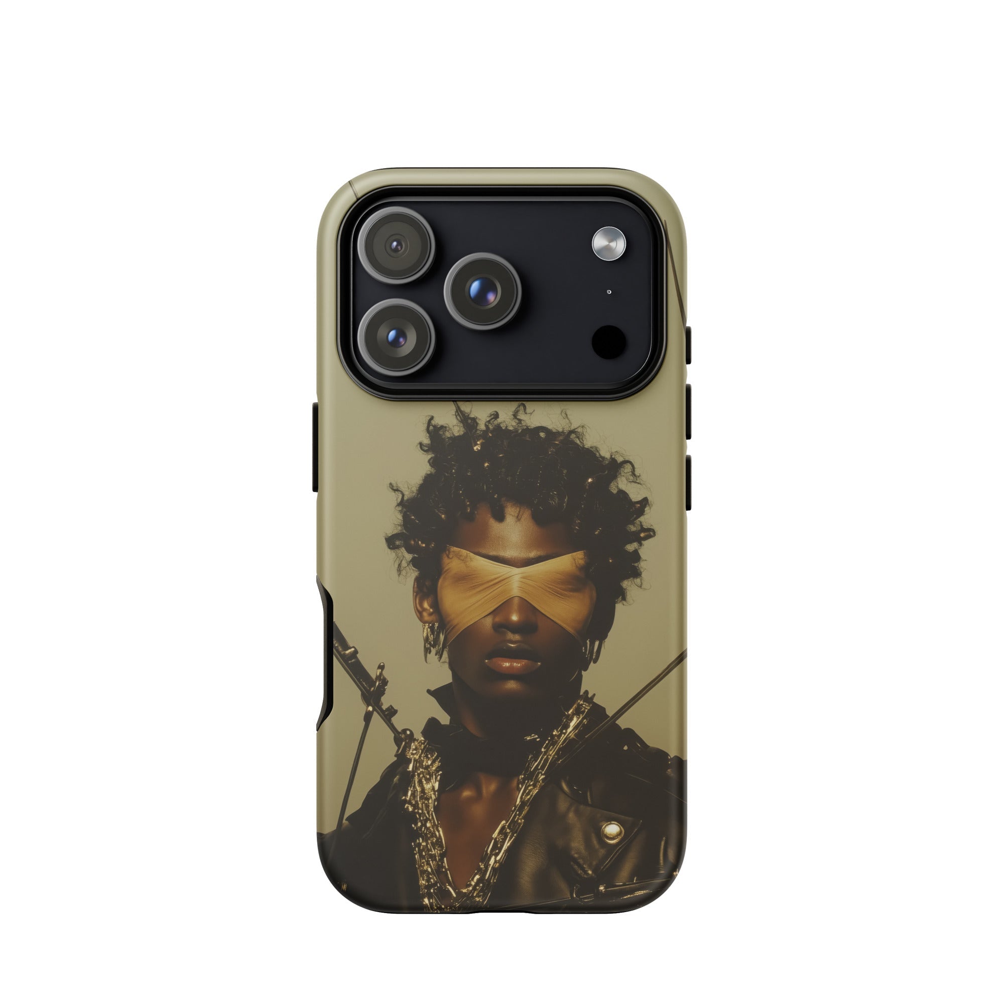 Seine gesetzlosen Visionen gedeihen auf Stil als Gegenwaffe. Er trägt eine Augenbinde wie Blackout-Zonen im Datenstrom. Es ist ockerfarbene Seide, die Farbe von zurückgehaltenem Zeugnis und Sexclub-Bodenlicht. Eng über den Augen, als hätte ihn jemand herausgefordert, eine neue Art von Gerechtigkeit zu schaffen—eine, die nicht verfolgt oder archiviert werden kann.