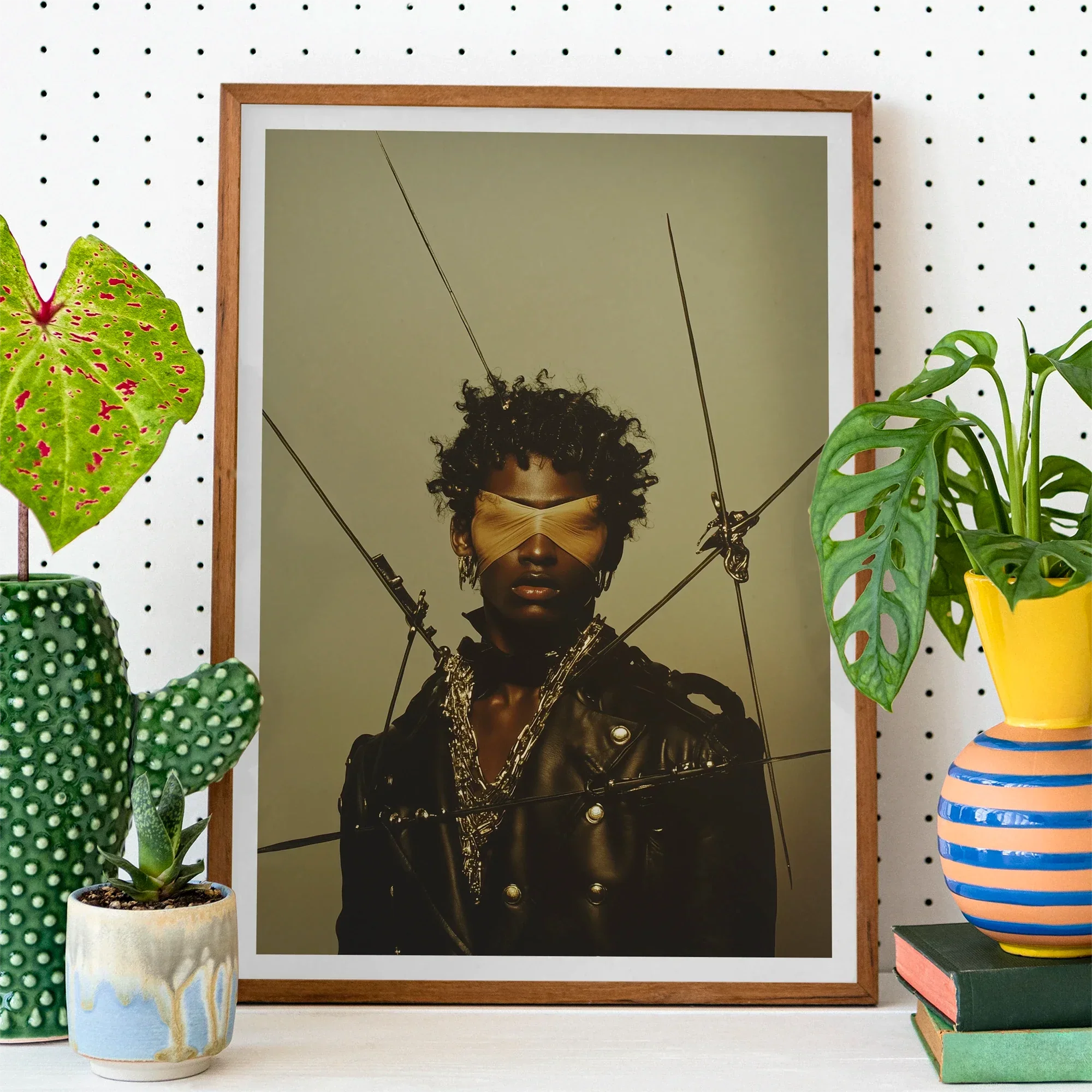 Der Hintergrund? Schweigende Stille. Abstrakte Hitze. Luft, dick mit unerledigten Angelegenheiten. Die Komposition blutet Tom of Finland durch Essex Hemphill—Leder-Surrealismus, unverblümt schwarz, schwul wie Rauchschwaden aus Holzkohle, aber hart wie queere Lustprophezeiungen.