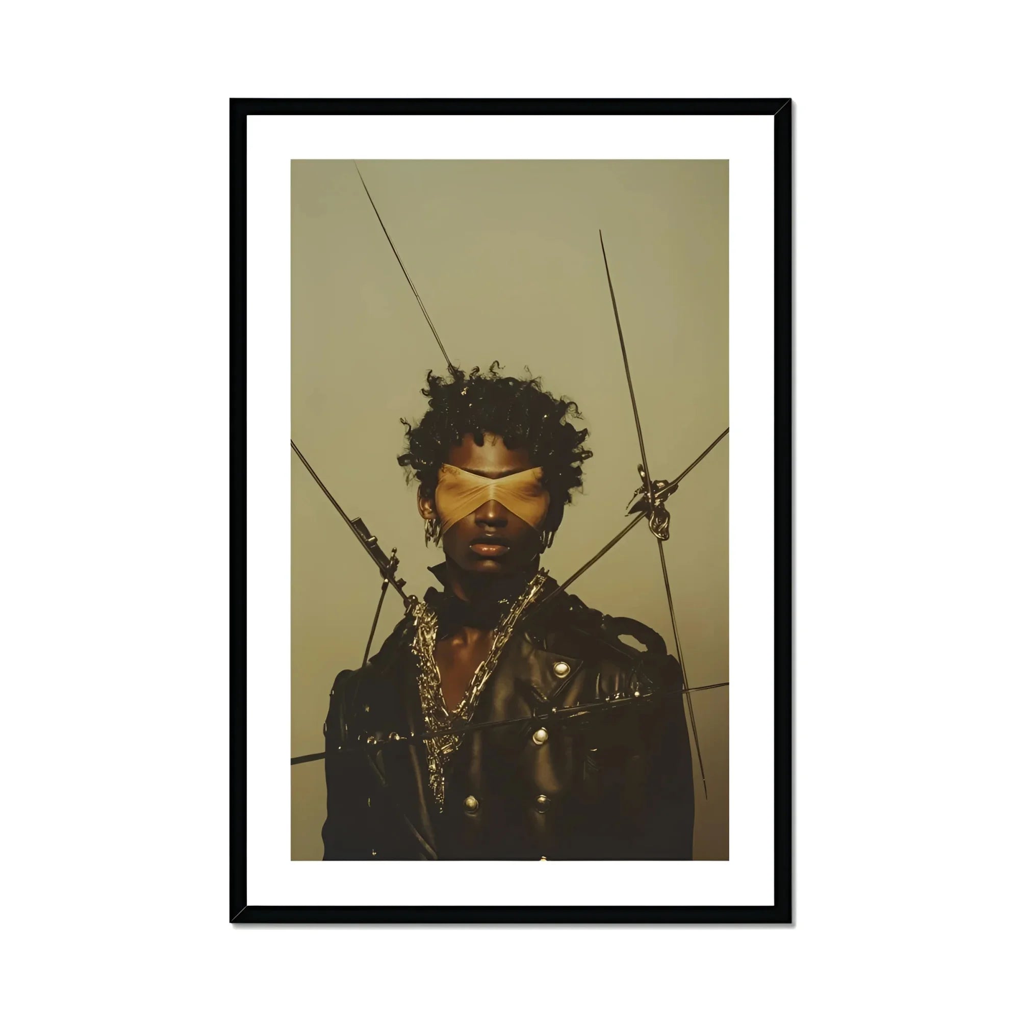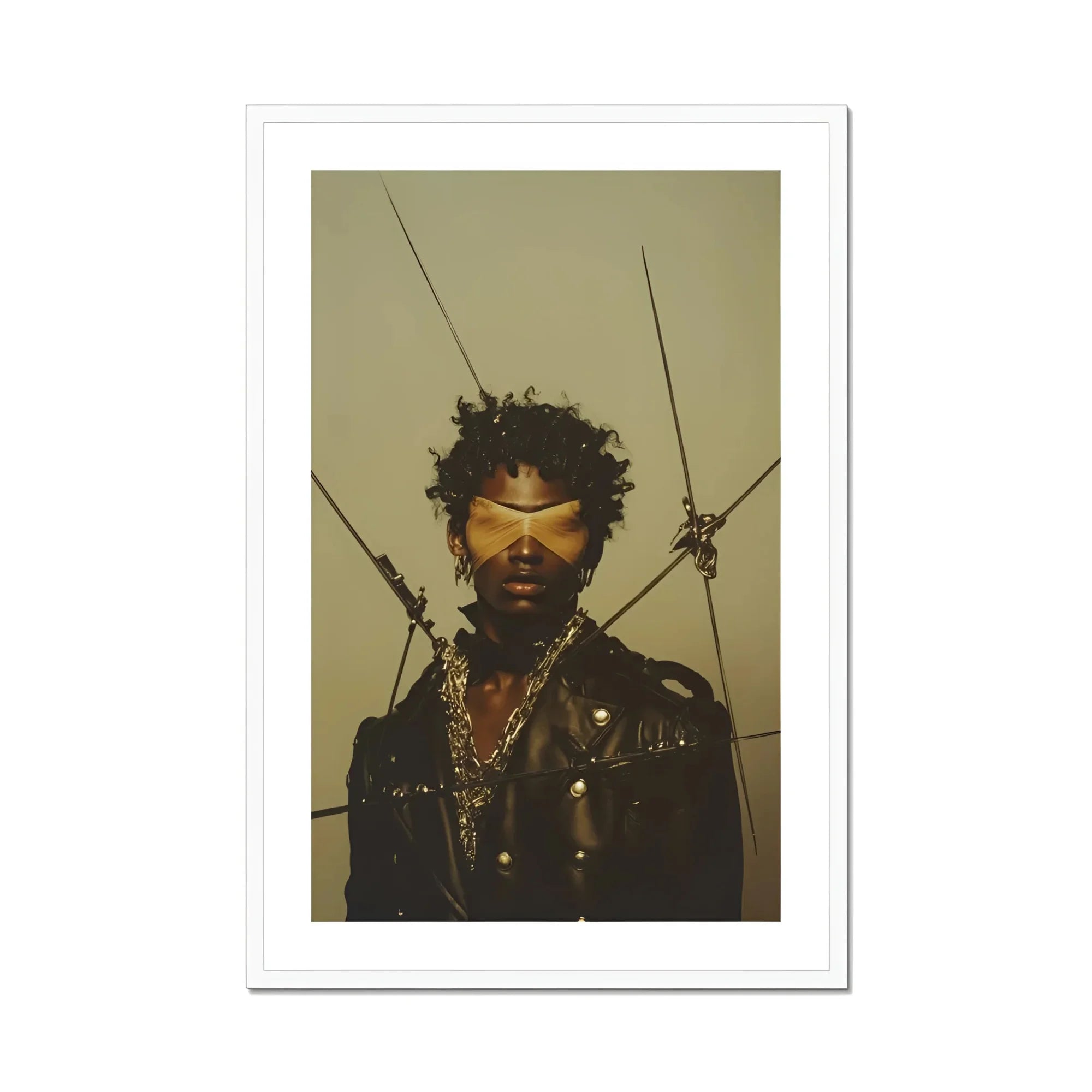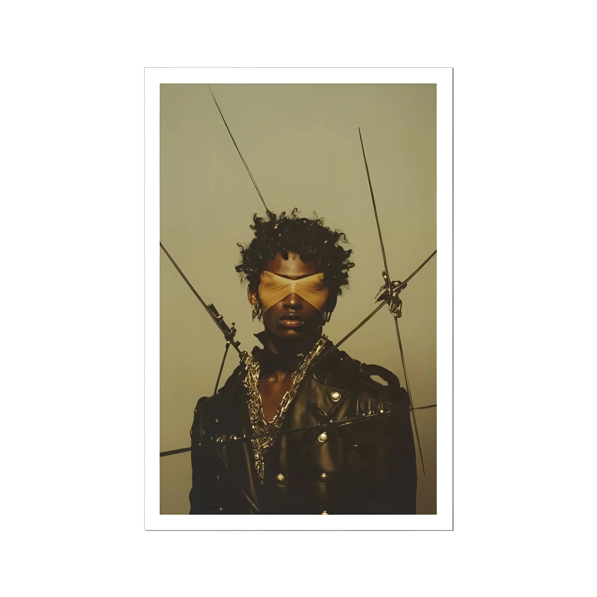 Er ist blind gefaltet, ja—aber nicht um zu gehorchen. Um zurückzuhalten. Um das Nichtsehen zu besitzen. Ocker umwickelt seine Augen wie ein Evangelium, das abtrünnig geworden ist, wie ein schmutziges Gebet, das in eine Spiegelkugel gemurmelt wird. Er ist nicht entblößt. Er ist inszeniert.