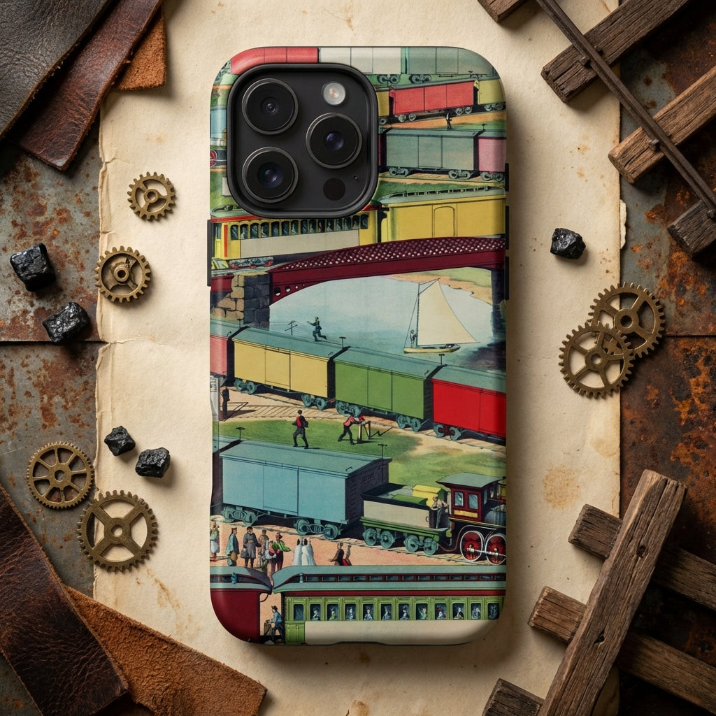 Ein Kaleidoskop der Bewegung, ein Labyrinth aus Stahl und Dampf—diese Zig-Zag iPhone-Hülle fängt den Puls einer vergangenen Ära ein, in der Lokomotiven die Landschaft beherrschten. Inspiriert von alten Eisenbahnillustrationen, schichtet dieses Design ein traumhaftes Netzwerk von Bahngleisen, geschäftigen Passagieren und Momentaufnahmen des täglichen Lebens, jedes Detail ein Portal in die Vergangenheit. Güterwagen in Primärfarben schlängeln sich durch Brücken und Tunnel und bilden ein endloses Gewebe aus Bewegung, während ein einsames Segelboot in ruhigem Kontrast dahintreibt—ein Flüstern der Stille inmitten des industriellen Rhythmus.