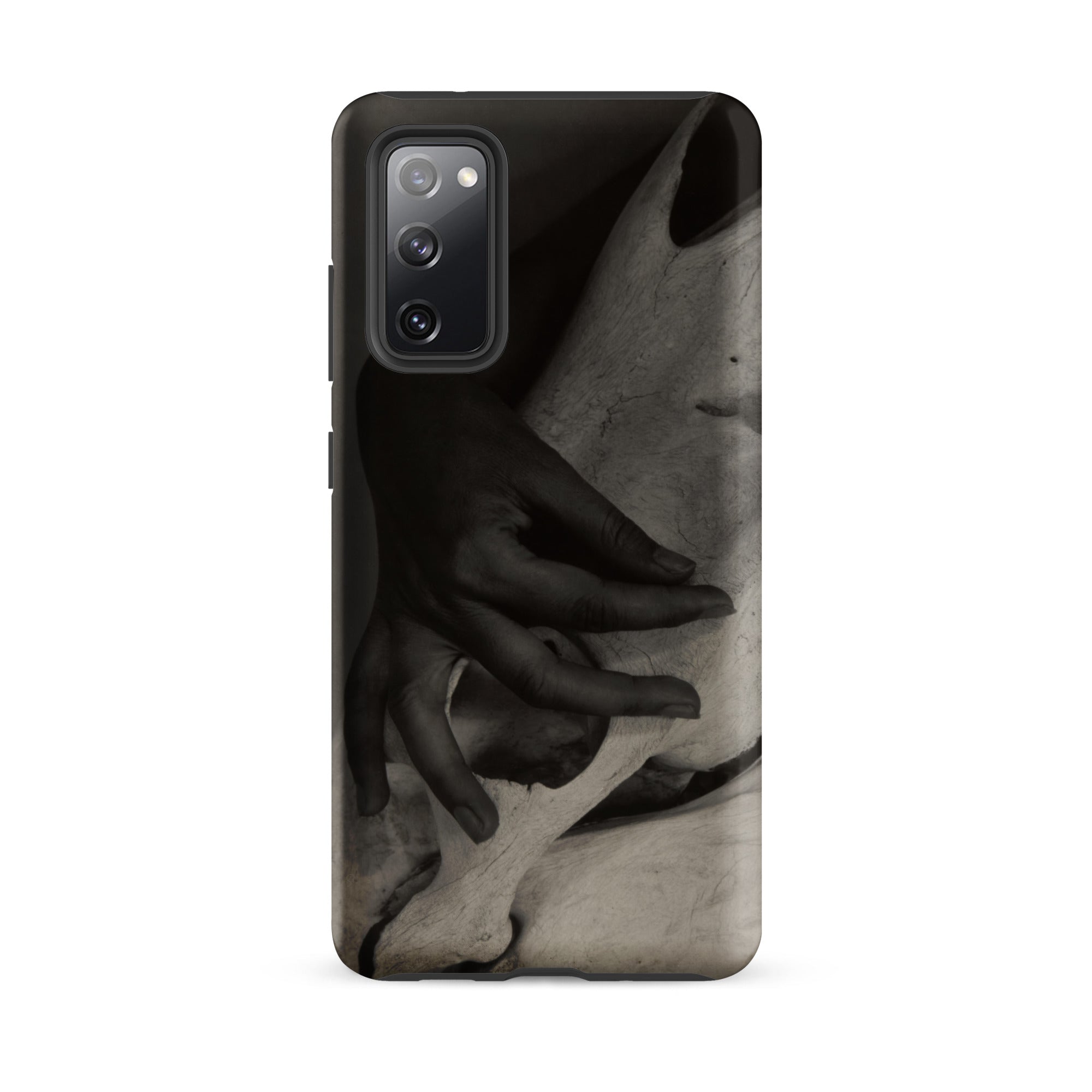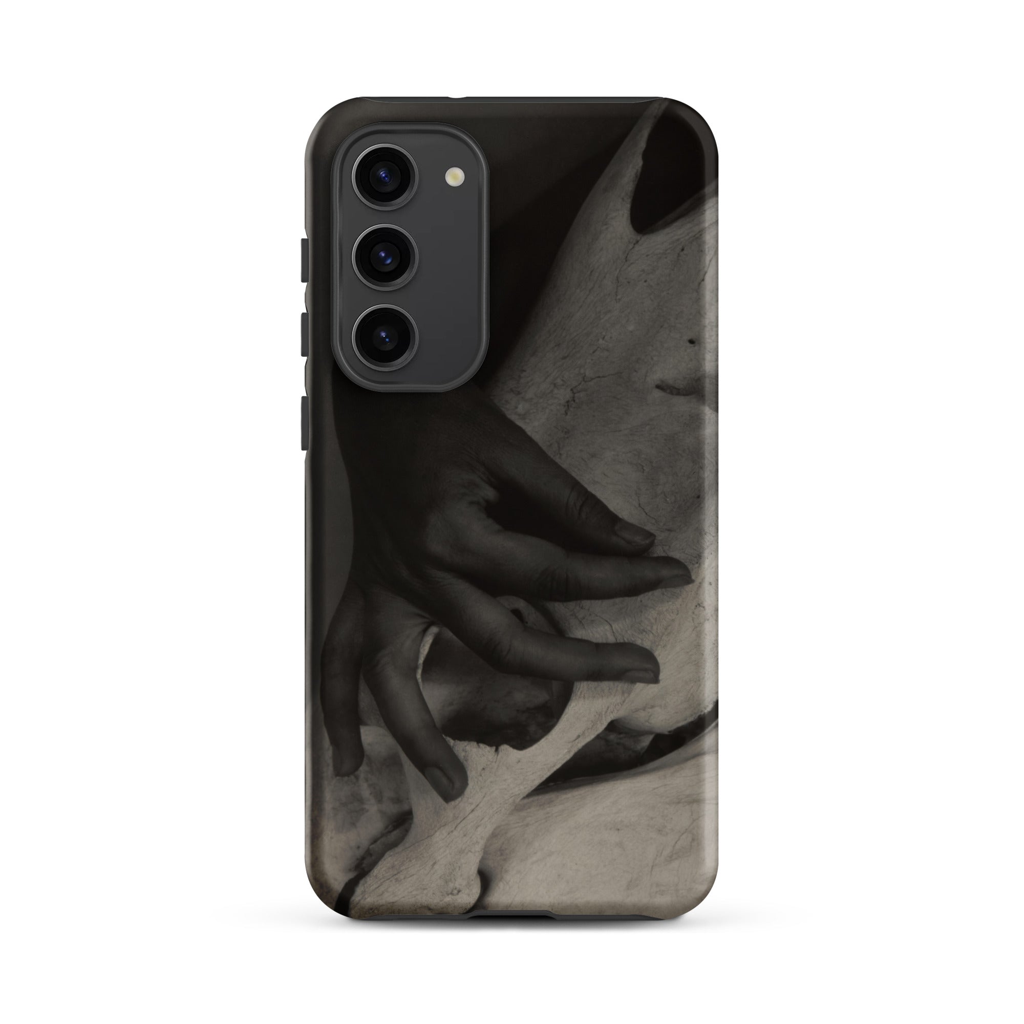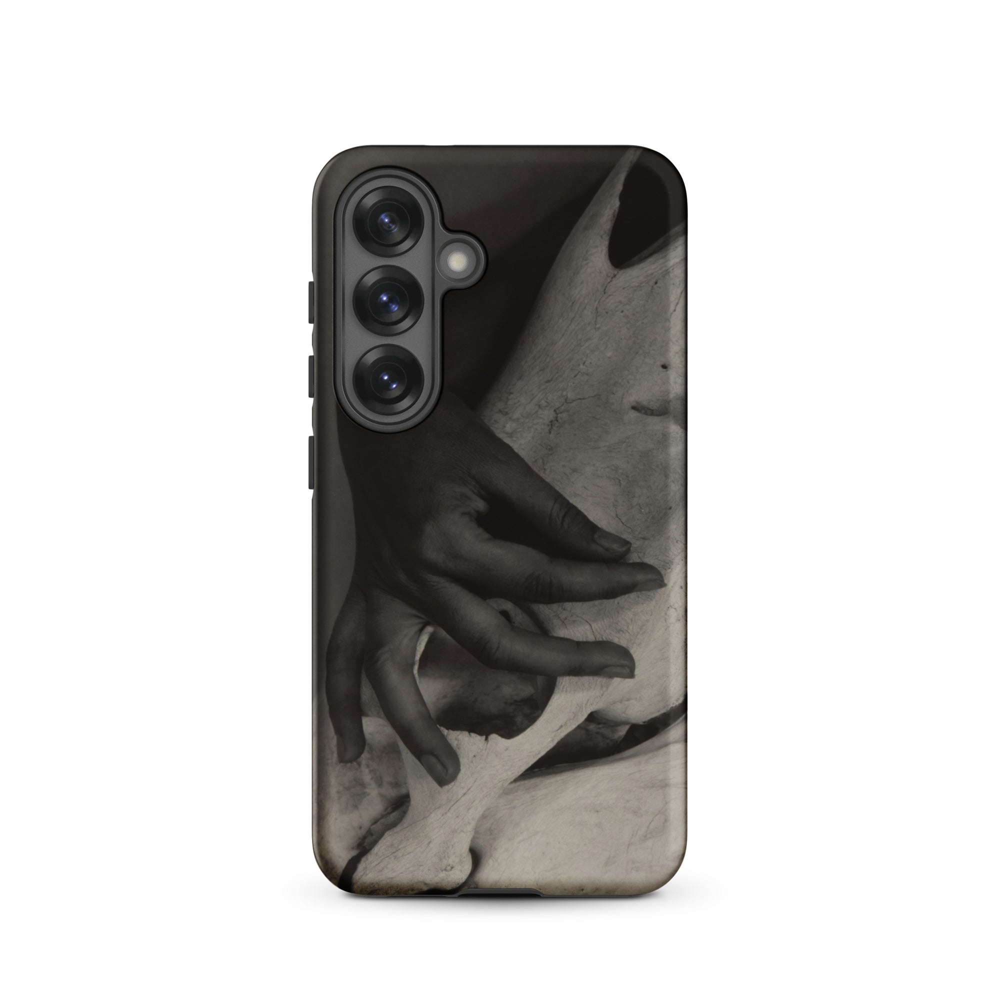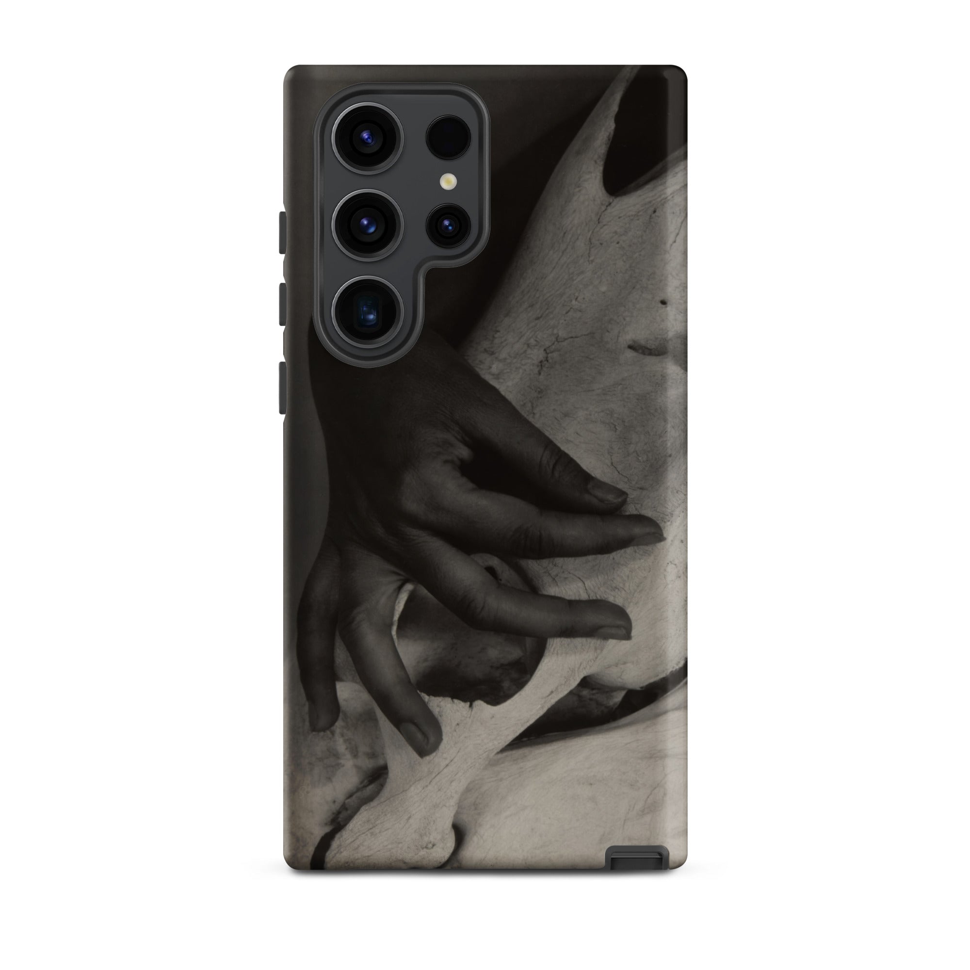 Dedos presionan la cresta pálida de un cráneo de caballo desgastado, un encuentro de carne y hueso que Alfred Stieglitz capturó con una intimidad inquebrantable. Este estuche Samsung preserva su ojo modernista austero, donde el toque humano confronta la arquitectura de la mortalidad. La fotografía en blanco y negro extrae su poder de las gradaciones tonales: sombra envolviendo nudillo, luz deslizándose por la superficie calcificada, texturas colisionando en un momento que se siente escultórico.