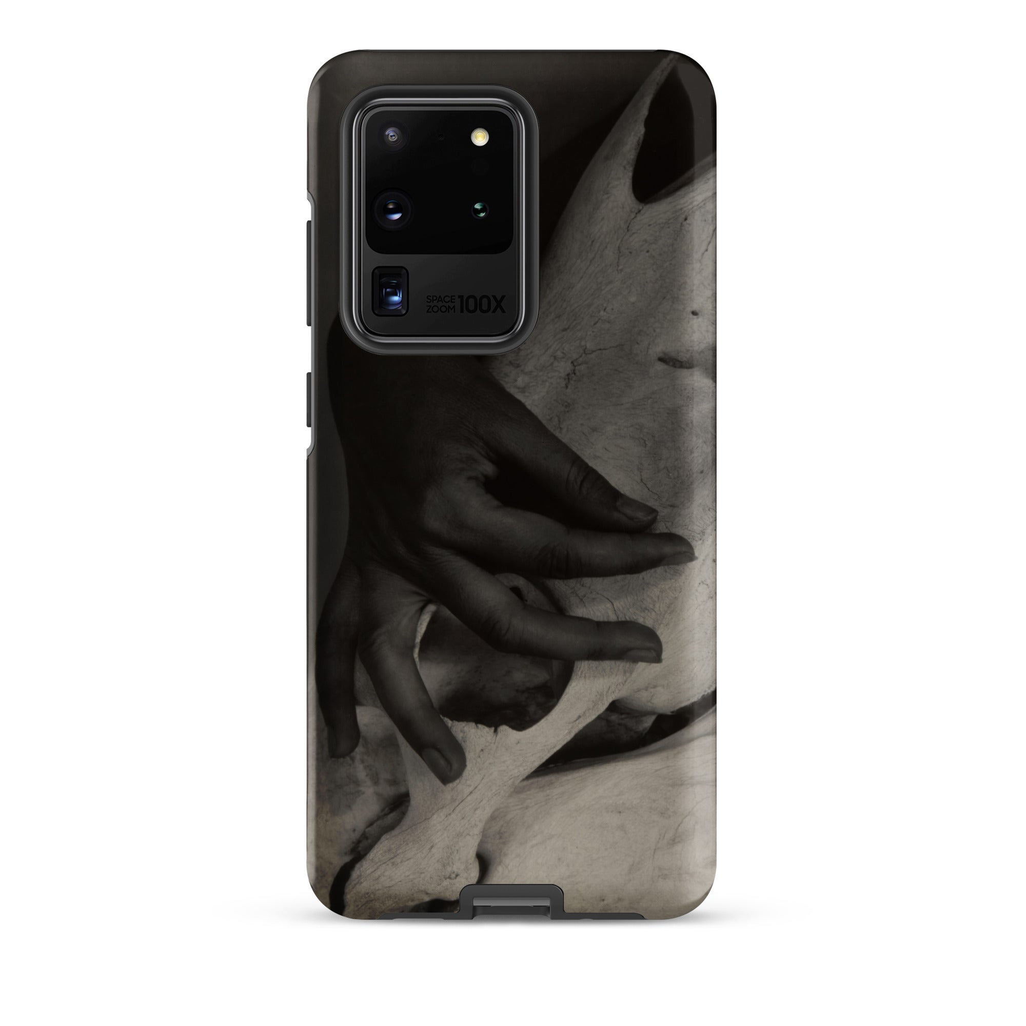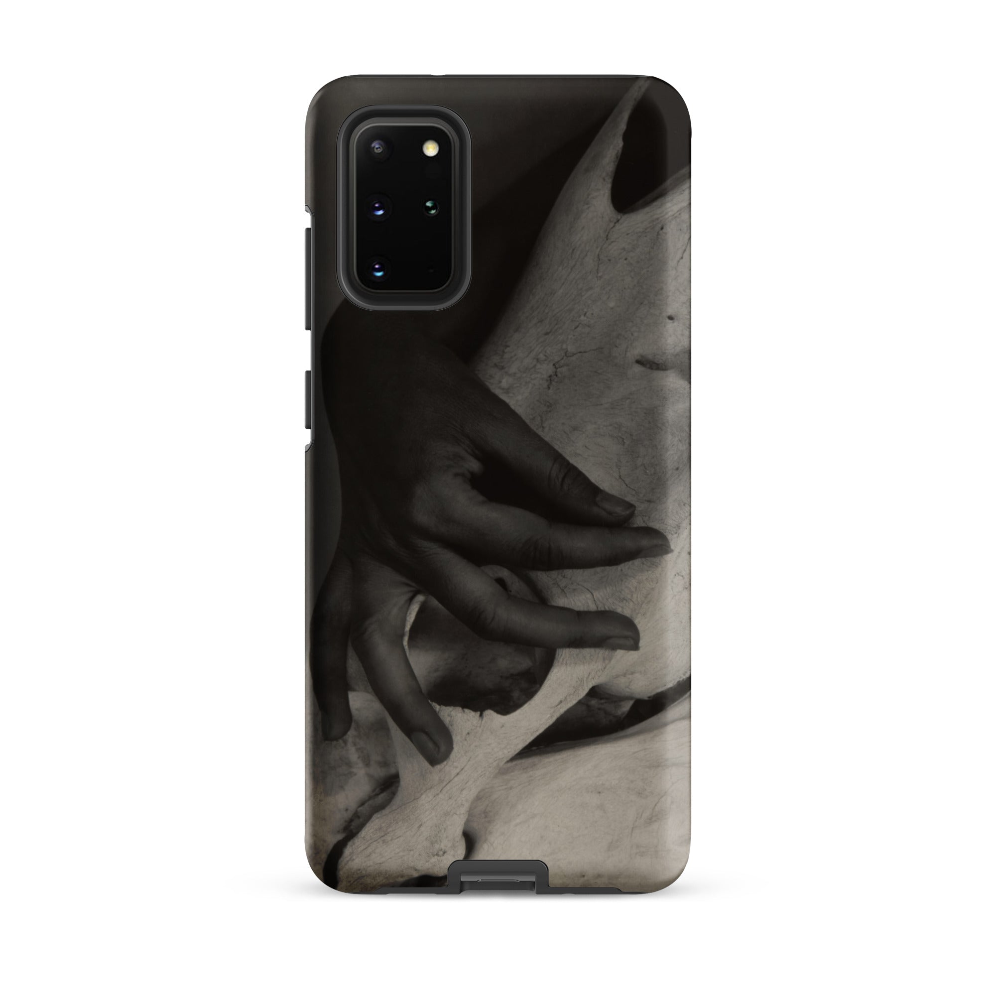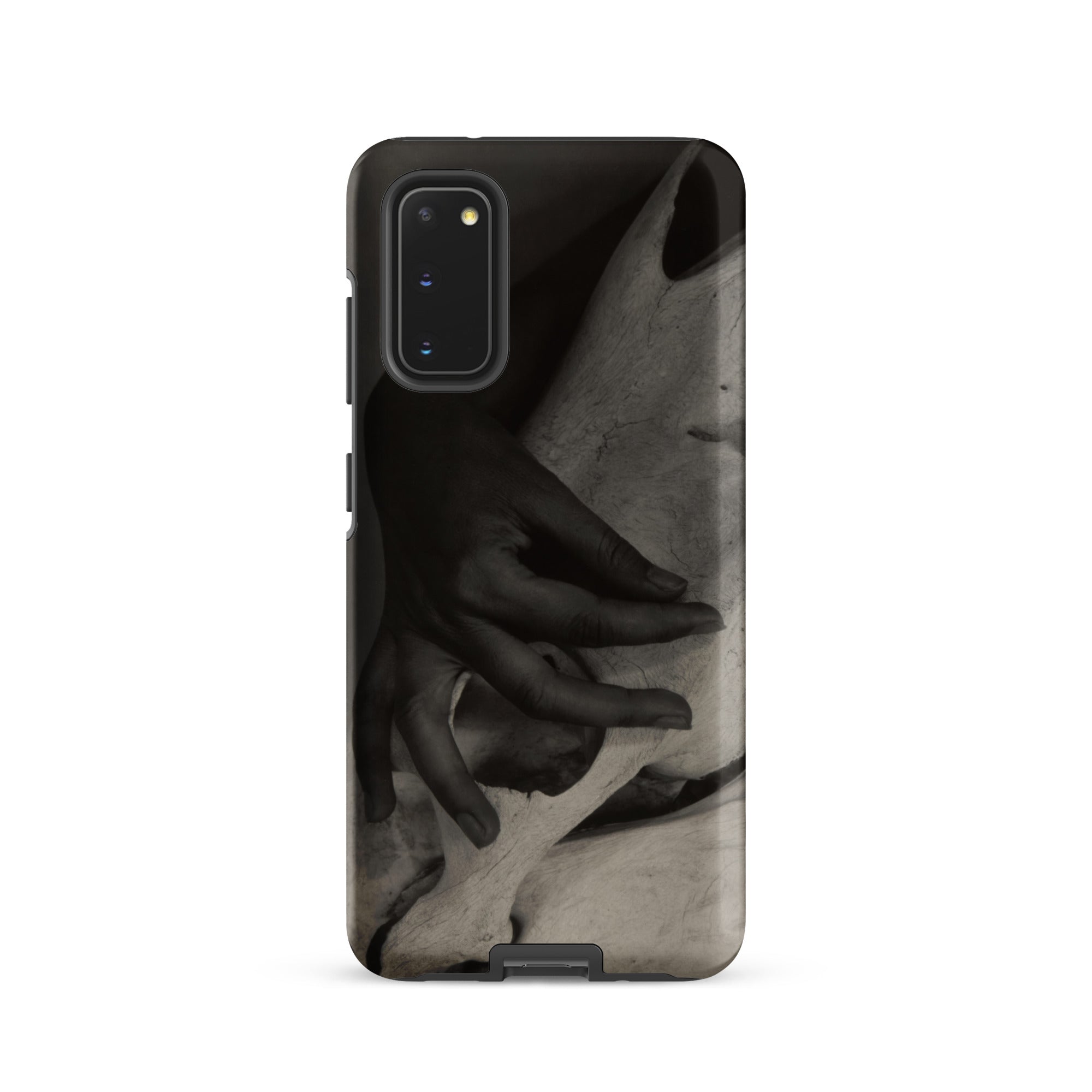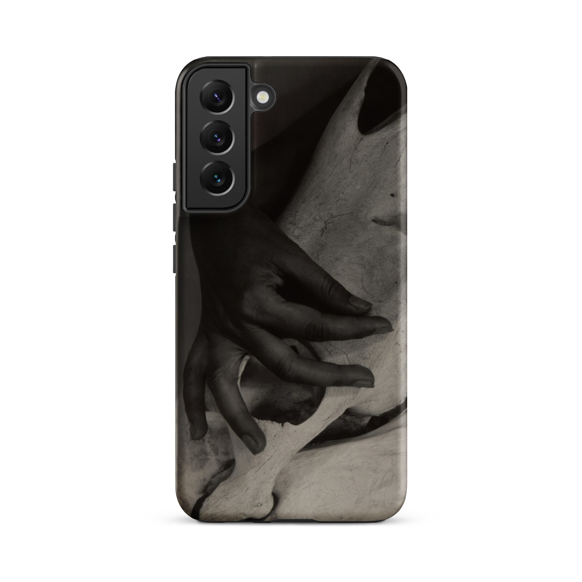 Dedos presionan la cresta pálida de un cráneo de caballo desgastado, un encuentro de carne y hueso que Alfred Stieglitz capturó con una intimidad inquebrantable. Este estuche Samsung preserva su ojo modernista austero, donde el toque humano confronta la arquitectura de la mortalidad. La fotografía en blanco y negro extrae su poder de las gradaciones tonales: sombra envolviendo nudillo, luz deslizándose por la superficie calcificada, texturas colisionando en un momento que se siente escultórico.