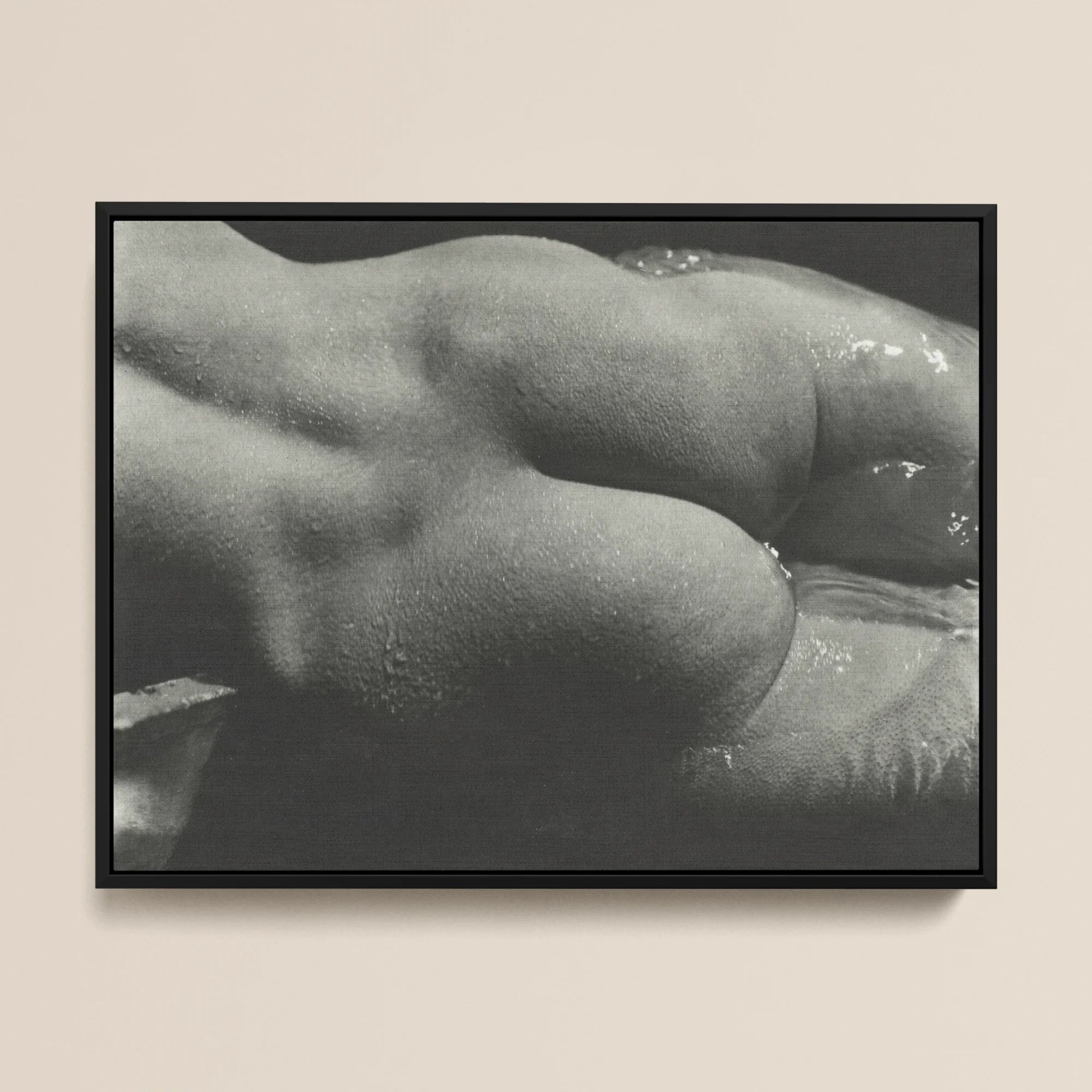 Inmerso en un mundo blanco y negro de piel brillante y curvas sensuales. Este llamativo lienzo enmarcado Captura la intimidad cruda de Rebecca Salsbury Strand, inmortalizada por la lente magistral de Alfred Stieglitz. Las gotas se adhieren a la carne de piel de gallina, creando un táctil paisaje de luz y sombra. La composición de primer plano acentúa las formas ondulantes del cuerpo de Rebecca, invitando a su mirada a rastrear cada contorno.
