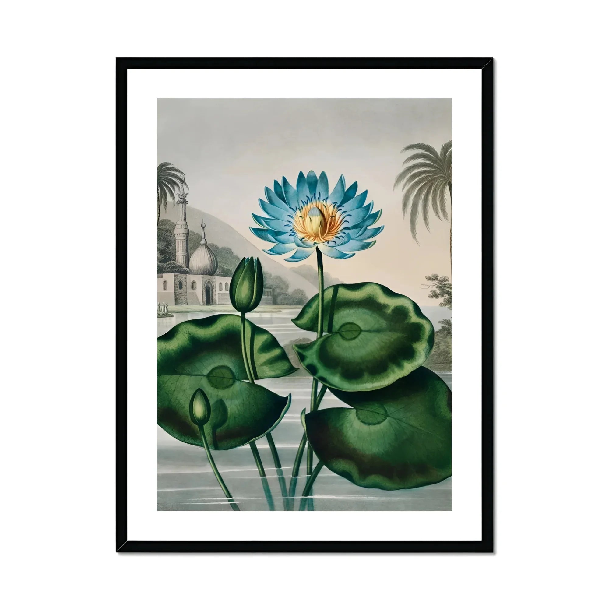 En esta multa cautivadora estampado de arte Tomado del "Templo de la Flora", Robert John Thornton entrelaza magistralmente la precisión botánica con el exotismo romántico. El agua de agua egipcia azul ocupa el centro del escenario, sus pétalos azules se despliegan en un contexto de arquitectura islámica y palmeras imponentes.
