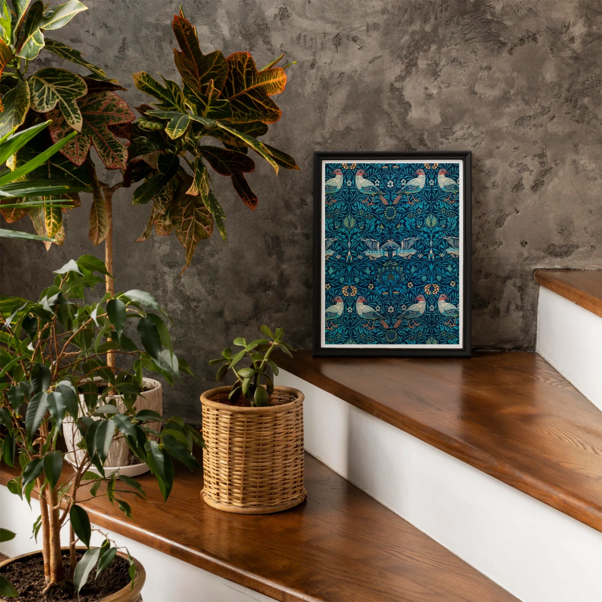 Contra un suntuoso fondo índigo, formas avianas meticulosamente representadas se entrelazan con follaje estilizado, creando una danza hipnotizante de forma y color. Cada ave, exquisitamente detallada desde el pico hasta la cola, encarna la reverencia del movimiento por la artesanía y la armonía del mundo natural. La repetición rítmica de flora y fauna evoca una sensación de elegancia atemporal, mientras que los ricos tonos joya - azules pavo real, verdes terrosos y dorados cálidos - imbuyen la obra con profundidad y vitalidad.