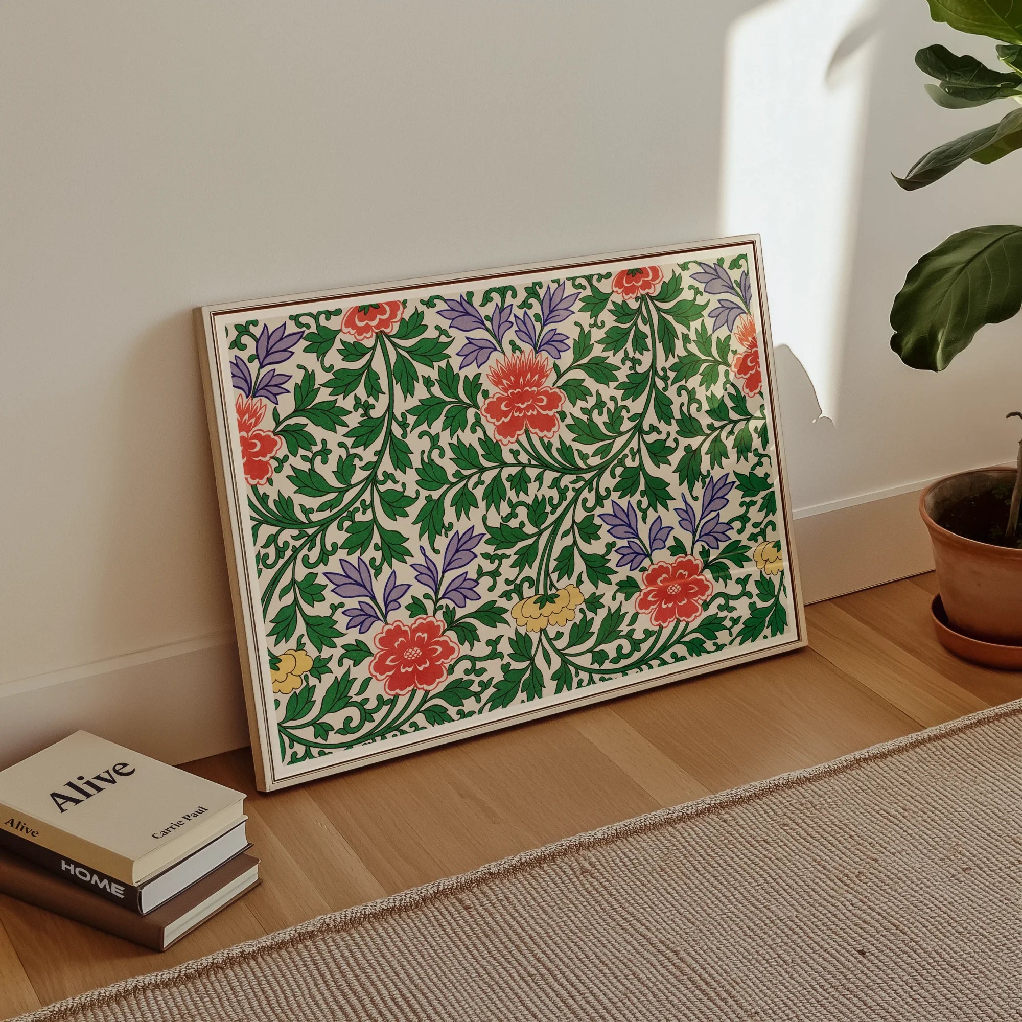 El meticuloso arte de Jones da vida a cada vid giratoria y hojas intrincadamente representadas, evocando la belleza atemporal de las tradiciones ornamentales chinas. Este no es un mero patrón, sino una celebración vívida de la recompensa de la naturaleza, donde la precisión botánica se encuentra con el encanto decorativo.