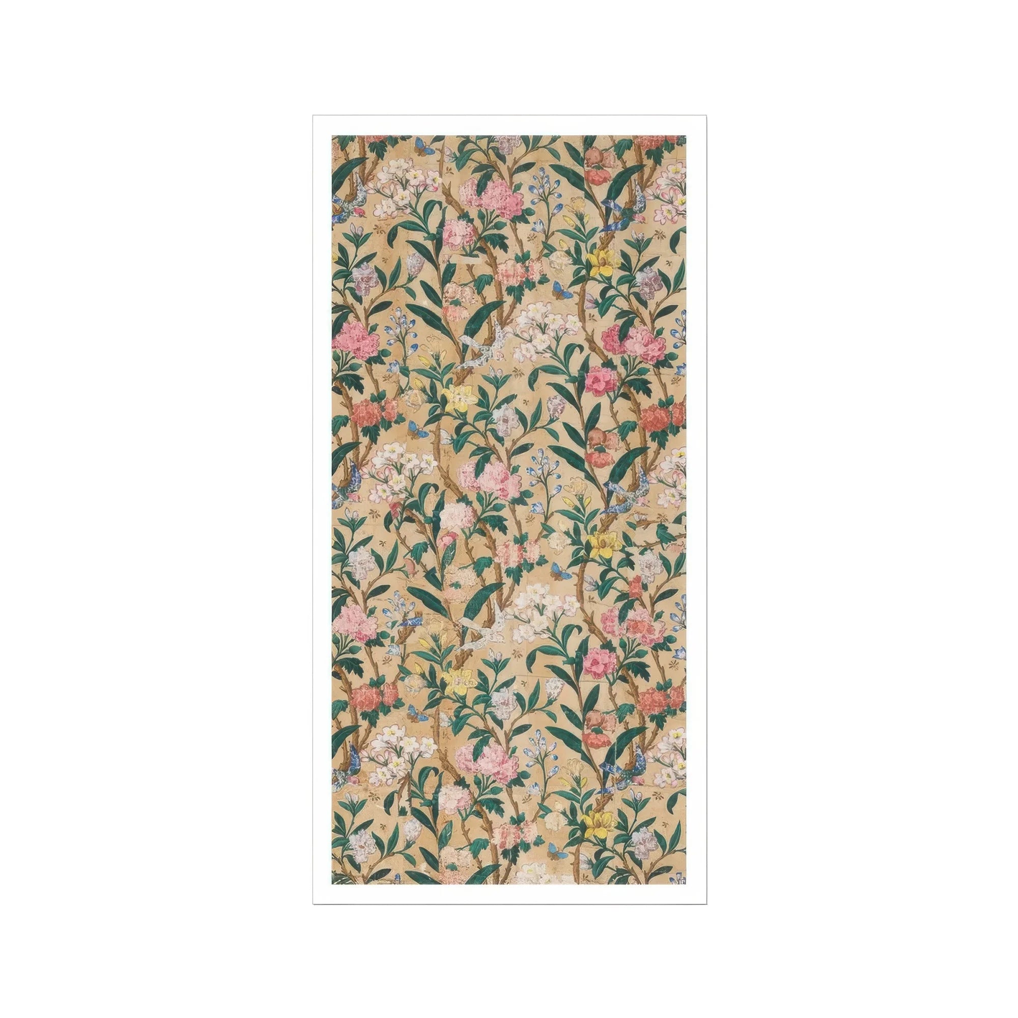 Esta exquisita impresión botánica captura la esencia de la chinaisería de la era victoriana, mezclando motivos de jardín inglés con oriental estética. Modolias, jardinias, crisantemos y granadas meticulosamente se entrelazan a lo largo de las vides sinuosas, sus flores una sinfonía de rosa, malva, naranja y tonos amarillos.
