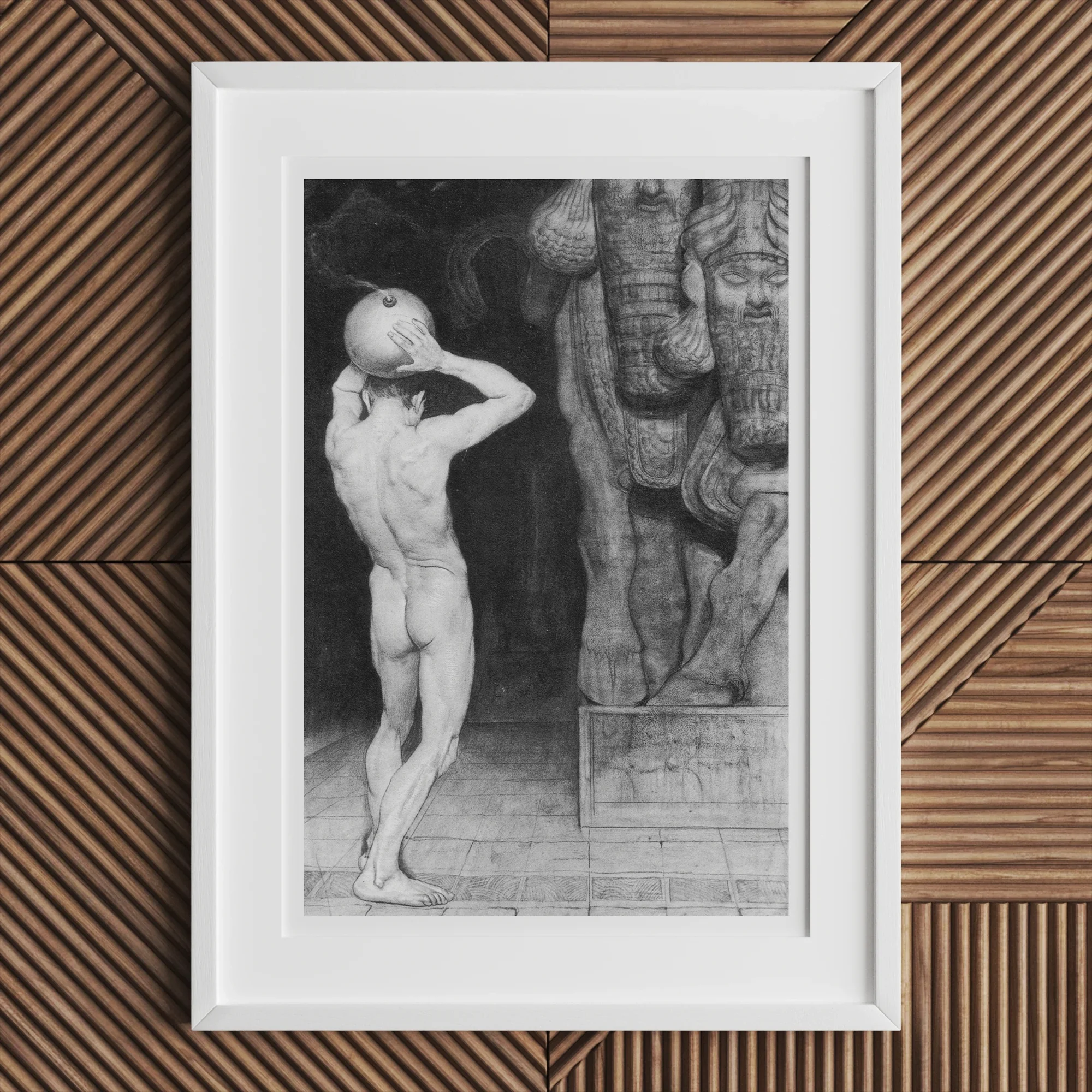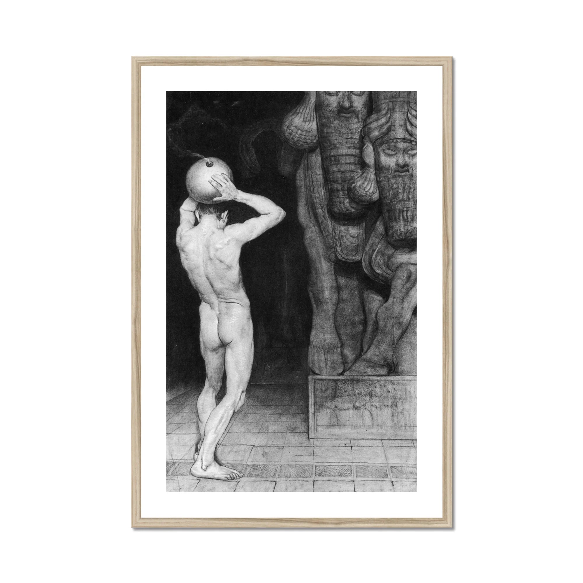 Sumérgete en el mundo provocativo de "The Anarchist" de Sascha Schneider. Esta fascinante obra de arte en blanco y negro yuxtapone una figura desnuda musculosa con la antigua estatuario asiria, creando un marcado contraste entre carne y piedra. Estarás cautivado por la tensión dinámica cuando el hombre desnudo, su rostro oscurecido por una máscara esférica, alcanza hacia arriba en un gesto de desafío o revelación.