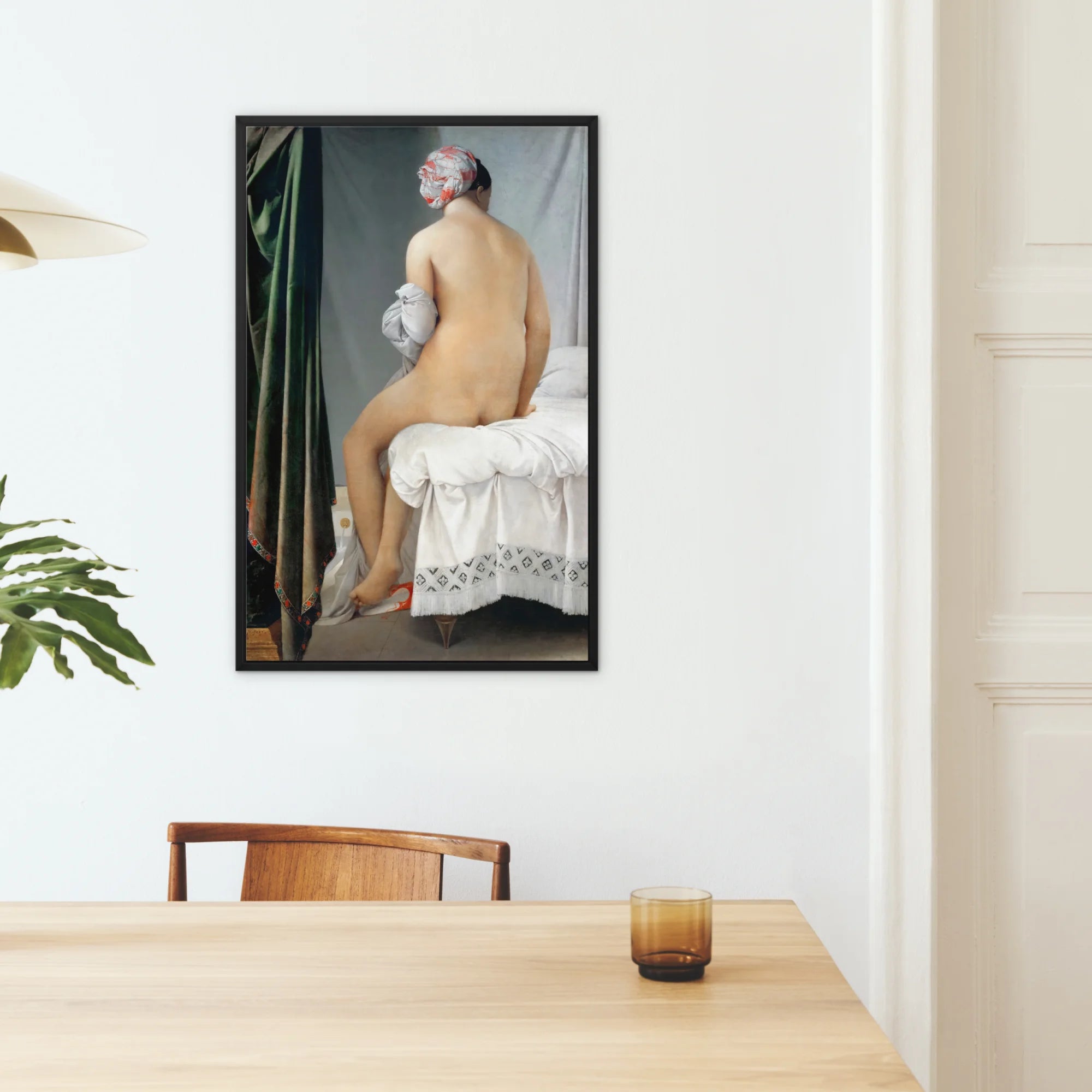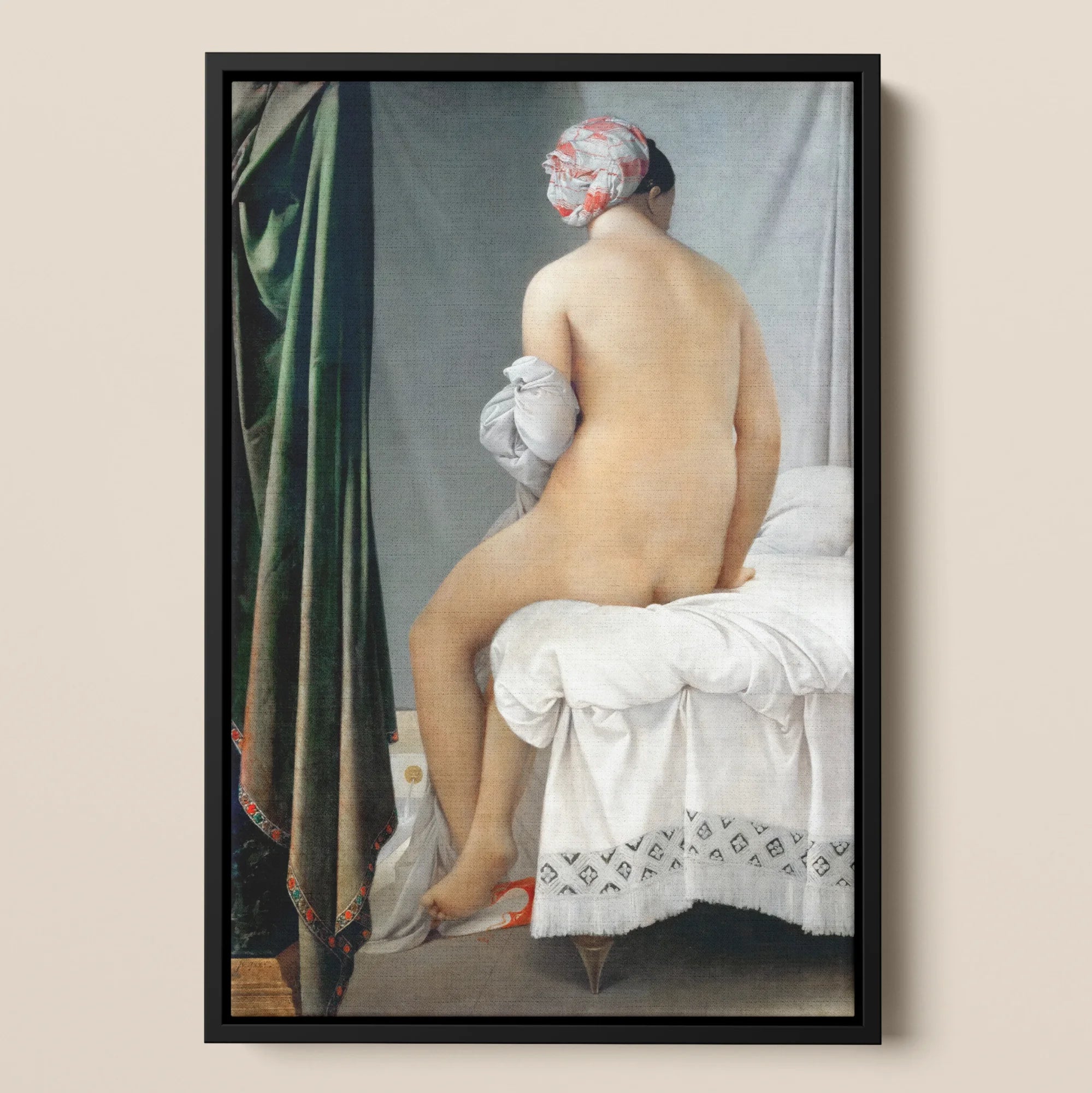 Ser atraído a un mundo de texturas suntuosas y belleza enigmática con esto lienzo enmarcado Reproducción de la obra maestra de Ingres. La piel de alabastro de Valpinçon Bather brilla contra la rica cortina esmeralda, invitando a tu mirada a rastrear las curvas sensuales de su espalda. Su pañuelo en la cabeza rojo agrega un pop vibrante a la paleta apagada, mientras que detalles intrincados como la toalla bordada y el piso de mármol pulido elevan la opulencia de la escena.