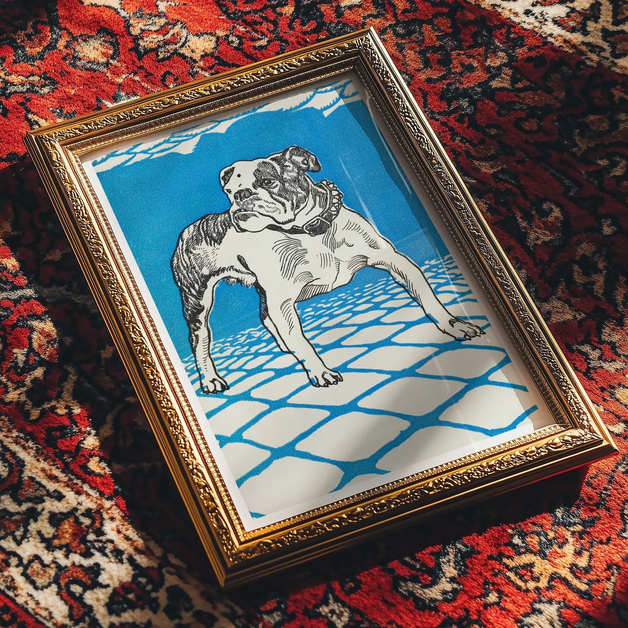 En esta llamativa litografía, el "Bulldog" de Moriz Jung salta del marco con una vitalidad eléctrica, encarnando el espíritu de vanguardia de la Viena de principios del siglo XX. Situado contra un hipnótico fondo azul, la forma muscular del canino atrae la atención, cada uno de sus tendones renderizados con la precisión característica de Jung.