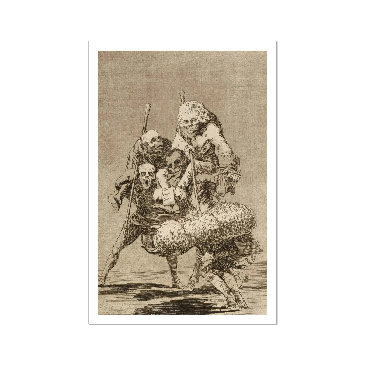 Cuerpos se amontonan en un solo cadáver en movimiento. Una grotesca columna de humanidad tambaleándose hacia adelante, una figura a horcajadas sobre otra, extremidades enredadas, rostros marchitos por la avaricia y el agotamiento. La aguja de Goya no perdona ninguna clase—cada parásito se aferra con familiaridad maníaca.