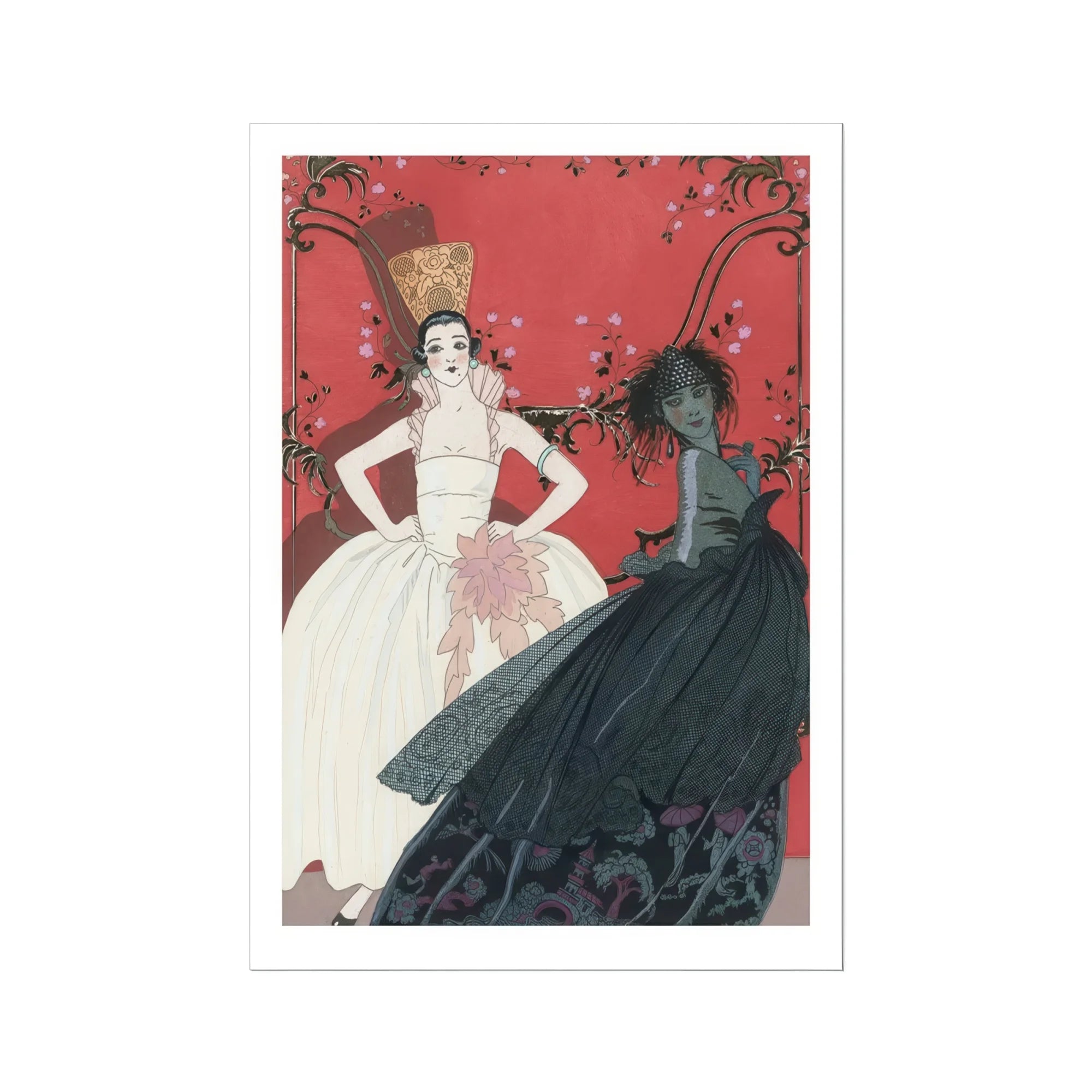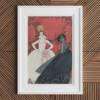 Mientras tus ojos se deleitan con el fondo rojo chino, presencia la dramática transformación que se despliega. El radiante Día, adornado con un resplandeciente vestido blanco y un majestuoso tocado, se alza triunfante. La Noche, envuelta en misterio y adornada con un intrincado conjunto negro, se retira en las sombras. El uso magistral de Barbier del contraste y el simbolismo da vida a esta metamorfosis al estilo de Cenicienta, capturando la esencia de la alta sociedad de los años 1920 y su inclinación por múltiples cambios de vestuario diarios.