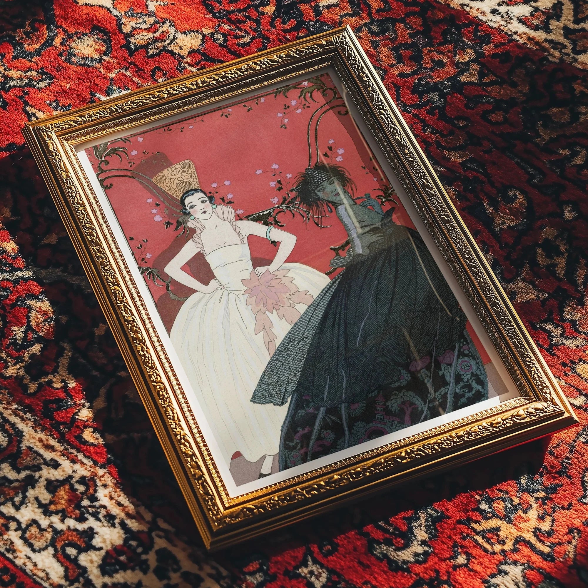 Profundiza en los exquisitos detalles del pochoir: los adornos florales, las poses elegantes y el juego de luces y sombras. Esta pieza rara de la serie de almanaques de edición limitada de Barbier te ofrece un vistazo al opulento mundo del París de entreguerras, donde la moda, el arte y la sociedad convergían en un deslumbrante espectáculo de creatividad y lujo.
