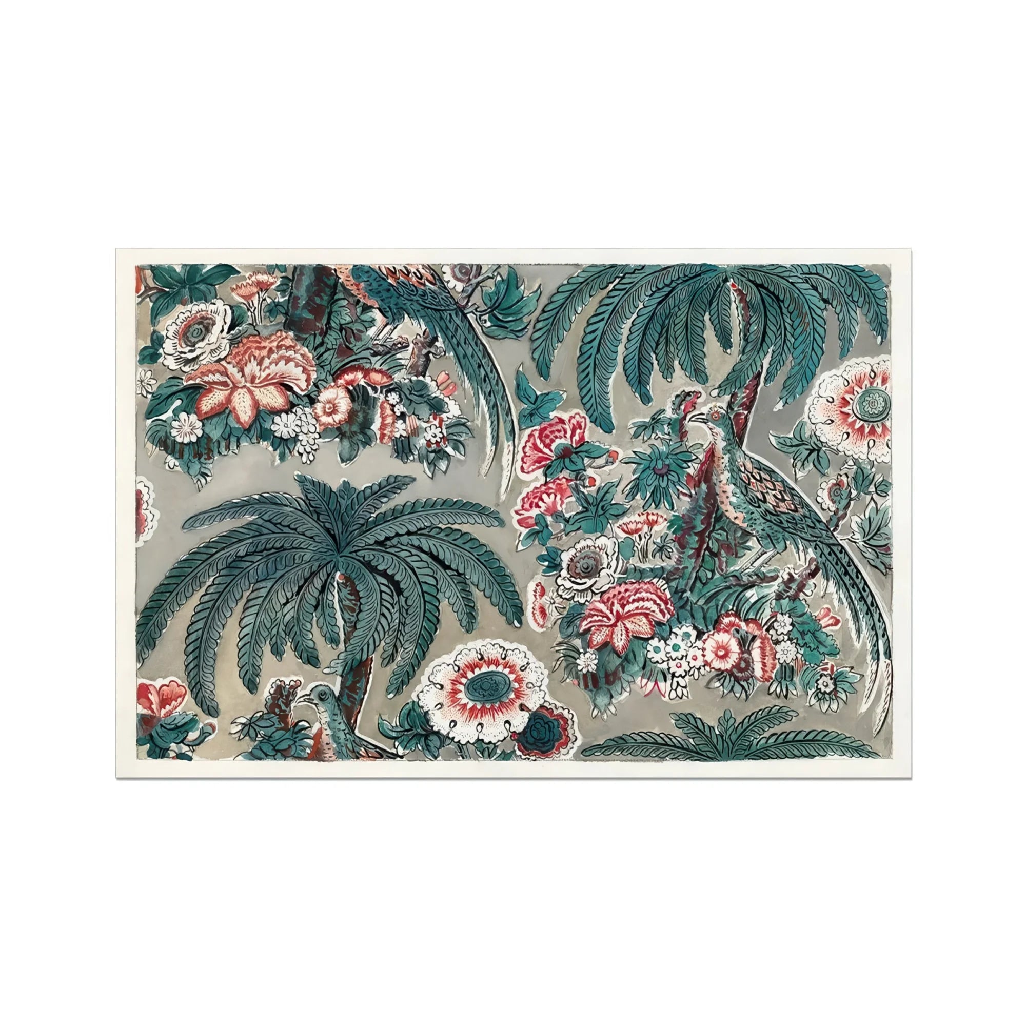 A medida que sus ojos deambulen por la composición, descubrirá hojas de palma meticulosamente renderizadas que se balancean junto a flores exóticas exquisitamente pintadas. Las pájaros elegantes se posan en medio del follaje, sus formas elegantes agregan un toque de fantasía a la escena. El cepillo experto de Loughridge combina sin problemas la precisión naturalista con el toque decorativo, creando un equilibrio armonioso que personifica la fascinación de la época con la complejidad de la naturaleza.
