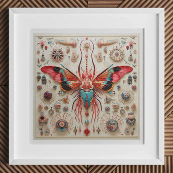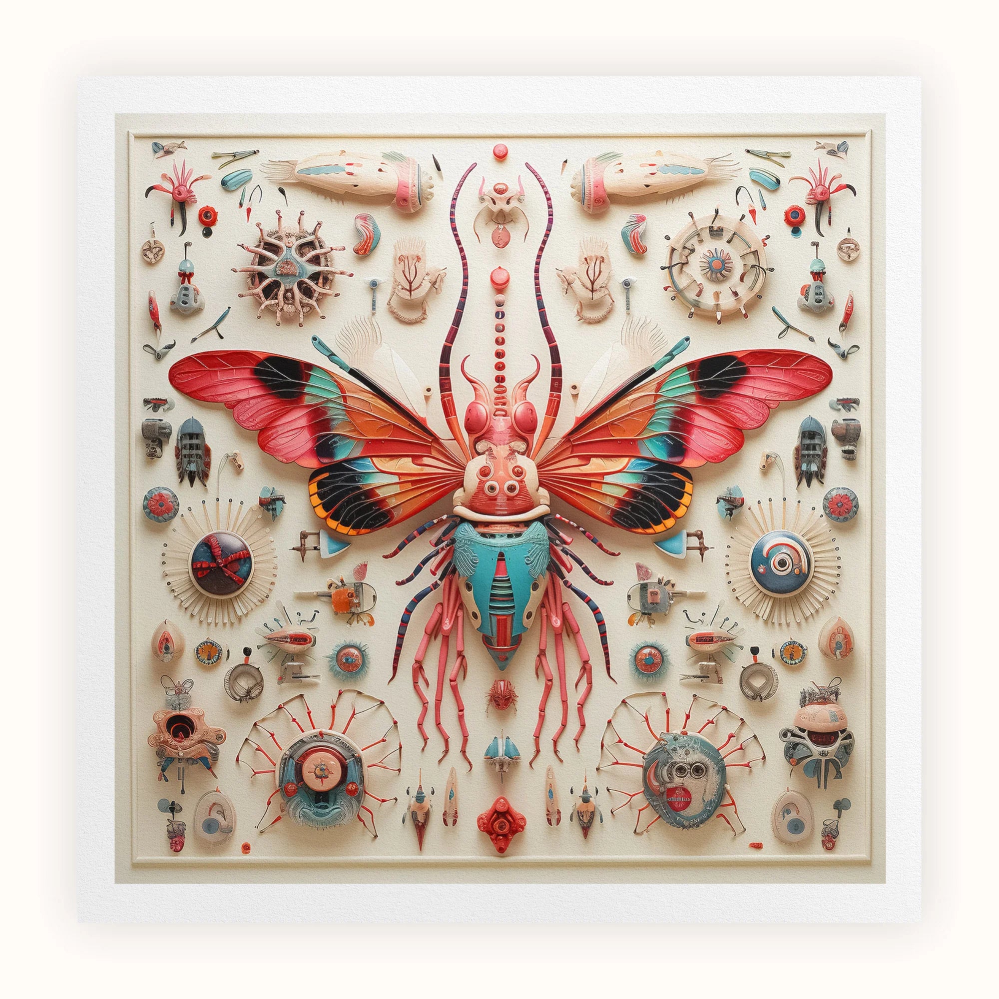 La figura central, con sus vibrantes alas carmesí y su exoesqueleto de aguamarina, evoca tanto la grandeza de la Tierra. mariposas y la esencia de otro mundo de la vida exoplanetaria. Las muestras dispuestas simétricamente, desde orbes parecidos a los ojos hasta los apéndices tentáculos, crean una sinfonía visual que se hace eco de la ilustración científica mientras desafía la biología conocida.