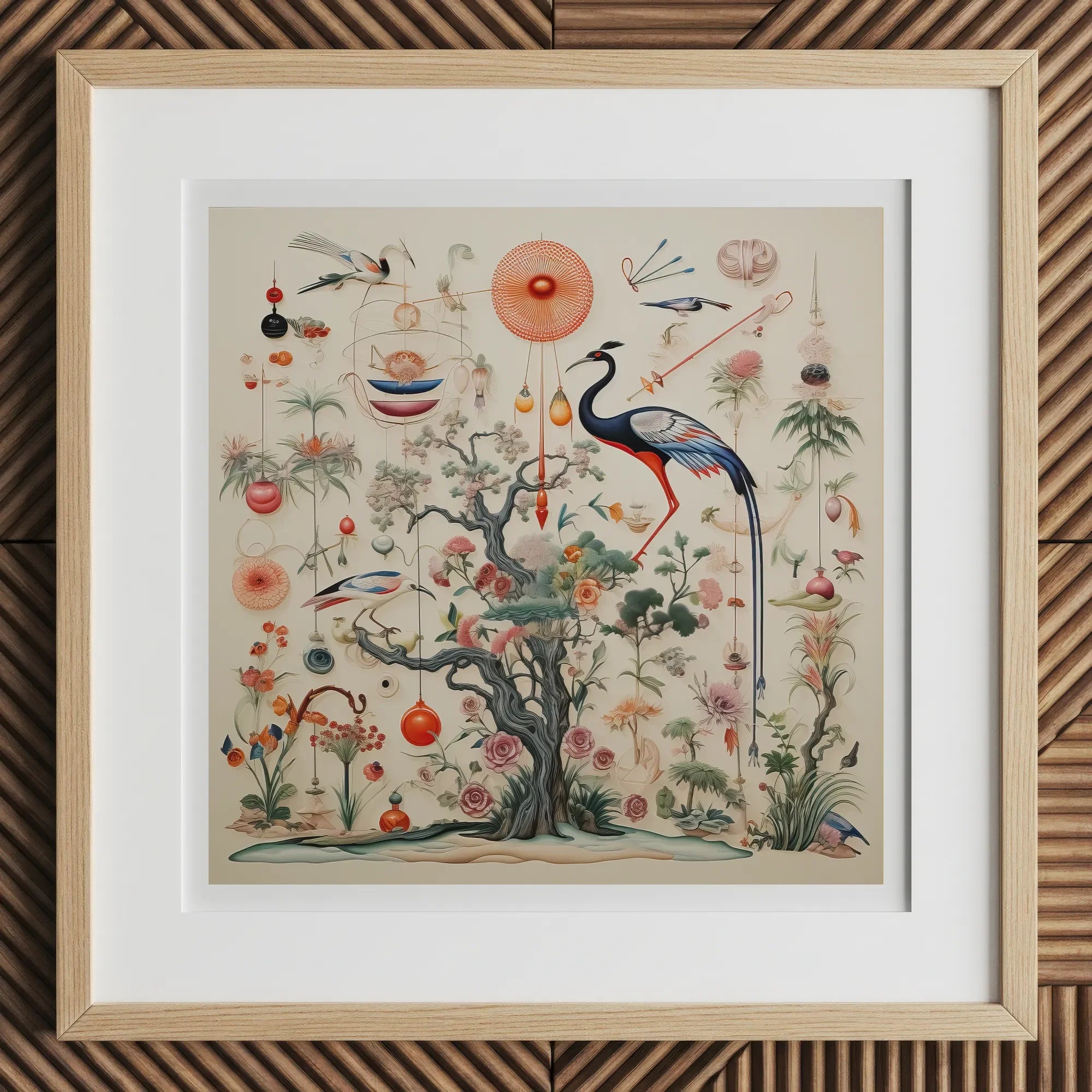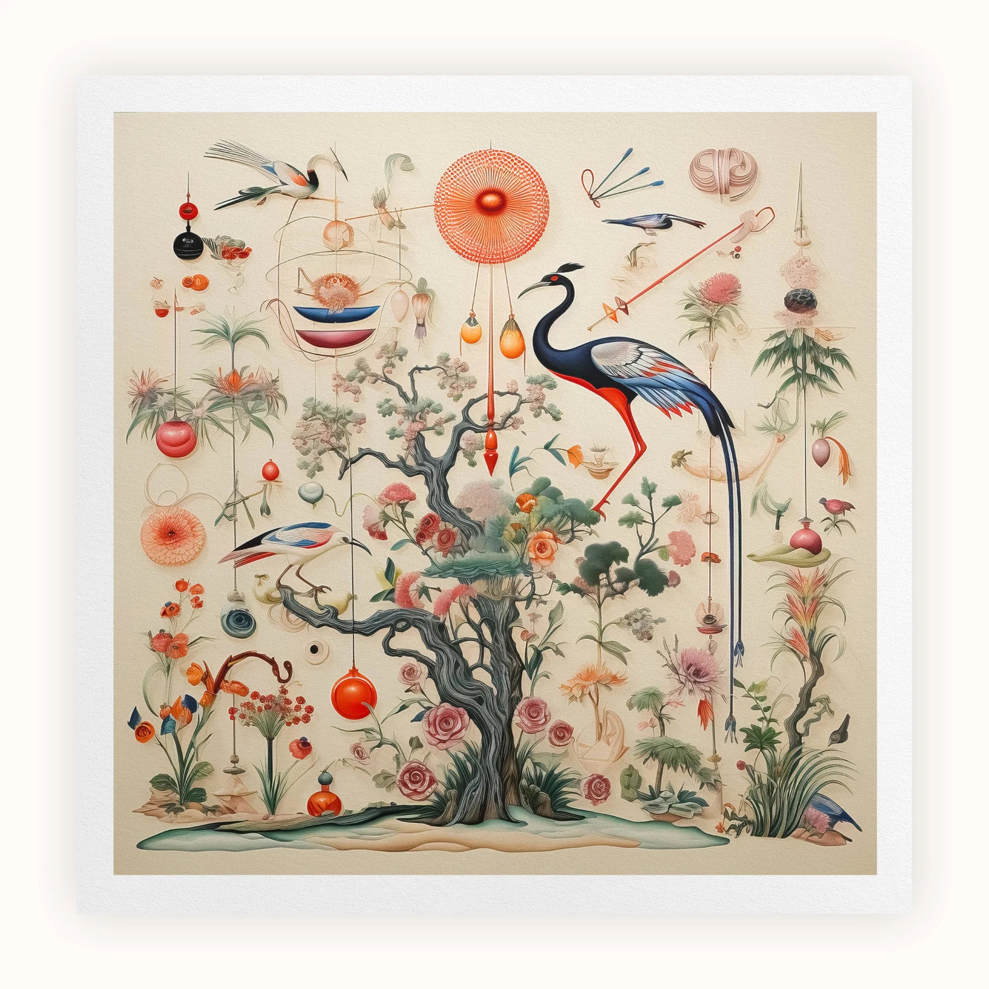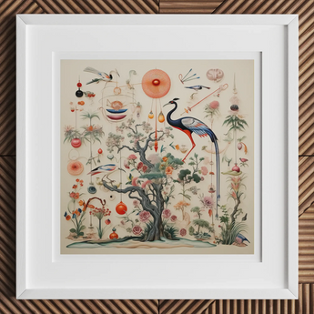 En esencia, un árbol retorcido estalla con formas de vida exóticas, grúas elegantes con piernas imposiblemente largas, flora fantástica que desafía la categorización y los orbes etéreos que se ciernen como lunas alienígenas. Casarse con la precisión de las ilustraciones naturalistas del siglo XVIII con la creatividad ilimitada del arte digital contemporáneo. Las linternas ornamentadas y los cuerpos celestes bailan alrededor de la composición, creando una sinfonía visual que desafía nuestras nociones terrestres de biología.