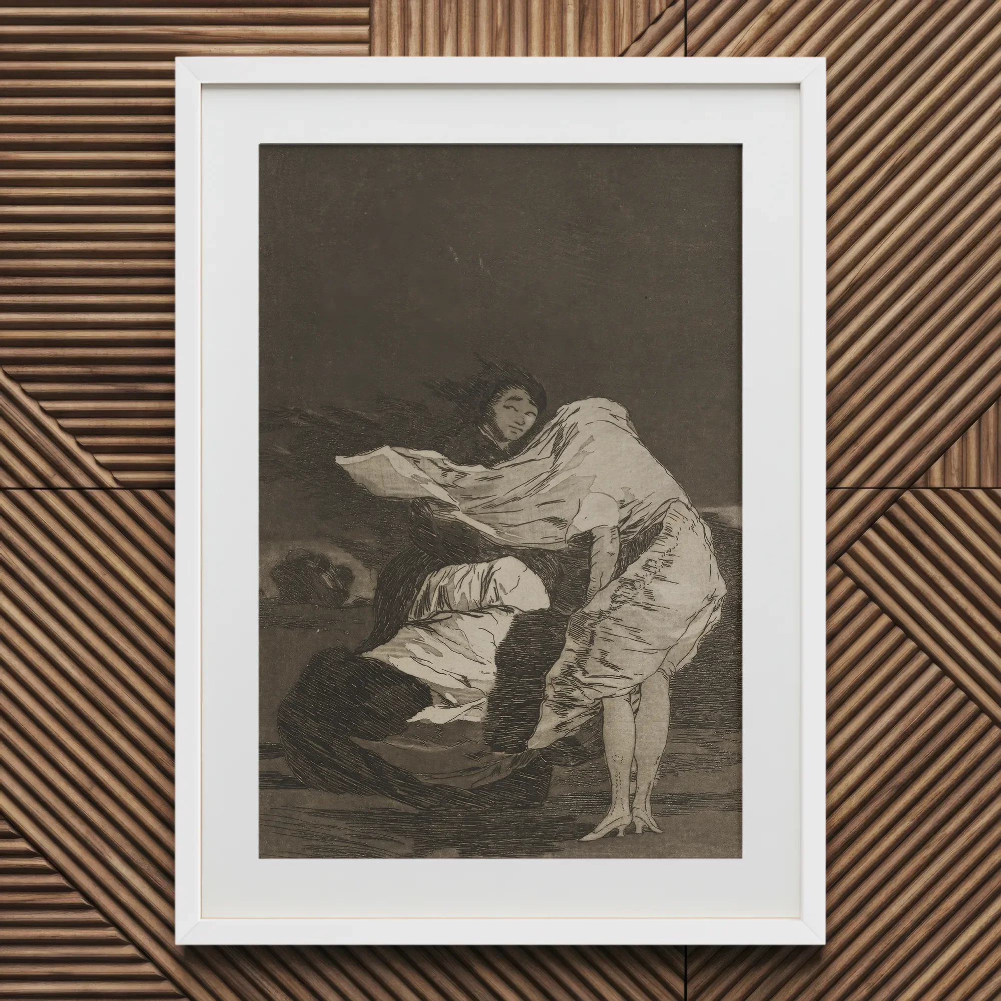 Dos figuras se retuercen bajo la asfixiante oscuridad. La tela se adhiere a sus extremidades como la niebla, sus rostros medio tragados por la sombra. Goya no grabó una tormenta, sino el aire mismo del temor—tinta espesa como el sueño, blanco raspado del cobre como un jadeo por luz. Pálidos ecos de virtud en una noche que no ofrece ninguno.