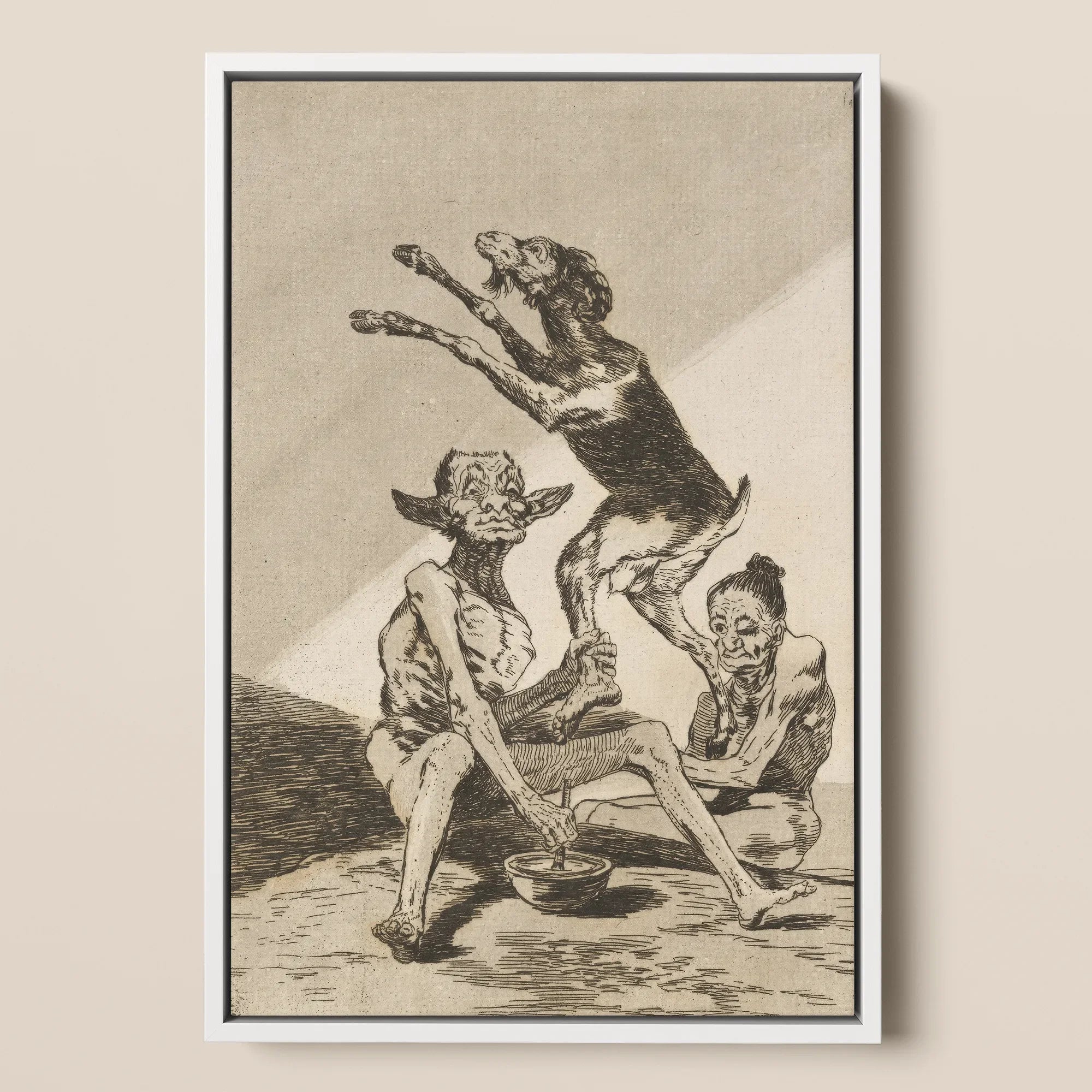 El aguafuerte ácido del artista transforma la brujería en metáfora de la decadencia moral: autoridad y absurdo fusionados en un gesto impío. El cabrón, símbolo de la creencia ciega, salta al aire mientras los fieles se inclinan bajo él.