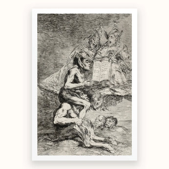 El grabado ácido de Goya ridiculiza la santidad de la autoridad. Una bruja grotesca, desnuda y triunfante, canta desde un libro sostenido en alto por dos clérigos burlones. La parodia arde con la ira de la Ilustración: la fe corrompida por la actuación, la piedad reducida a farsa. La bestia alada bajo sus hombros es la hipocresía de una iglesia fascinada por el espectáculo.