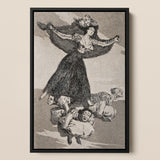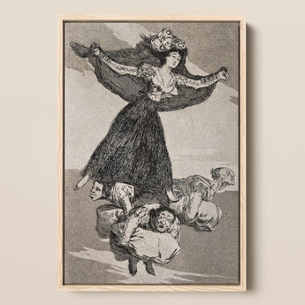 Esta fina impresión artística destila la revuelta de Goya contra la vanidad y la credulidad, su grabado ácido exponiendo el teatro social que coronó la corrupción con gracia. La mujer asciende a través de la ironía, su compostura es tanto halo como acusación, flotando sobre un mundo demasiado ciego para reconocer su propia adoración absurda.