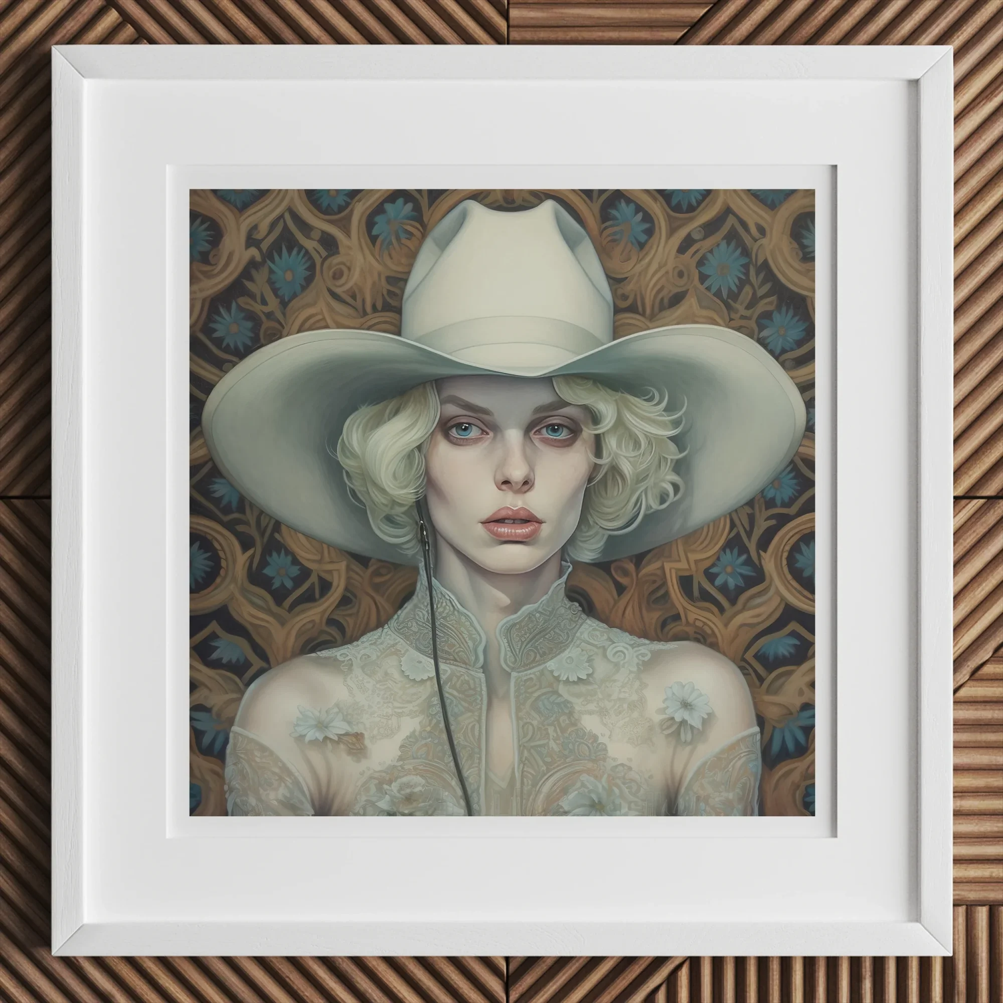 La luna se inclina baja, un testigo pálido de su valentía. Una jinete fantasma en perlas y encajes, se mueve a través del silencio del desierto, donde los ecos de un amor indomable se tallan en las paredes del cañón. Bajo el amplio ala de un sombrero vaquero de marfil, su mirada es implacable—un azul tan agudo que podría cortar a través del mito mismo. No busca permiso, ni pide el favor de la historia. Escribe su propio folclore en la médula del Oeste, donde sáficas vaqueras una vez cabalgaron lado a lado bajo un sol indiferente.