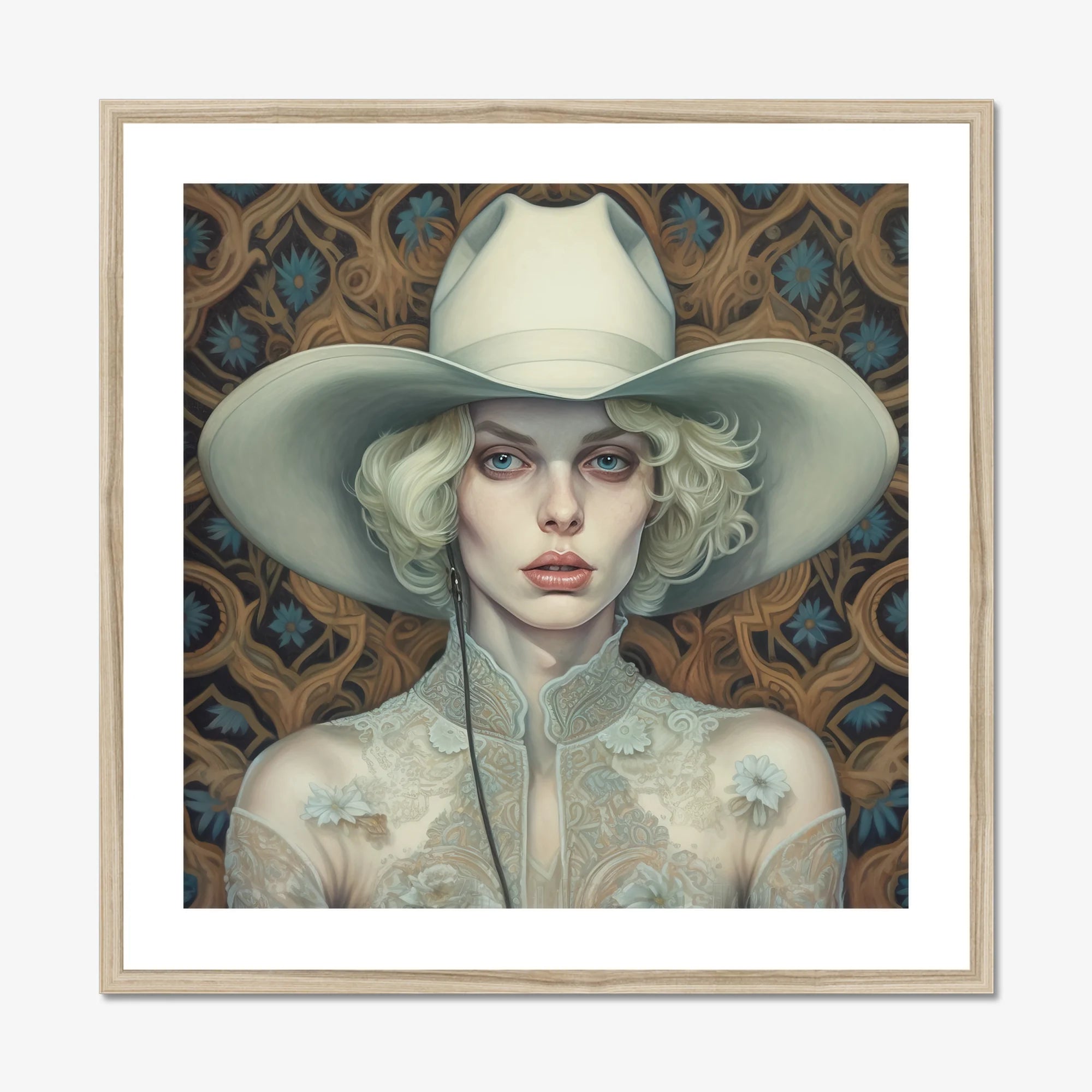 Su blusa victoriana de gasa está bordada con algo más antiguo que el tiempo—bordados florales floreciendo como prímulas del desierto tras una rara lluvia, sus hilos de gasa susurrando sobre legados de forajidas femeninas y los lenguajes secretos de los salones iluminados por la luna. Rizos de platino se enroscan como humo de pistola, suaves pero insistentes, enmarcando un rostro tan inescrutable como el campo abierto. Ella es una visión gótica del Oeste, donde la feminidad barroca se encuentra con el espíritu inquebrantable de la frontera—suave, indomable, imposible de olvidar.