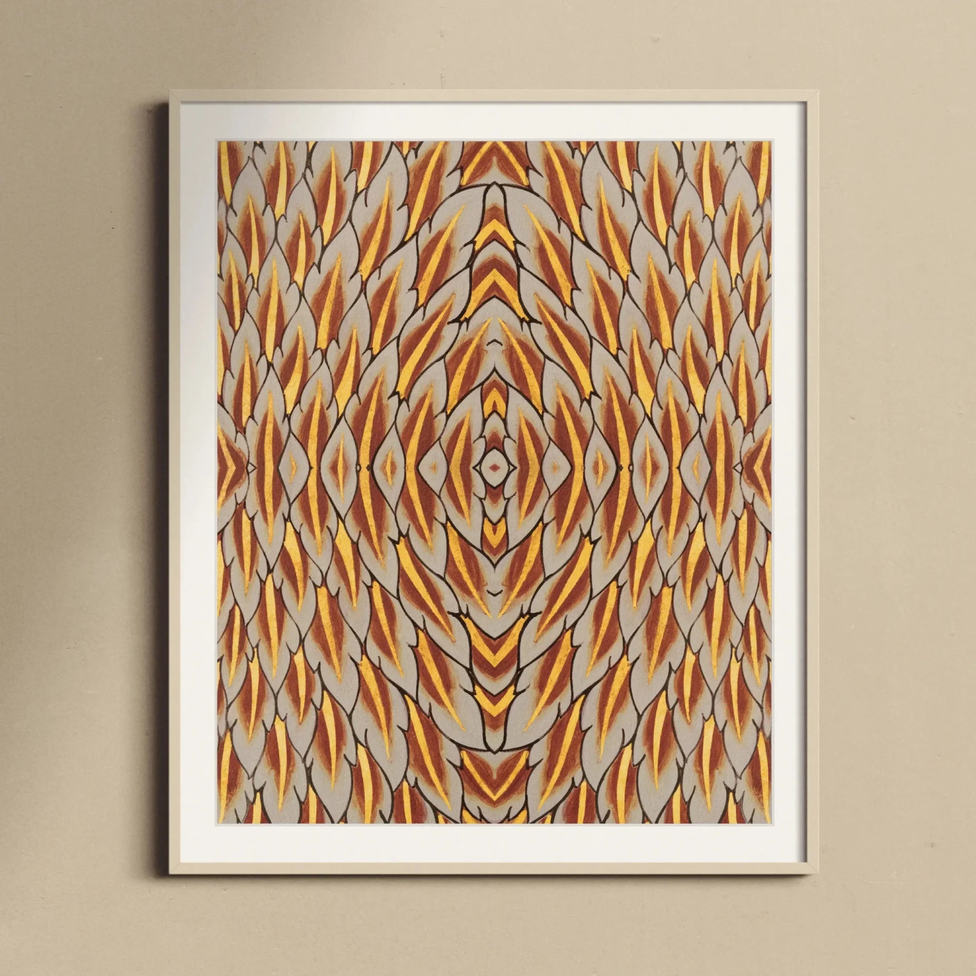 Cuelgue esta visión trascendental en su hogar e invitará a viajes diarios a través del tiempo y el espacio. La mirada fractalizada de la Garuda te llamará a explorar las profundidades de tu imaginación desde adentro hacia afuera y al lado de la pluma.