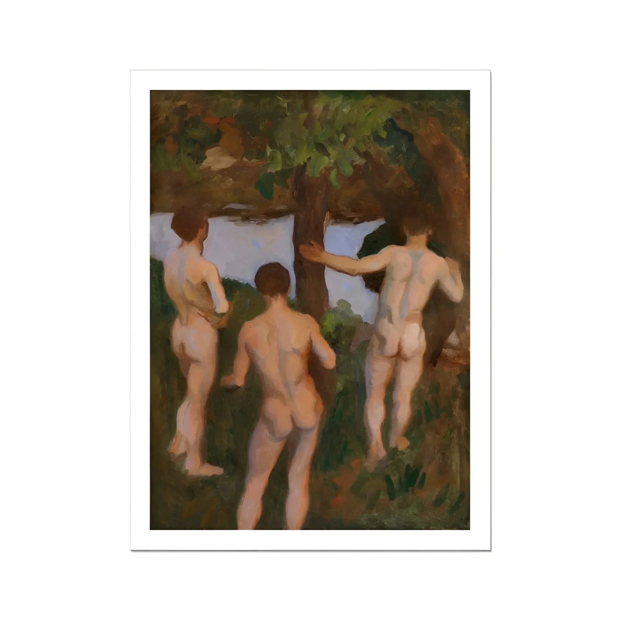 Tres figuras, desnudas y ágiles, se despliegan a lo largo de la orilla como una puntuación mítica—silenciosas pero declarativas, cada espalda vuelta como si descifraran el lenguaje del agua. Boys on the Beach de Ferenczy no es un idilio; es un rito. Extremidades representadas en melocotón magullado y marfil sonrojado se enroscan alrededor de un árbol como si fuera tanto altar como testigo. Un chico levanta un brazo. A medio gesto, medio ofrecimiento. Levantado como un ala lista para volar por primera vez.