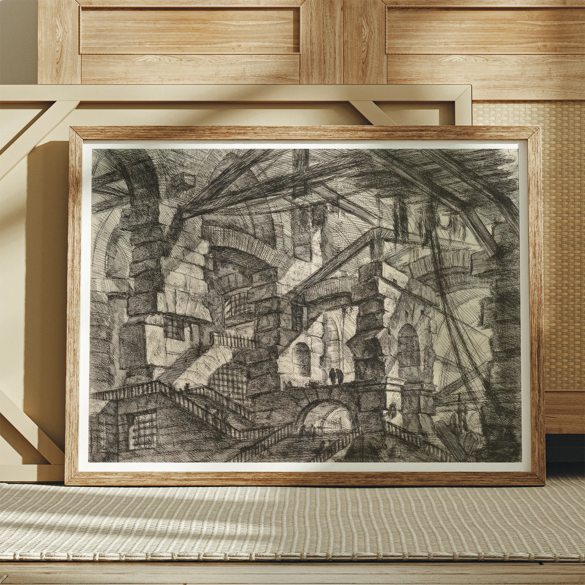 Arcos anudan sobre un espacio demasiado vasto para medir. El aire está cargado de hierro, polvo e invención. Piranesi dibuja la eternidad como un error de ingeniería: las escaleras se retuercen, los puentes se inclinan hacia la absurdidad, las sombras generan incertidumbre.