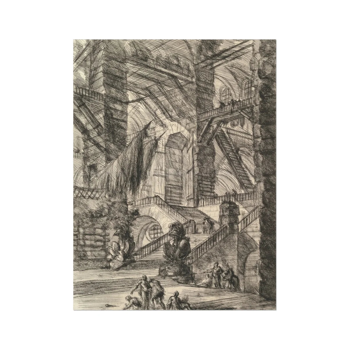 Trofeos—armaduras rotas, cabezas laureadas—presiden sobre corredores demasiado vastos para la misericordia. Piranesi convierte la arquitectura en confesión: ambición grabada hasta que se descompone. Escaleras se inclinan hacia la locura, no conduciendo hacia arriba sino hacia adentro, hacia el abismo del diseño humano.