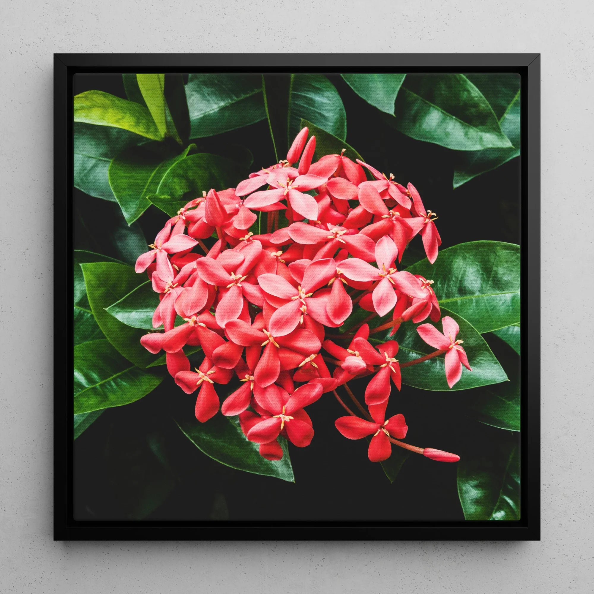 La * belleza de la pelota - Árbol de llama del bosque flotando lienzo enmarcado * Encapsula la elegancia dramática de la ixora china, que ofrece una pieza central audaz y sofisticada para cualquier habitación.