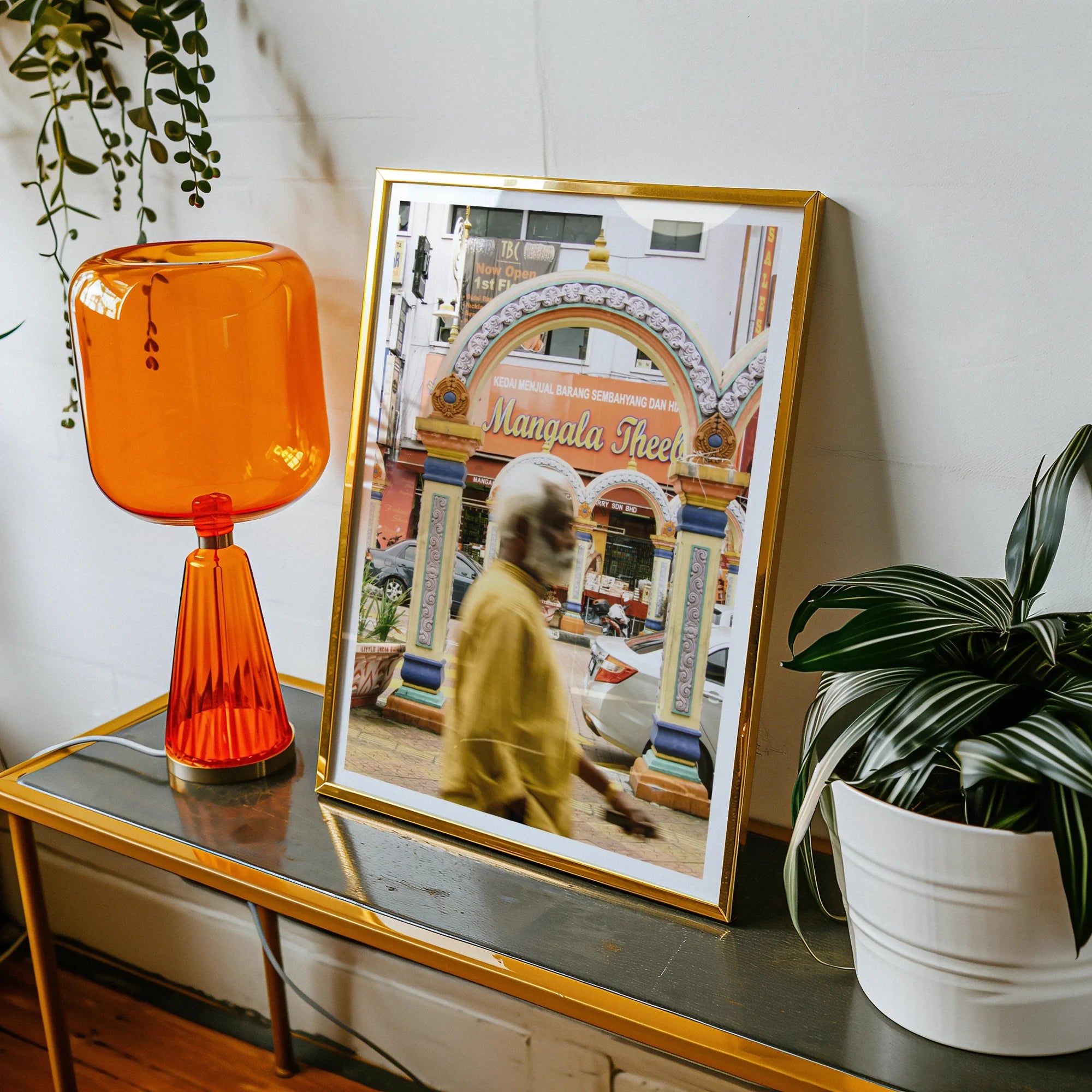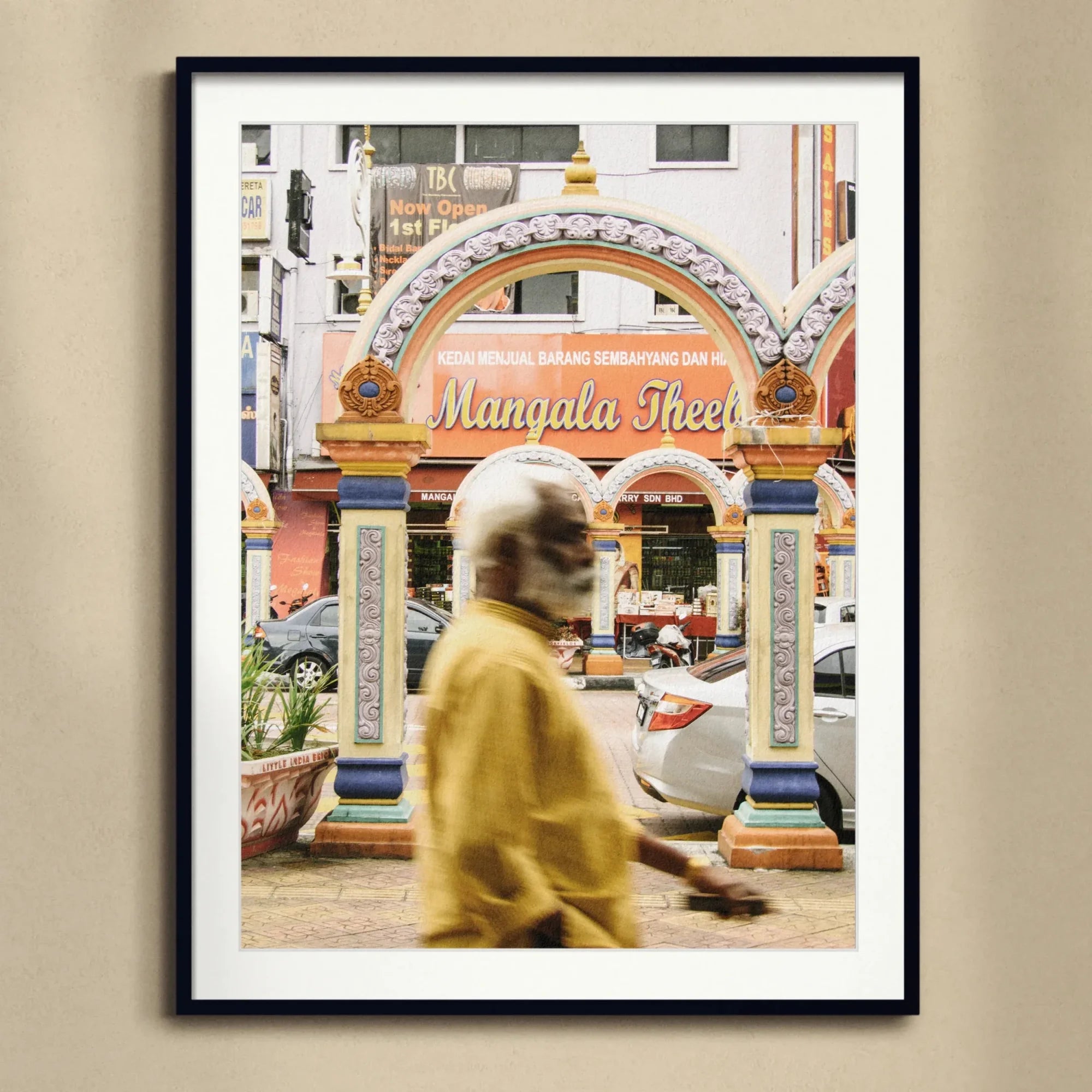 Esta impresionante impresión de fotografía callejera captura el corazón palpitante de Brickfields, la vibrante Pequeña India de Kuala Lumpur. Un anciano vestido de dorado se desliza junto a los arcos ornamentados de Mangala Theebam, una tienda que vende artículos religiosos, encarnando la rica herencia tamil del área.