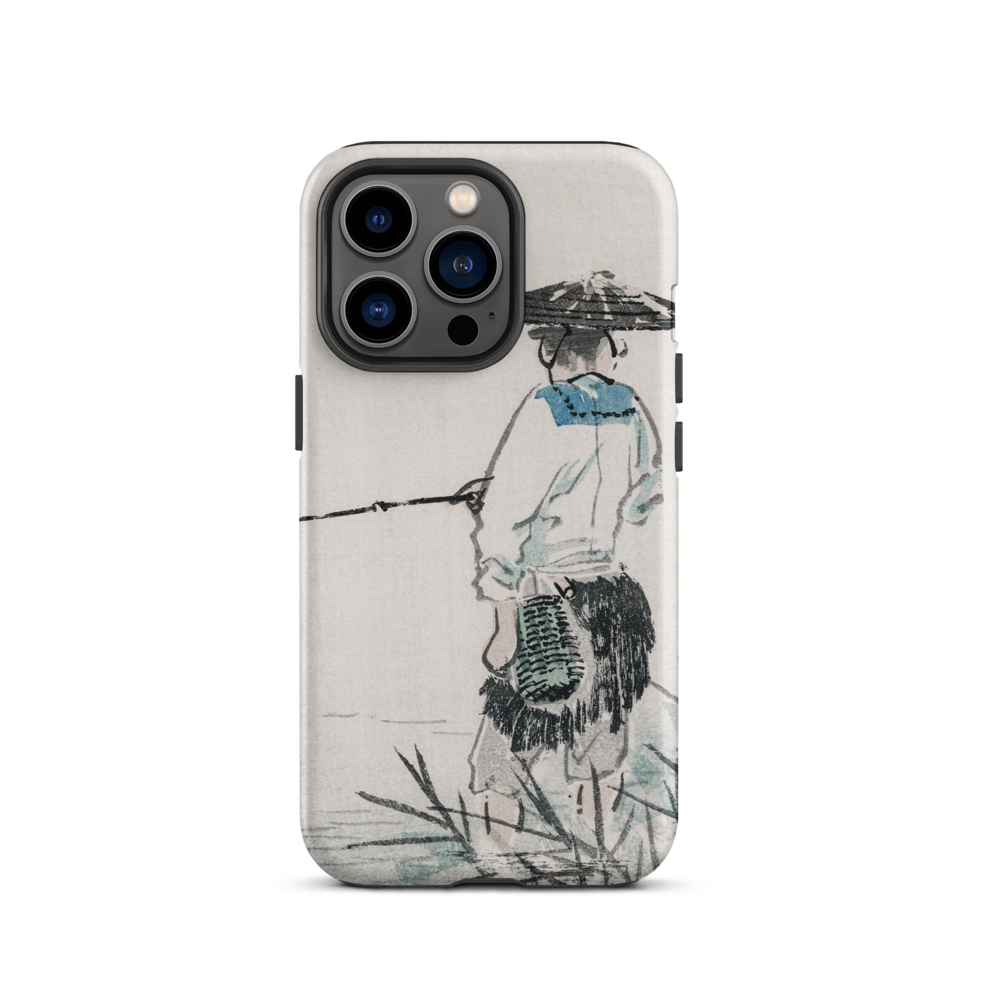 Sosteniendo esta funda para iPhone de la era Meiji, sentirás el peso de las cañas de bambú en tu mano, el peso de las cestas tejidas contra tu cadera. La túnica azulada del pescador ondea con cada lanzamiento, una danza de paciencia y habilidad grabada en delicadas líneas. Los trazos minimalistas de Bairei evocan la esencia del Japón rural, un haiku visual en tu dispositivo.