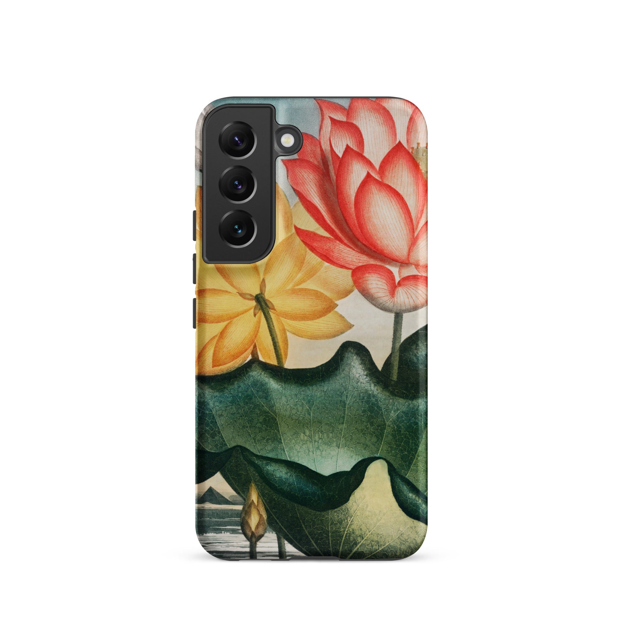 La flor de color rojo coral se abre con un calor silencioso, el gemelo amarillo ocre inclinándose hacia ella a través de un estanque pintado. Debajo, un capullo espera, acunado en sombras. Y contra el pálido lavado del cielo, este estuche de Samsung se convierte en archivo y amuleto. Protegiendo tu dispositivo con grandeza botánica, sosteniendo la tranquila opulencia de los jardines del Nilo en tu mano.