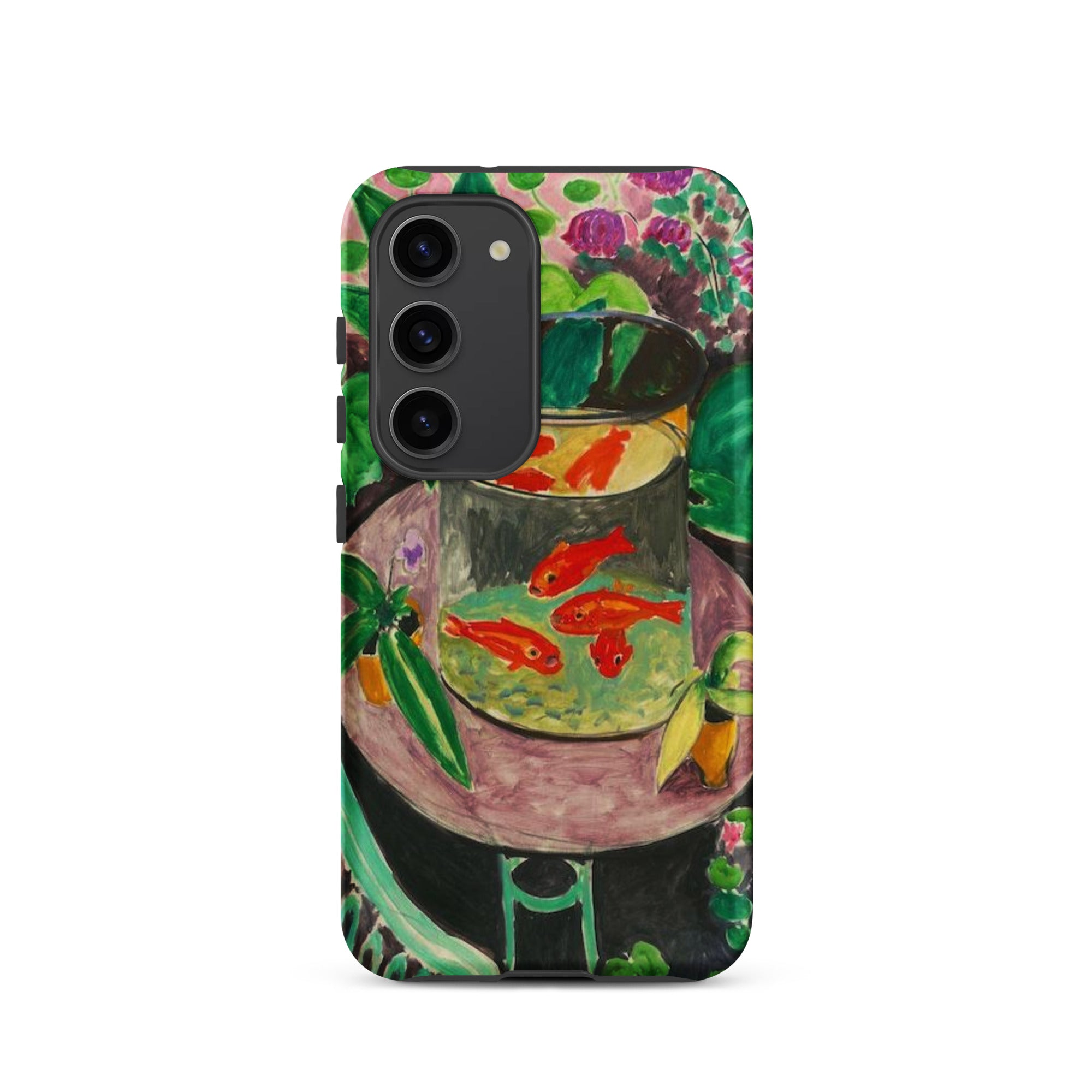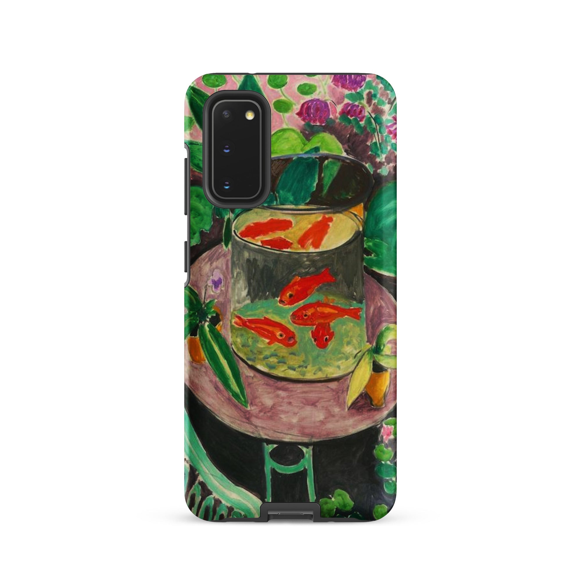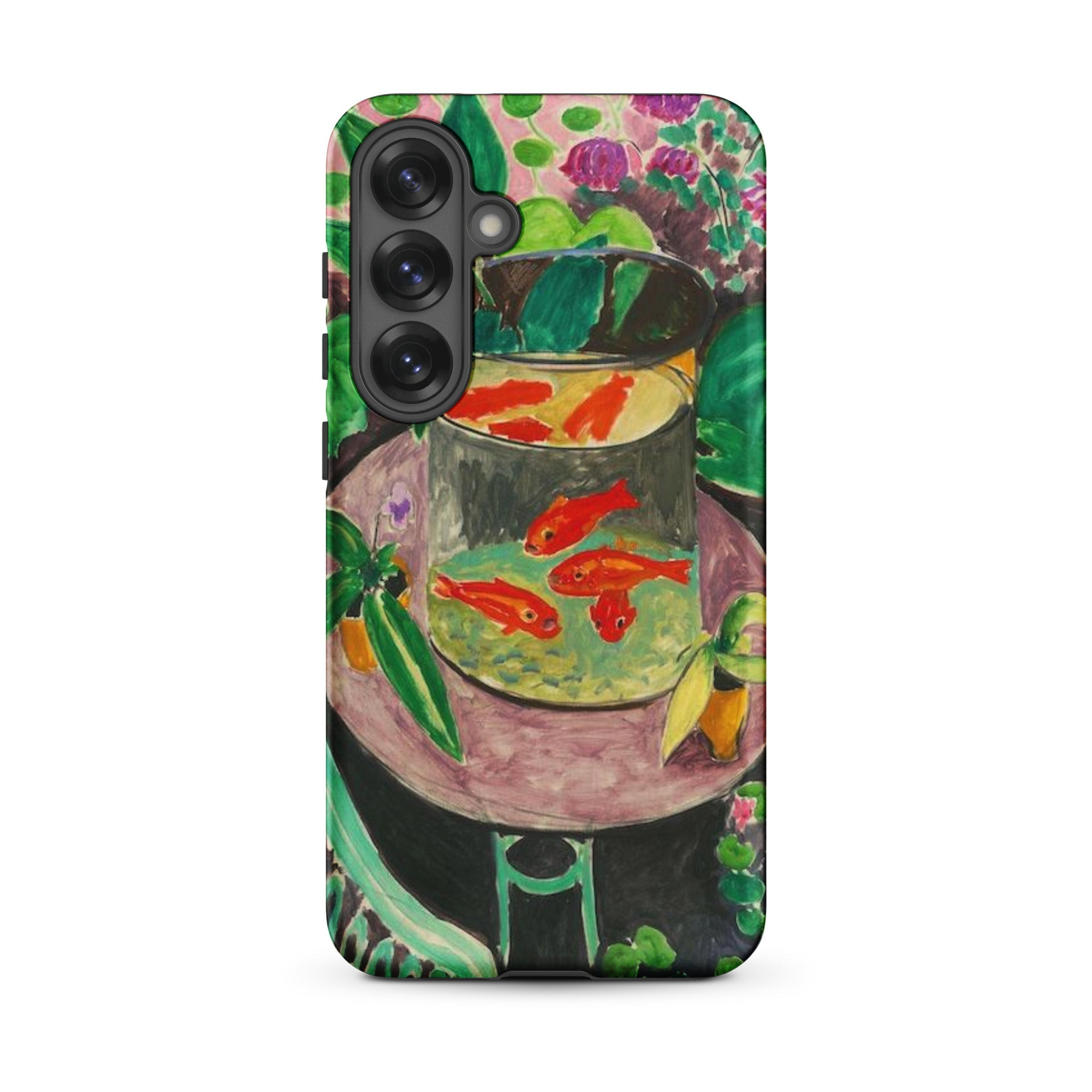 La mesa inclinada crea una sensación de equilibrio precario, como si los peces pudieran deslizarse del agua pintada al aire que respiras. Esta funda de Samsung captura ese momento, sellando la audacia fauvista de Matisse y su pincelada saturada alrededor de tu teléfono. No es solo una reproducción; es una naturaleza muerta portátil, viva con el amor del artista por el patrón, la colisión de colores y la mirada hipnótica de los peces suspendidos entre el reflejo y la realidad.