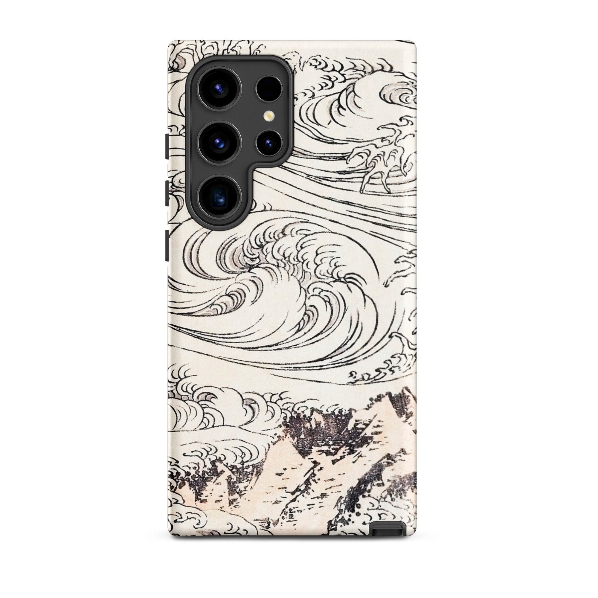 El trabajo de líneas negras lleva la tensión del pincel sobre papel de morera, cada contorno vivo con la maestría del período Edo. La superficie de este estuche Samsung se convierte en un teatro de movimiento: las olas se curvan en crecientes con garras, el rocío se retuerce en finos zarcillos, las caras de los acantilados emergen del torbellino como antiguos centinelas.