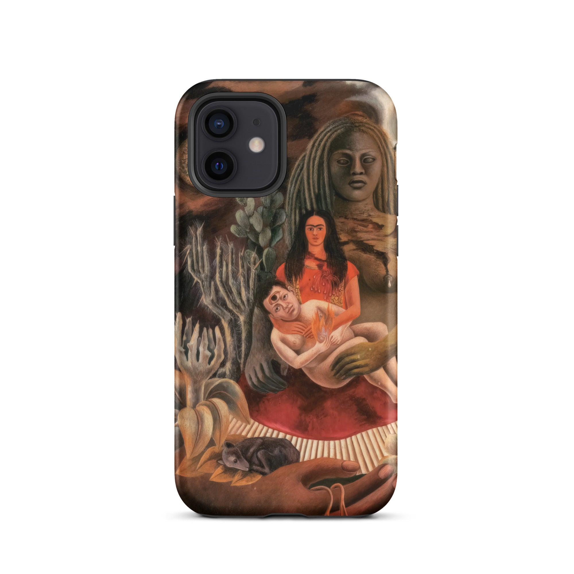 El abrazo amoroso del universo de Frida Kahlo cubre esta funda de iPhone con una ternura feroz: la artista representada en un huipil carmesí, acunando a Diego Rivera como un infante, sus formas envueltas por manos colosales, cactus, tonos tierra y una figura materna estoica. Cada contorno tiembla con su simbolismo surrealista, enraizado en el dolor, la fertilidad, la mortalidad y la devoción.