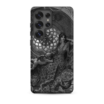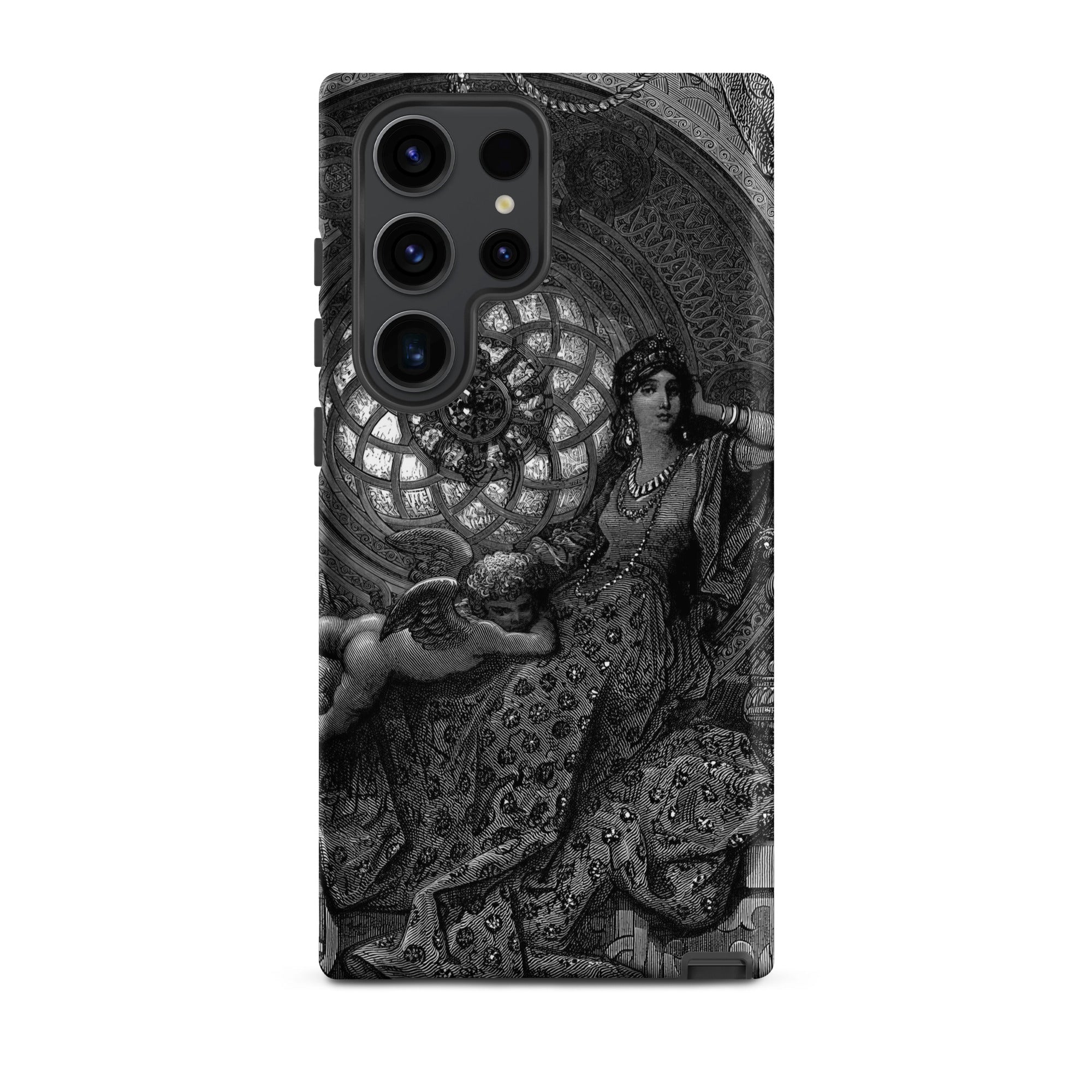 Este estuche de Samsung escenifica la visión de Doré de Alcina, su mirada directa, su postura cargada de un atractivo soberano. La composición organiza su cuerpo drapeado contra un óculo radiante, cuyo diseño concéntrico amplifica su dominio hechizado.