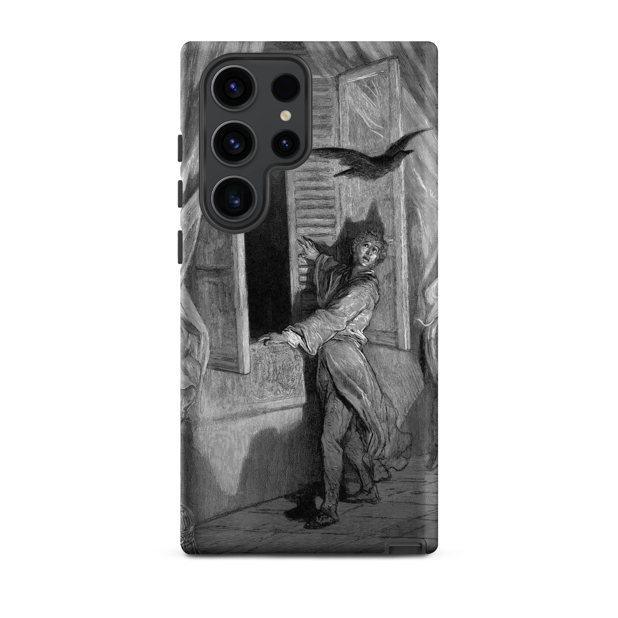 Este estuche de Samsung captura la obra maestra de Doré para El Cuervo de Poe, una imagen impregnada de la imaginación gótica de finales del siglo XIX. El joven se tambalea desde la persiana abierta, con el rostro iluminado por el pánico, mientras el pájaro negro cruza el umbral.