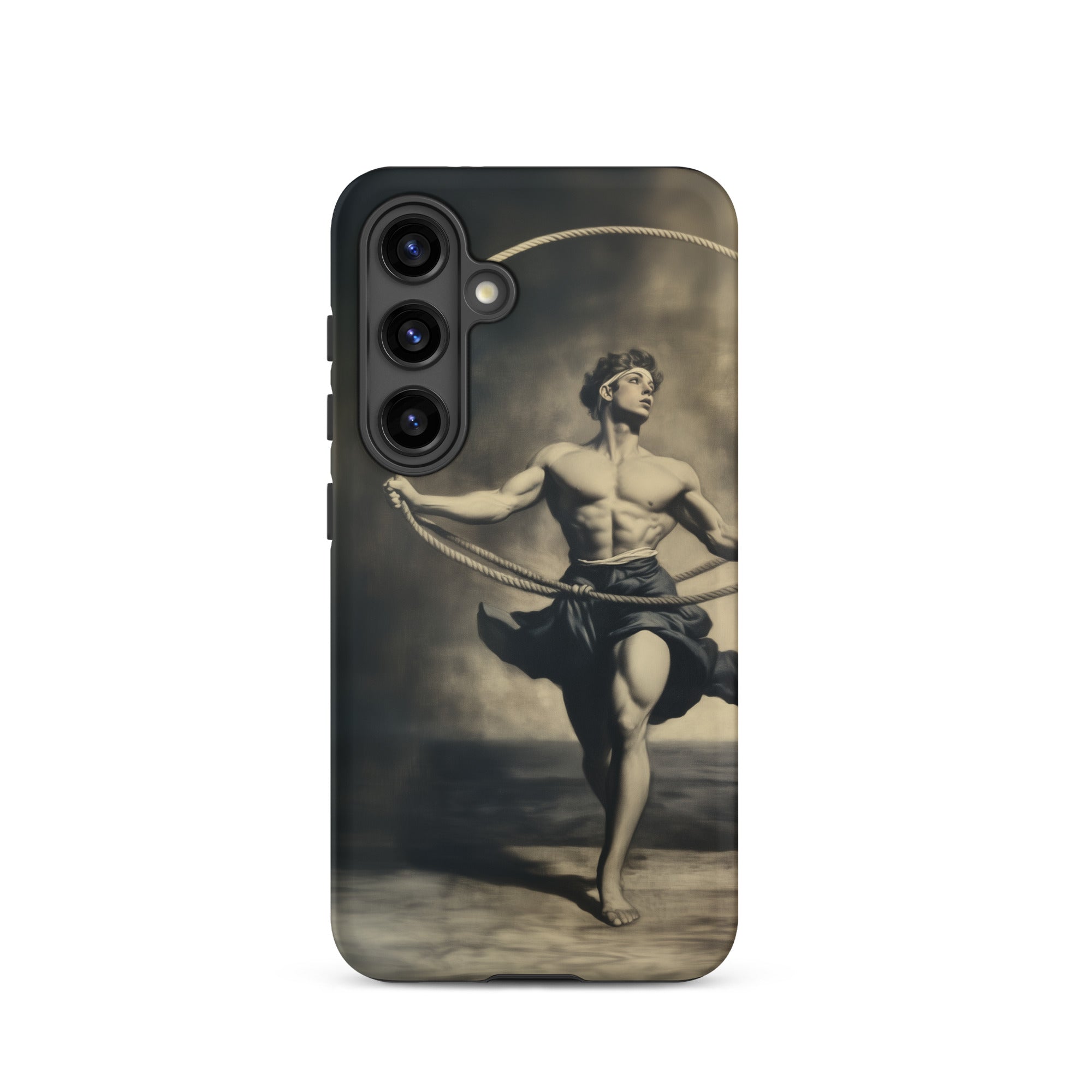 Una figura solitaria domina la arena del mito, su cuerpo esculpido en la neblina de claroscuro del teatro neoclásico. La cuerda se arquea como una órbita dorada, enmarcando el disciplinado abultamiento del músculo, la tensa postura de un intérprete que sabe que la multitud se pliega a su ritmo.