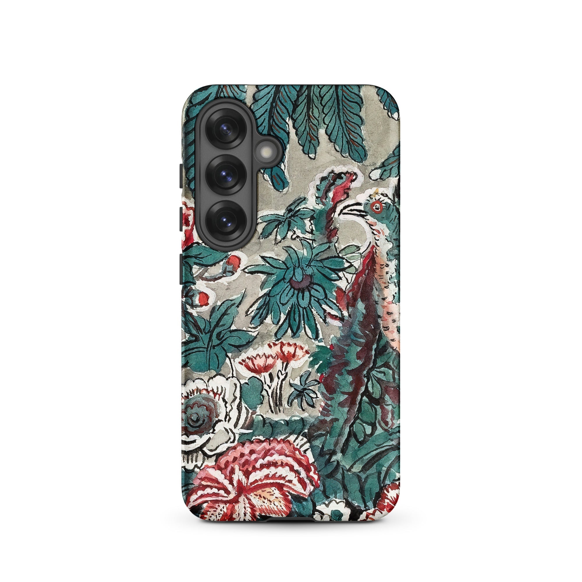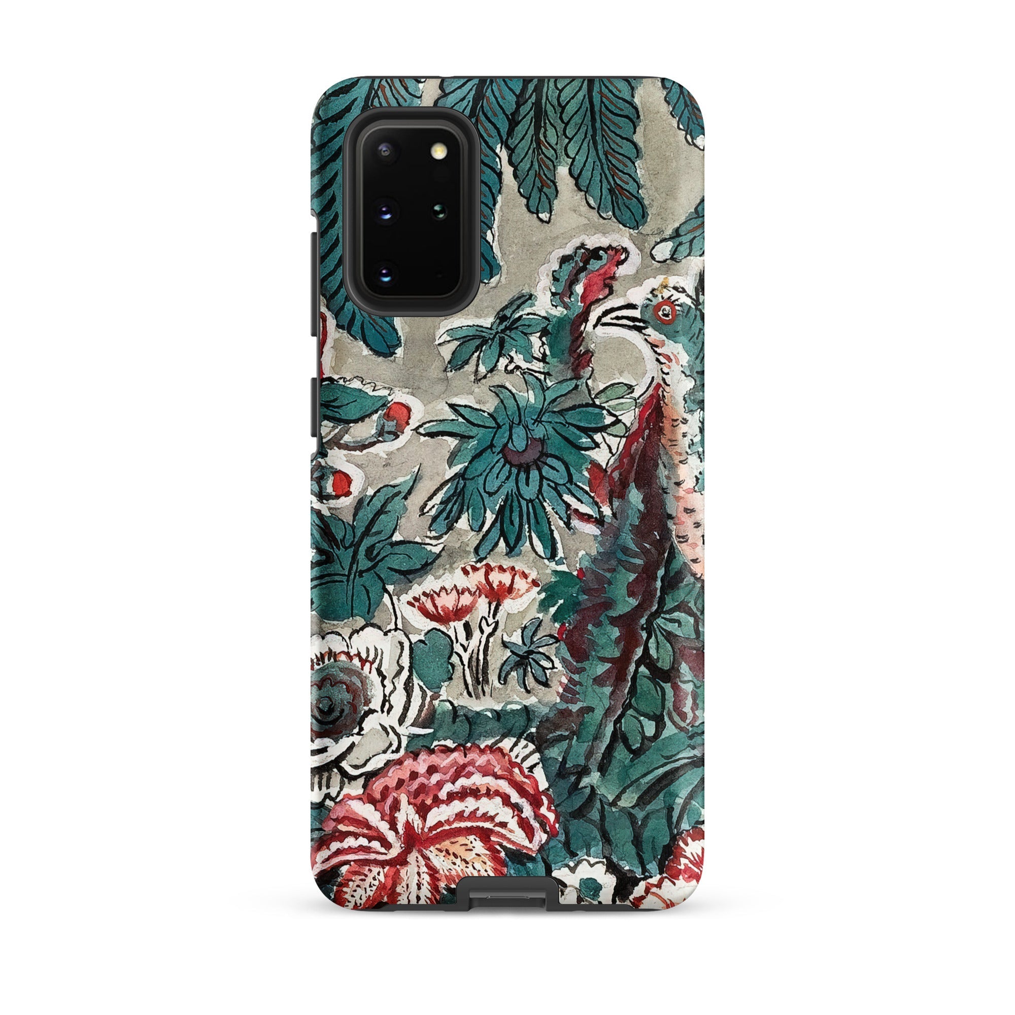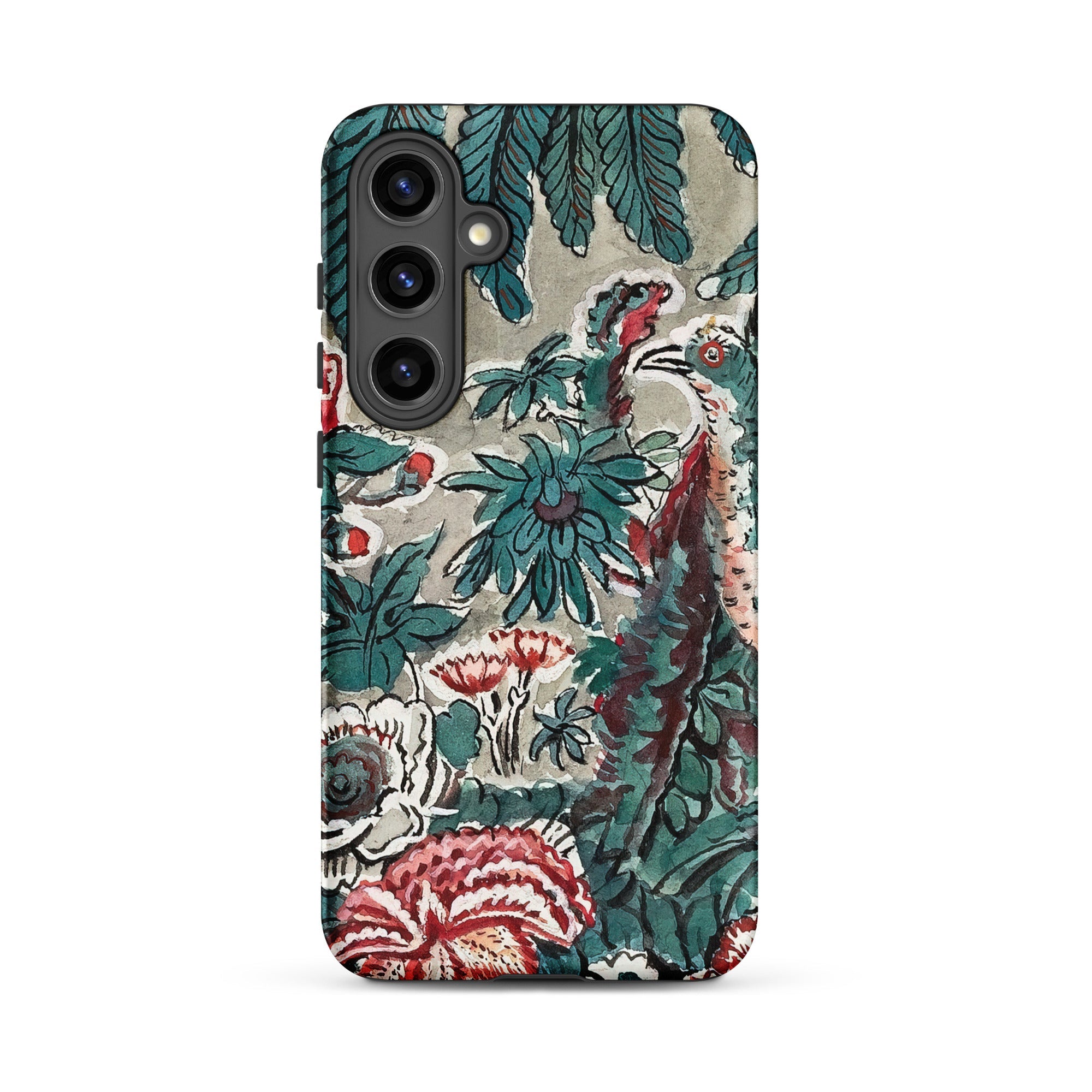 Un enredo de follaje verde azulado y sueños con plumas carmesí se extiende por esta funda de Samsung, evocando la maestría de chintz de George Loughridge. Flores exóticas se inclinan hacia un pájaro de largo plumaje, su perfil capturado en el silencio antes del canto.