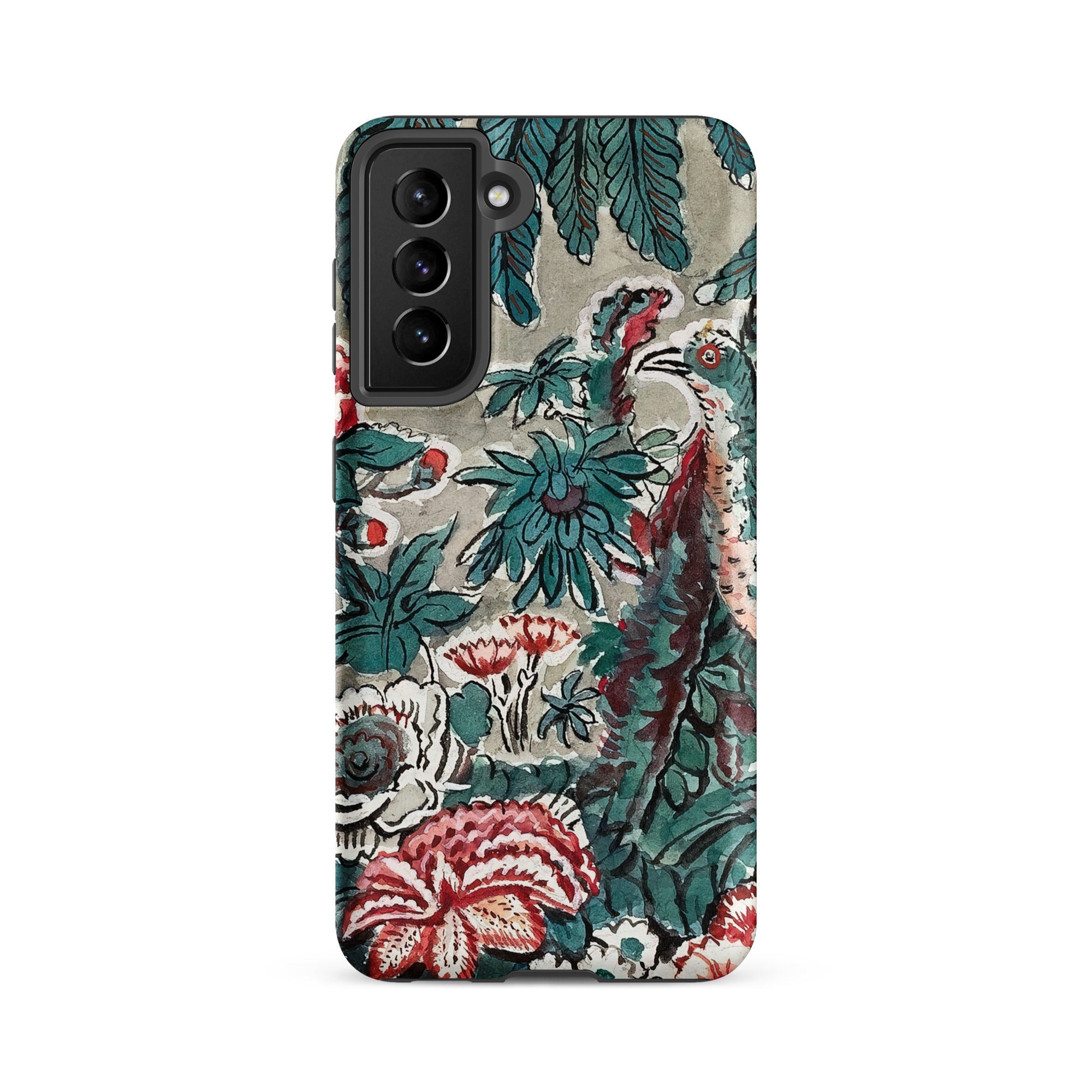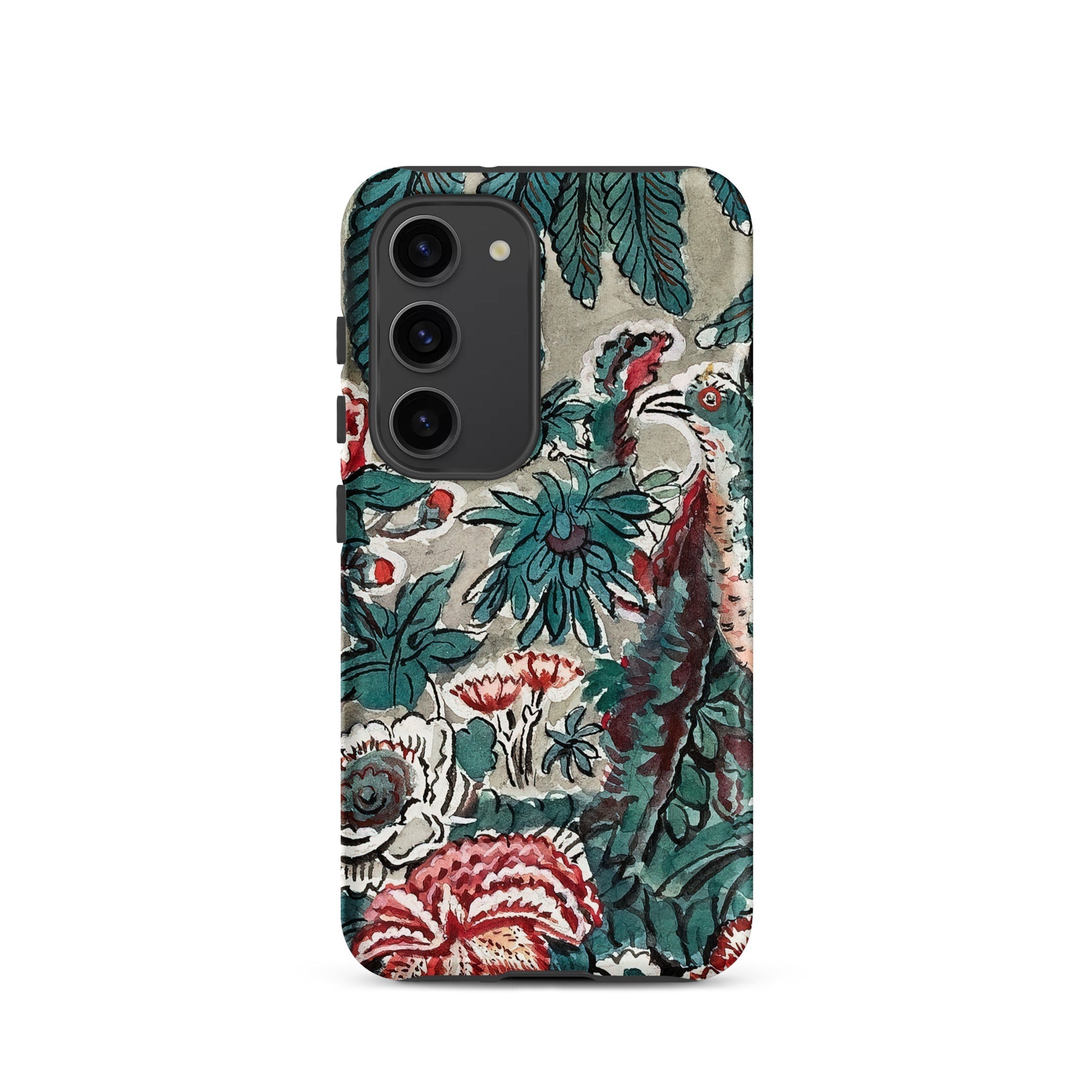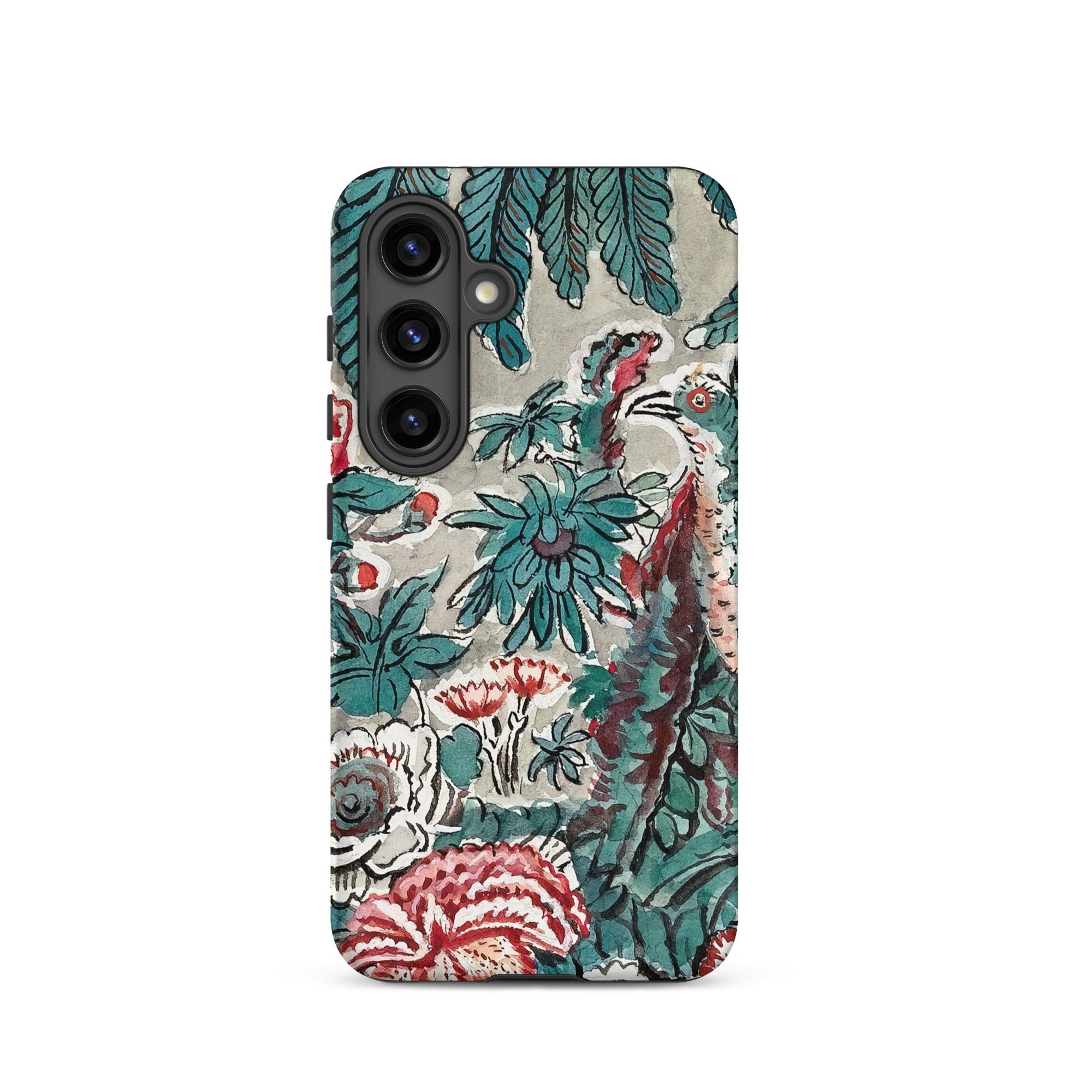 Un enredo de follaje verde azulado y sueños con plumas carmesí se extiende por esta funda de Samsung, evocando la maestría de chintz de George Loughridge. Flores exóticas se inclinan hacia un pájaro de largo plumaje, su perfil capturado en el silencio antes del canto.