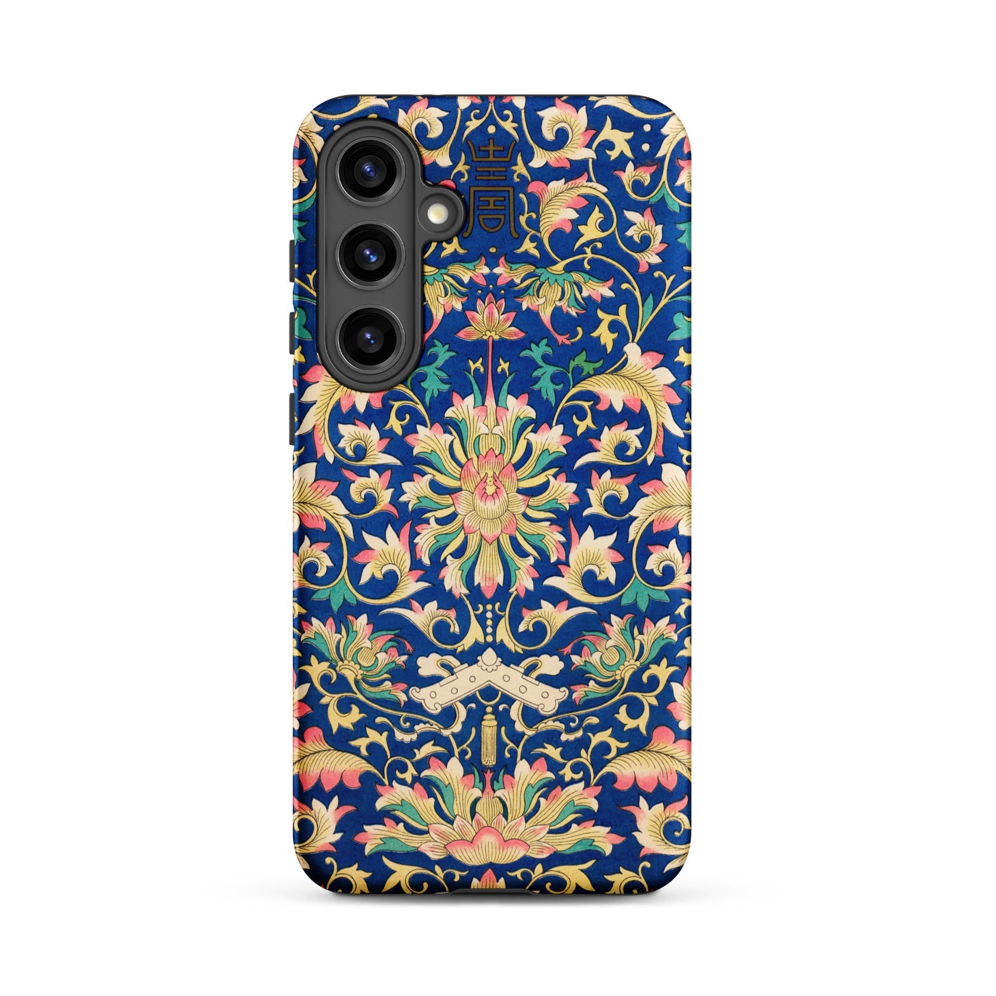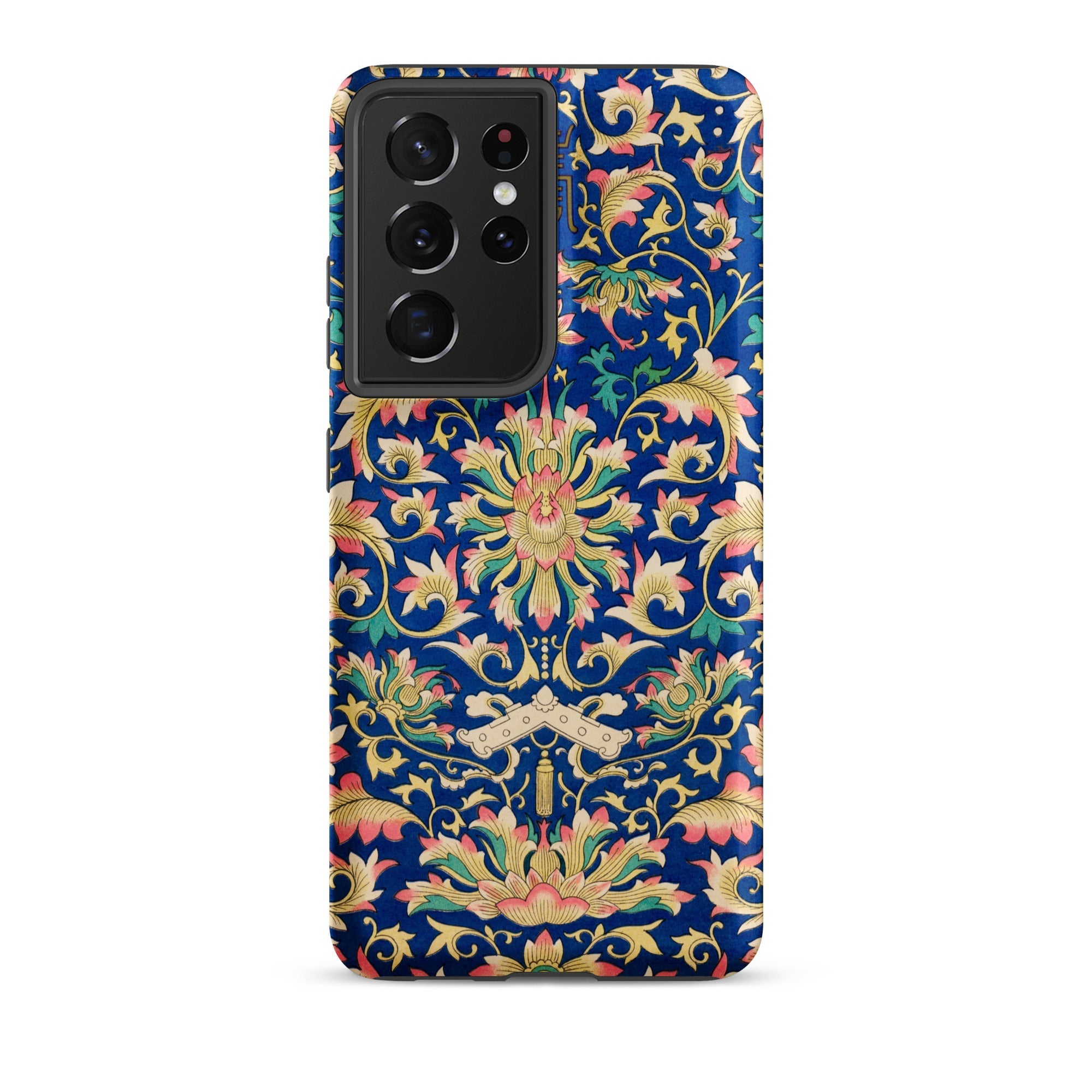 Esta funda de Samsung lleva un doble patrimonio: la fantasía de pagodas lejanas y patios iluminados por la luna, destilada en un talismán portátil de superficie vidriosa de la reforma del diseño del siglo XIX y la ornamentación intercultural.