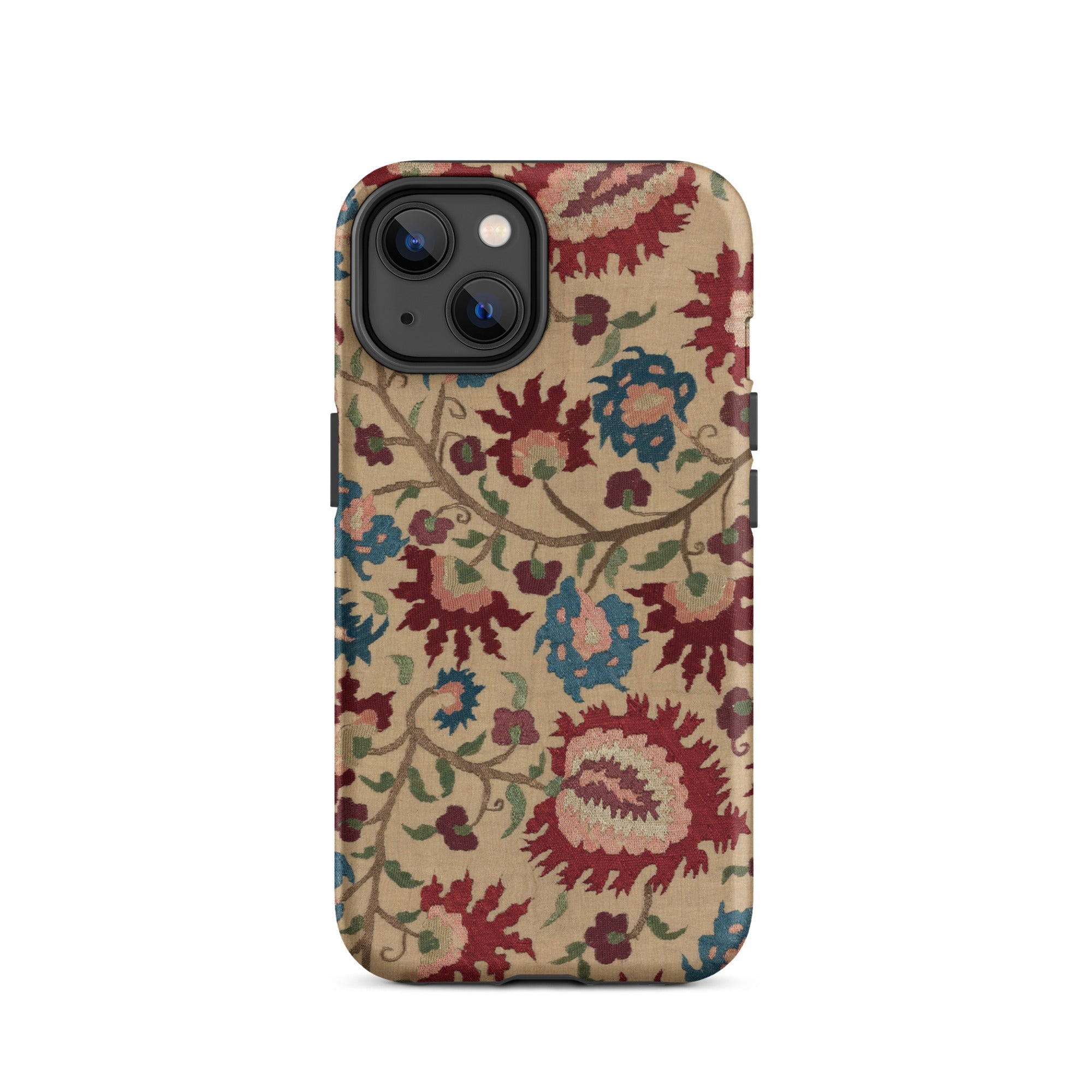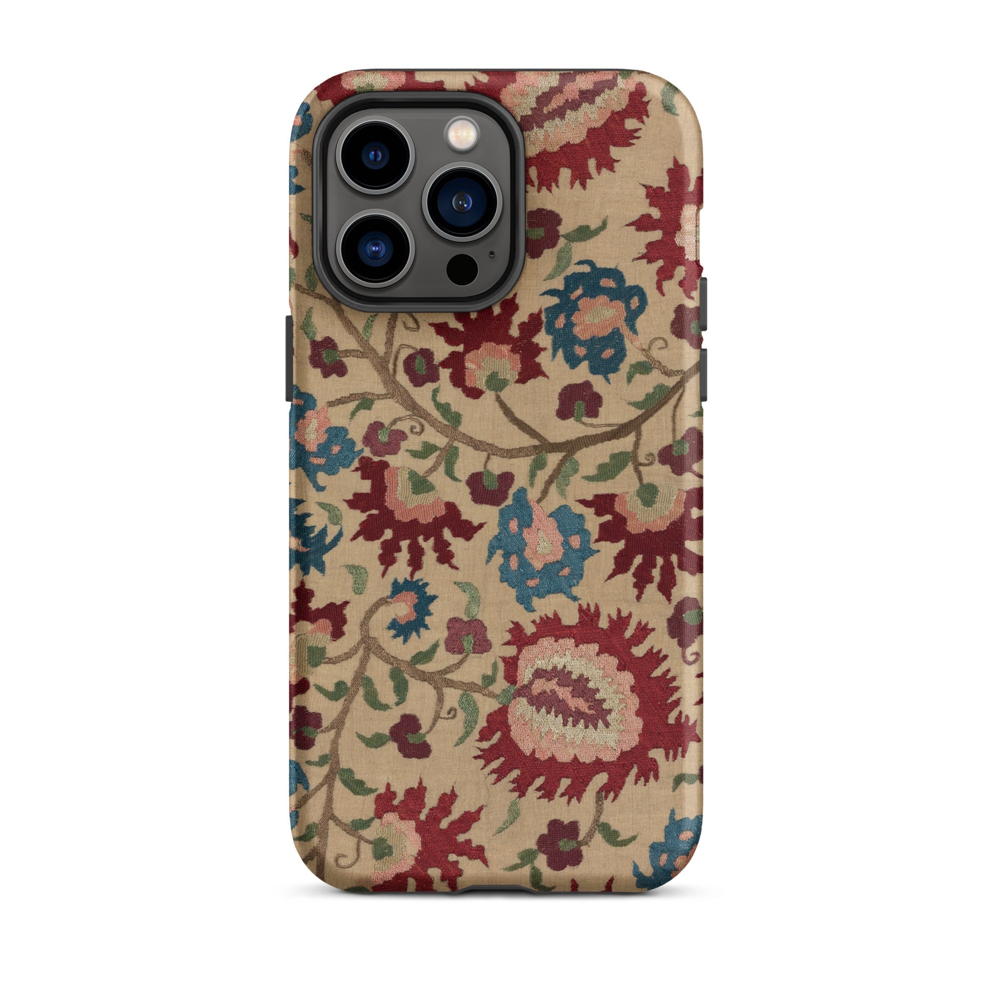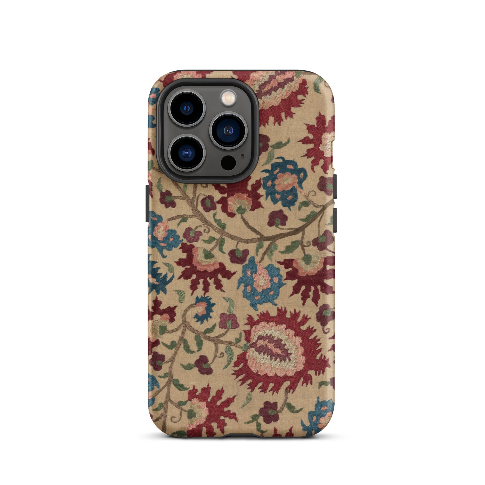 Esta funda de iPhone es un portador de susurros ancestrales: vestida con los fantasmas florecientes de sábanas nupciales y manteles impregnados de mito y vino de moras. Una enredadera de claveles de sangre veneciana se enrolla con arabescos otomanos, desplegándose por la superficie como un encantamiento folclórico, bordado no en hilo, sino en permanencia pixelada.