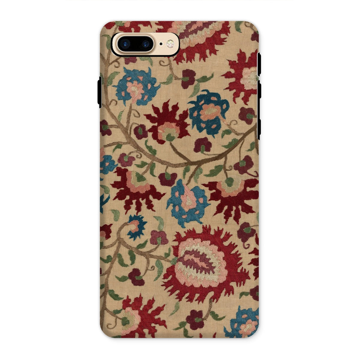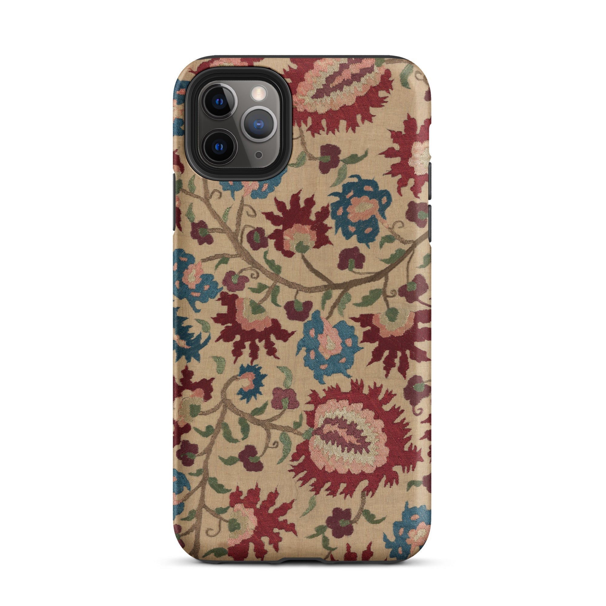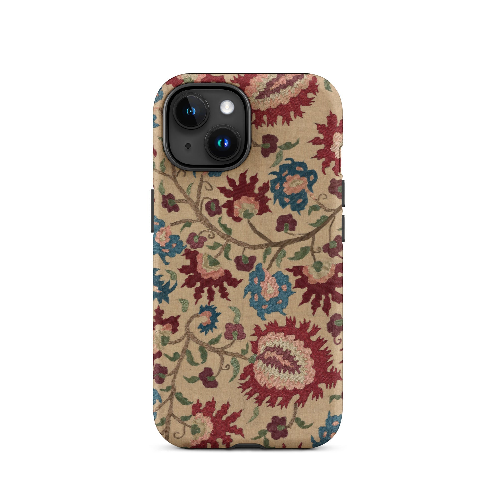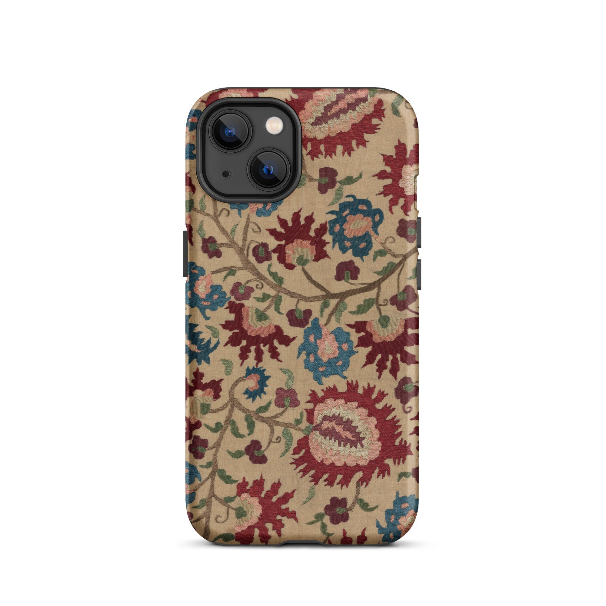 Esta funda de iPhone es un portador de susurros ancestrales: vestida con los fantasmas florecientes de sábanas nupciales y manteles impregnados de mito y vino de moras. Una enredadera de claveles de sangre veneciana se enrolla con arabescos otomanos, desplegándose por la superficie como un encantamiento folclórico, bordado no en hilo, sino en permanencia pixelada.