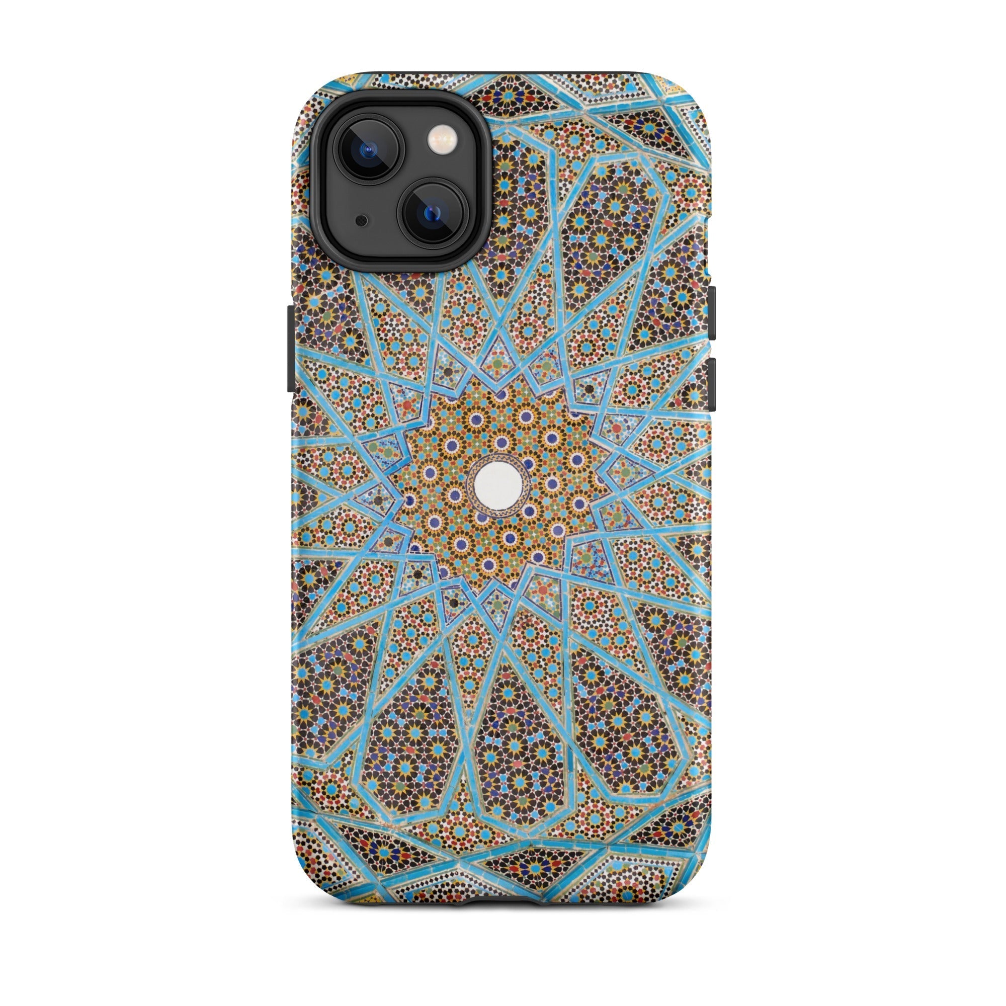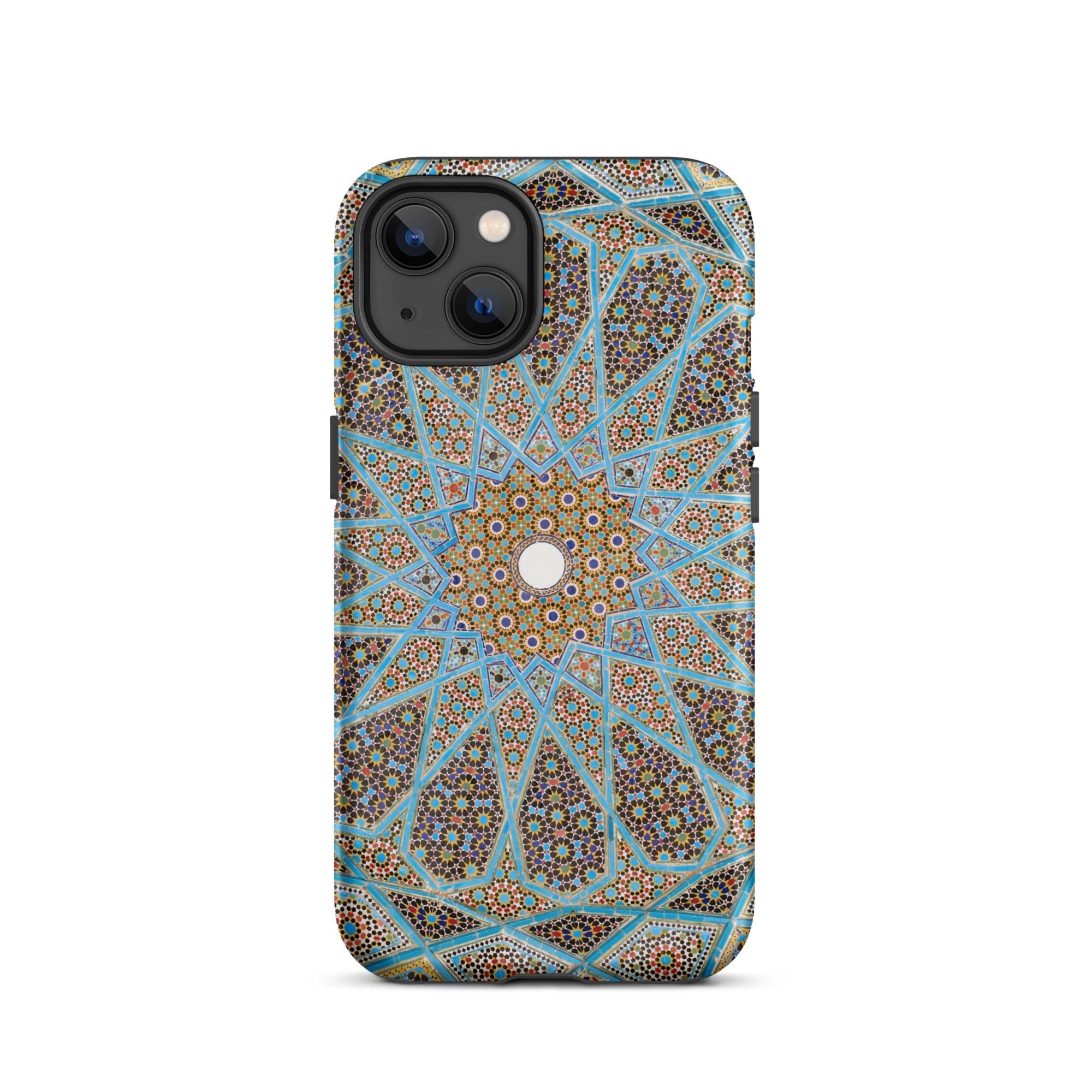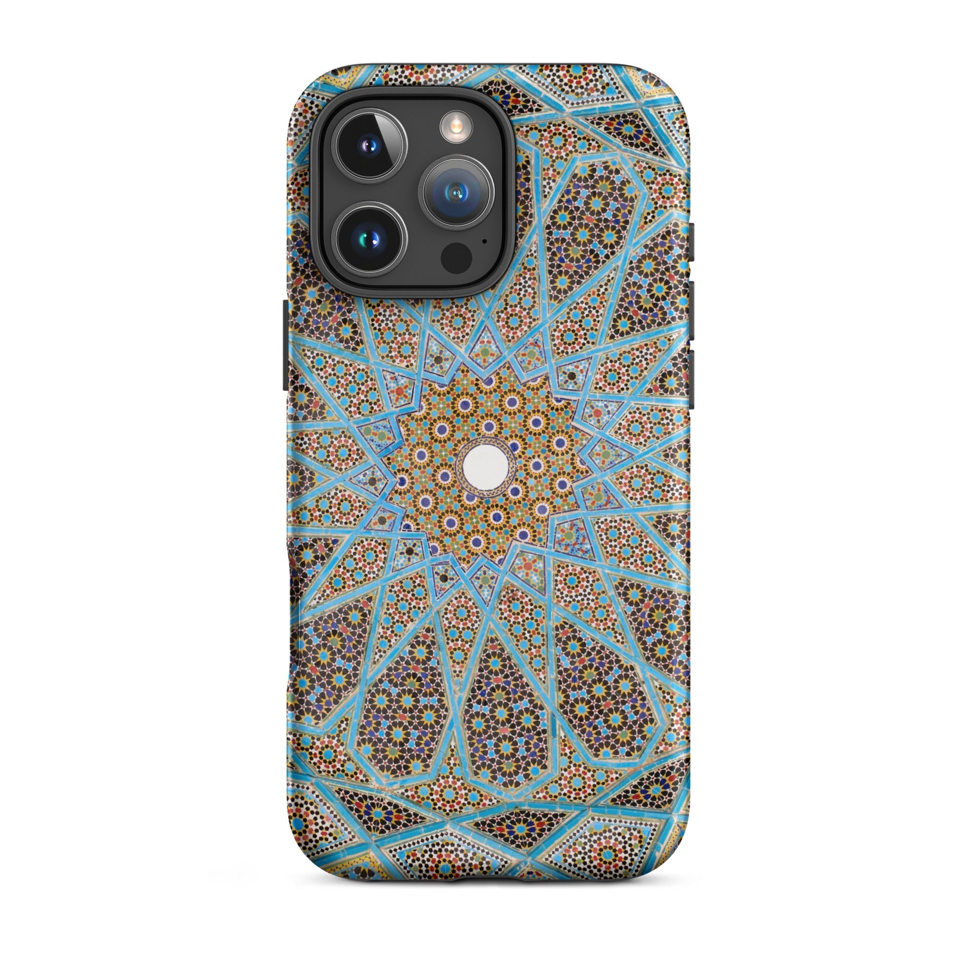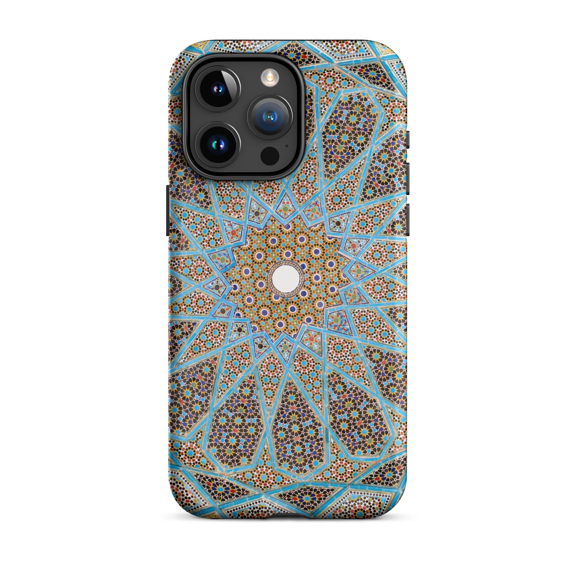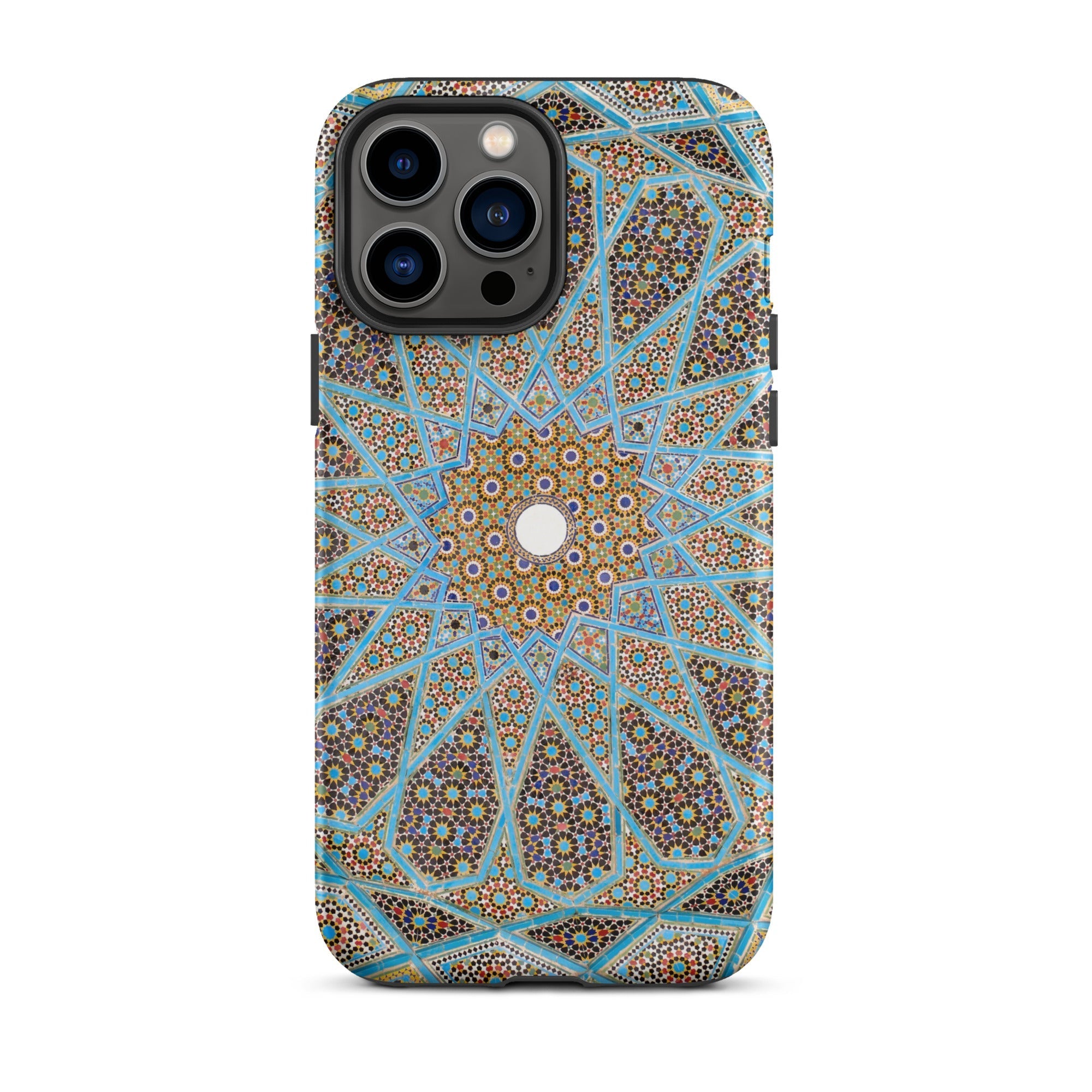 Una cúpula de versos, congelada en vuelo. Esta funda de iPhone lleva la bóveda del cielo de Shiraz: el techo de mosaico sobre la tumba de mármol de Hafez, donde la geometría y la devoción forman una sola gramática luminosa. De doce rayos como un sol de alfabetos olvidados, el patrón se inspira en el enrejado girih y las muqarnas persas, haciendo eco de las propias metáforas recursivas del poeta: mundos anidados dentro de suspiros.
