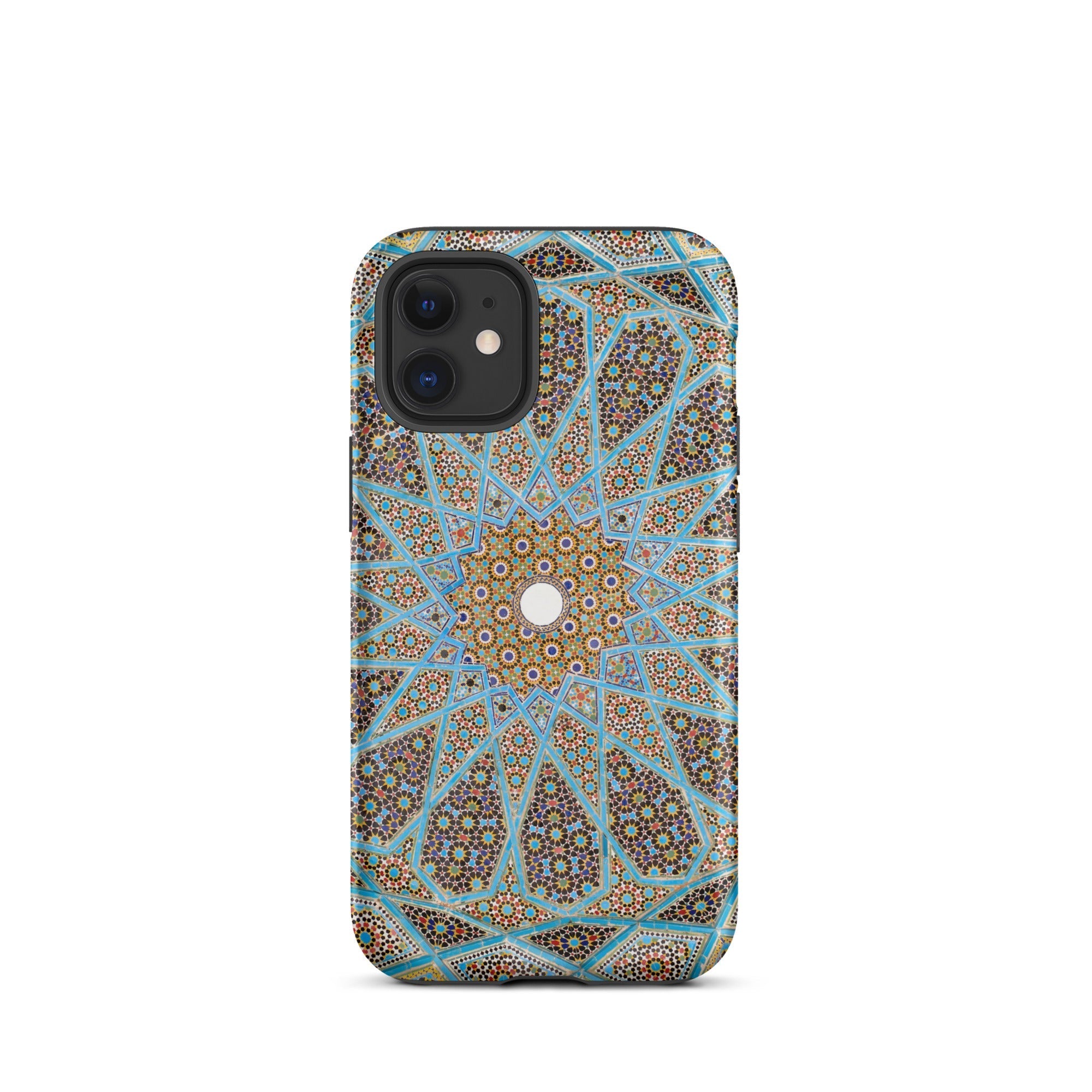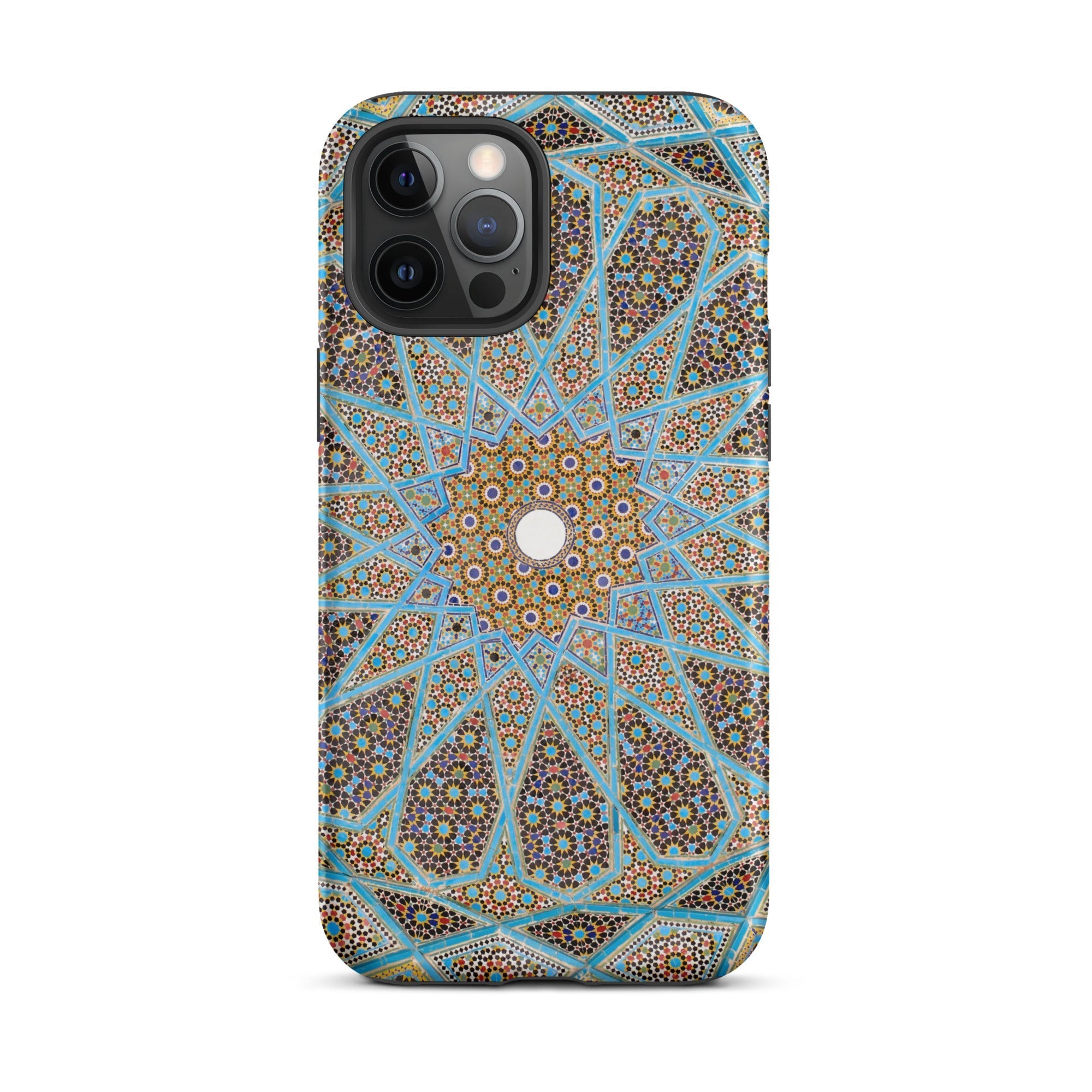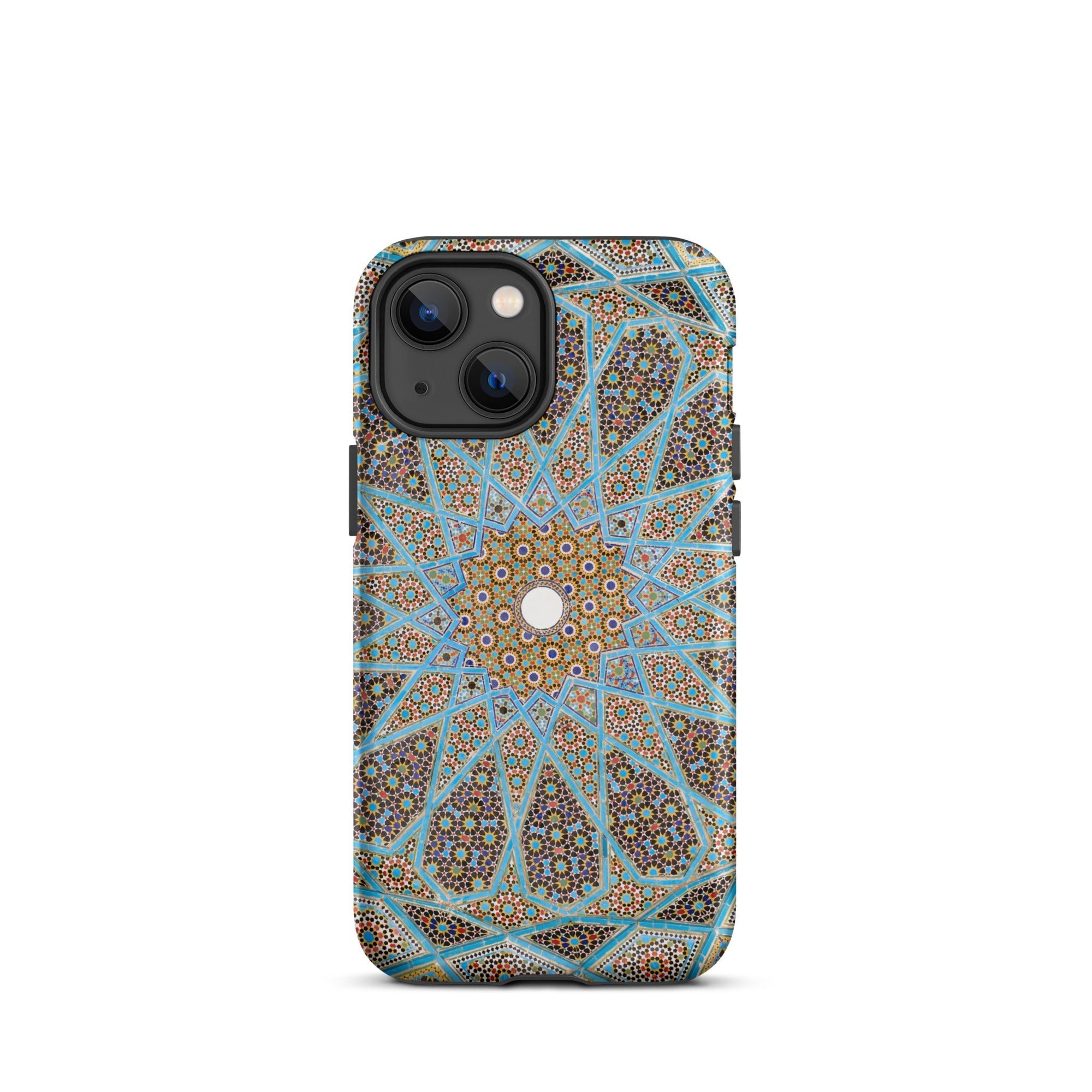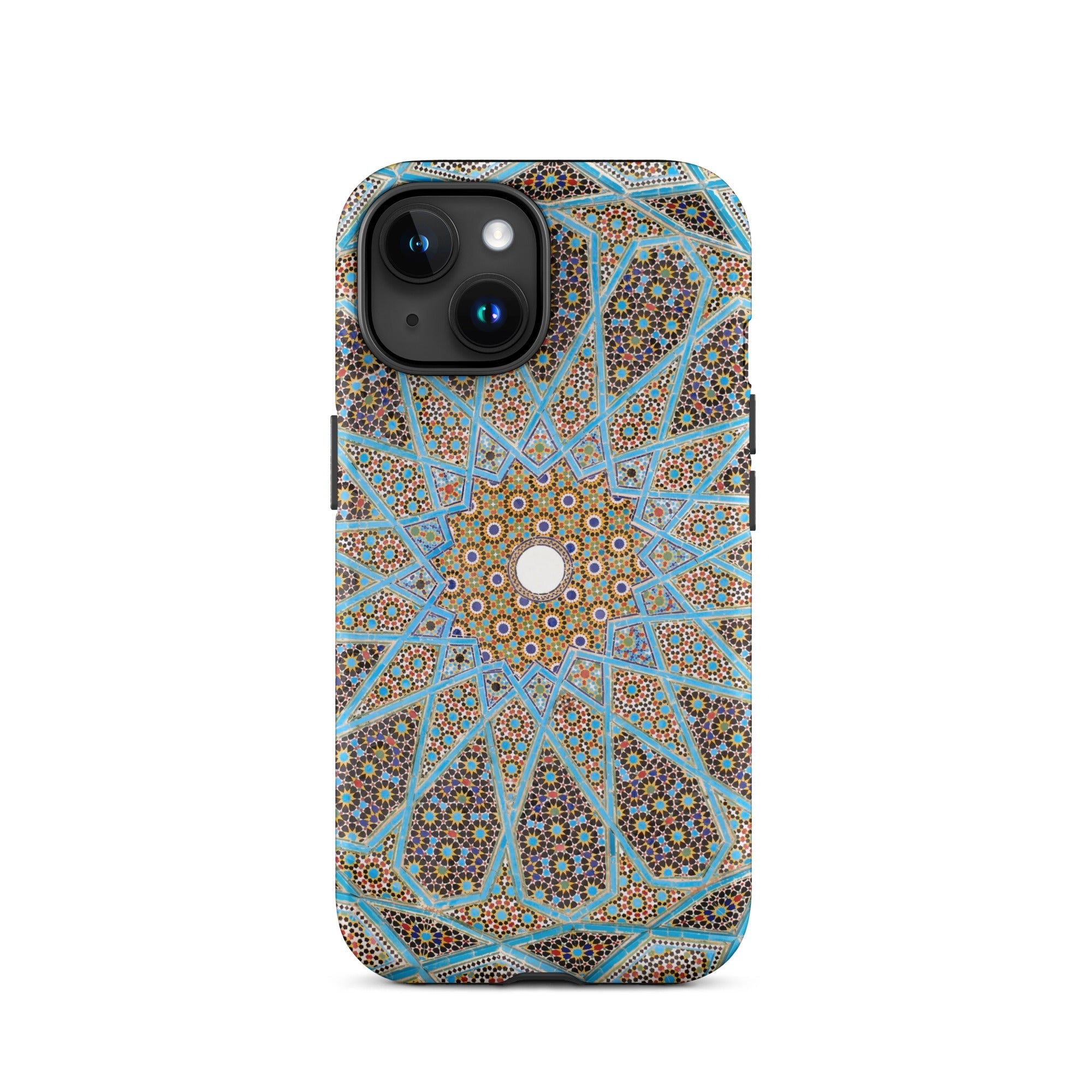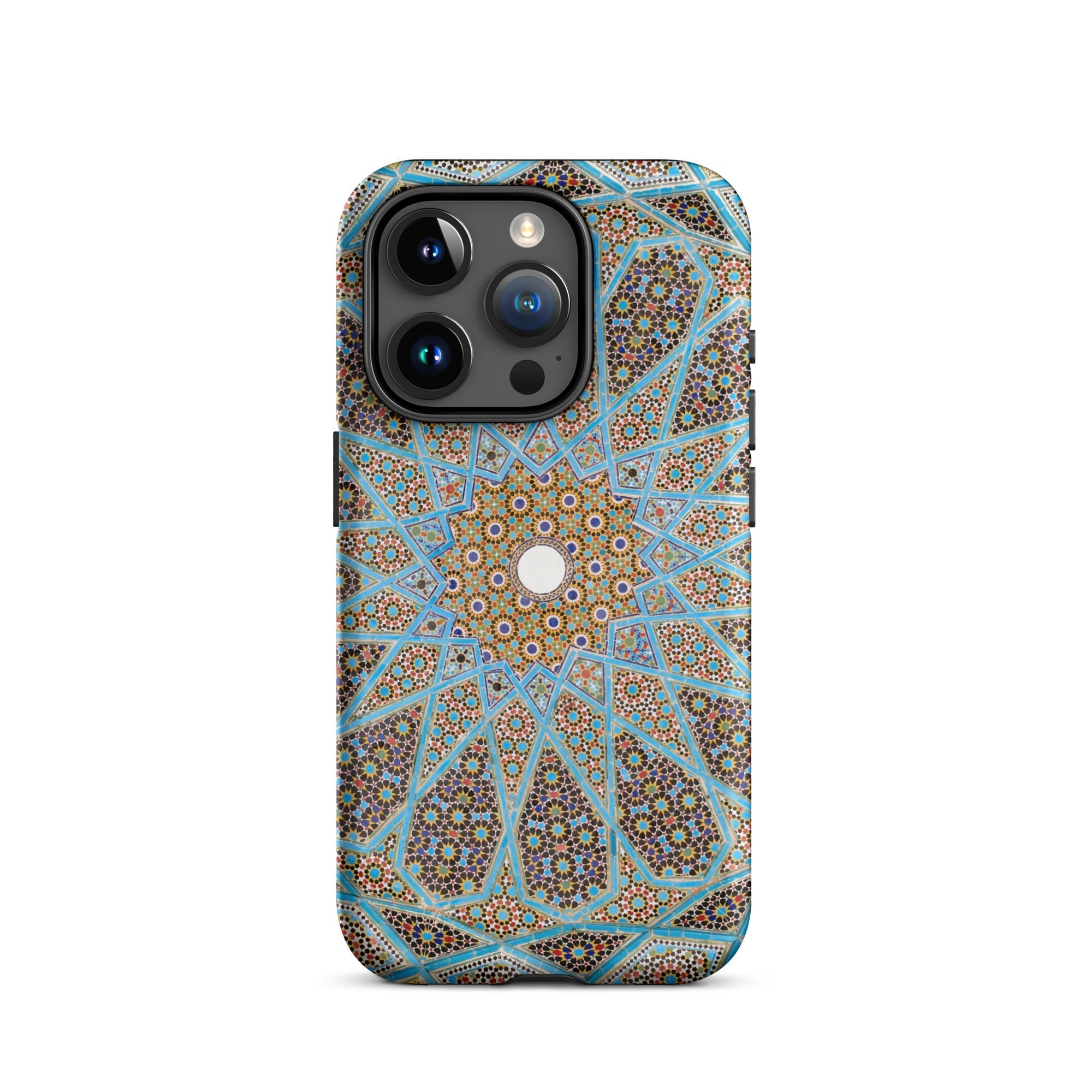 Una cúpula de versos, congelada en vuelo. Esta funda de iPhone lleva la bóveda del cielo de Shiraz: el techo de mosaico sobre la tumba de mármol de Hafez, donde la geometría y la devoción forman una sola gramática luminosa. De doce rayos como un sol de alfabetos olvidados, el patrón se inspira en el enrejado girih y las muqarnas persas, haciendo eco de las propias metáforas recursivas del poeta: mundos anidados dentro de suspiros.