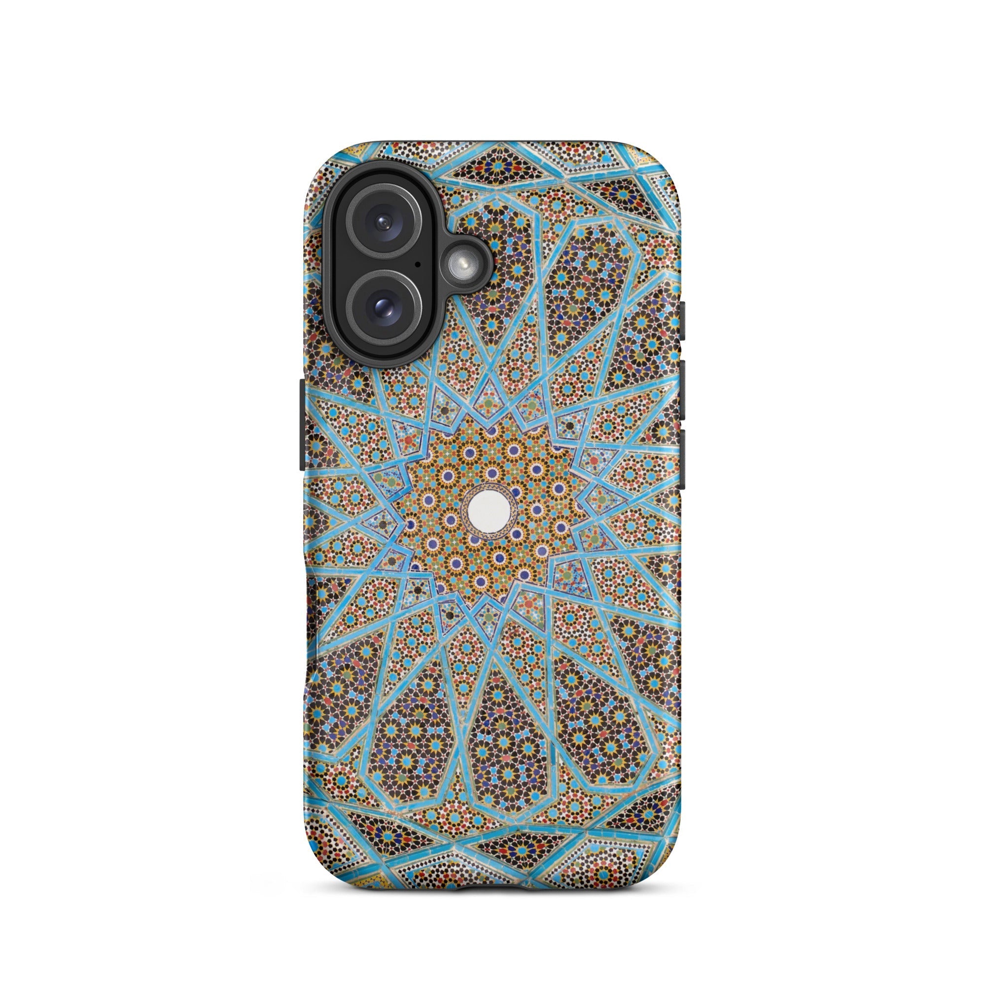 Cada teselación es un aliento sostenido por la historia: venas turquesa esmaltadas, estrellas de color ámbar, intersticios oscuros como la tinta. Un relicario digital de ornamento arquitectónico islámico, cosmología sufí y la infraestructura poética de la Edad de Oro persa: esto no es una funda, es una constelación en tu palma.